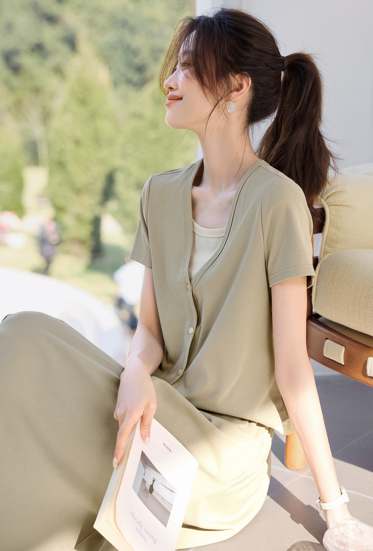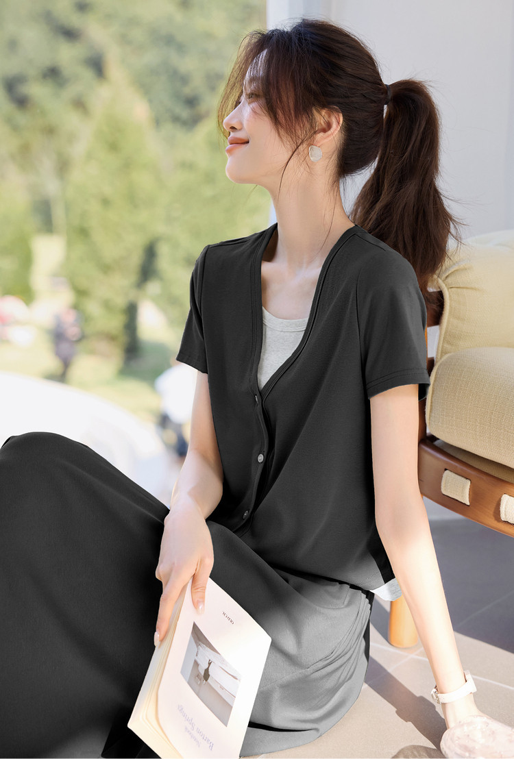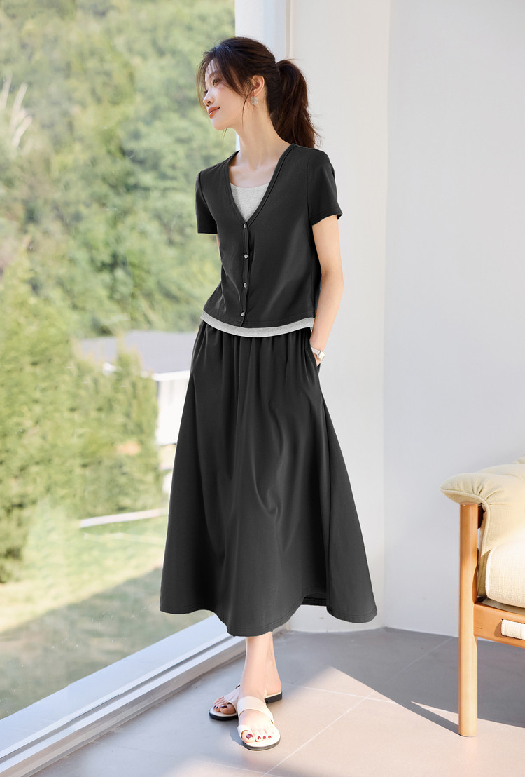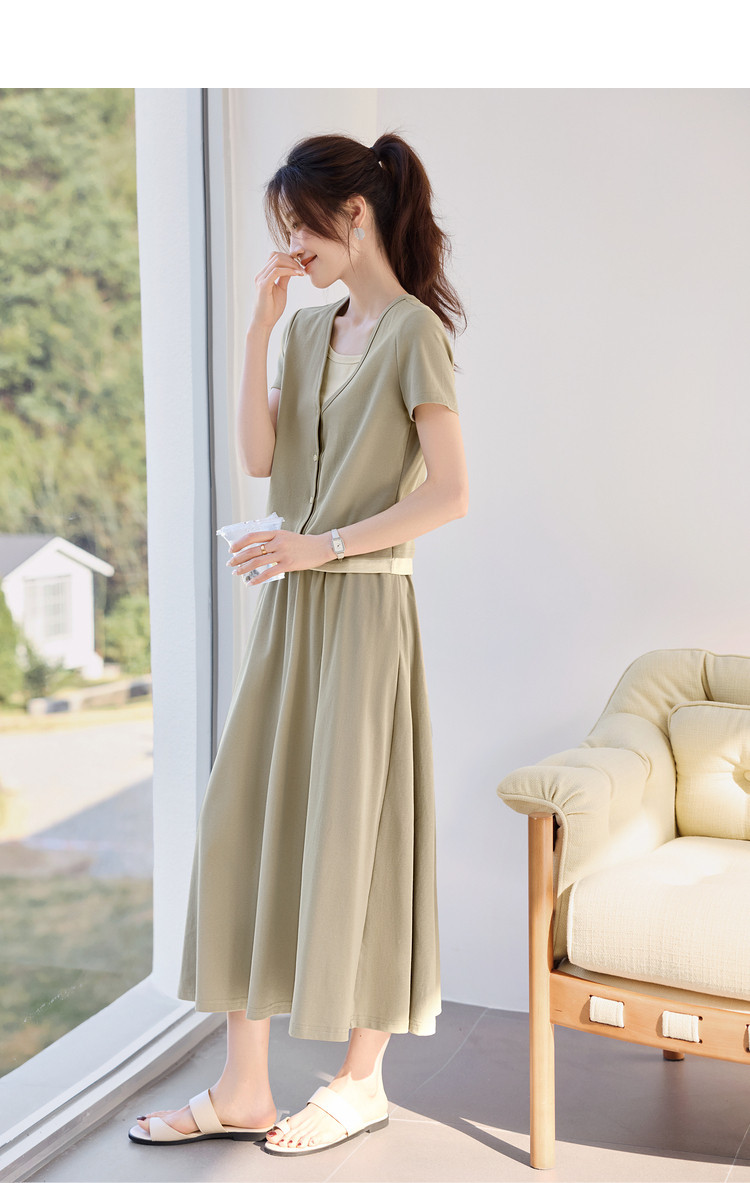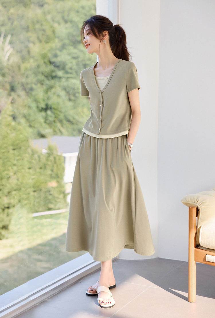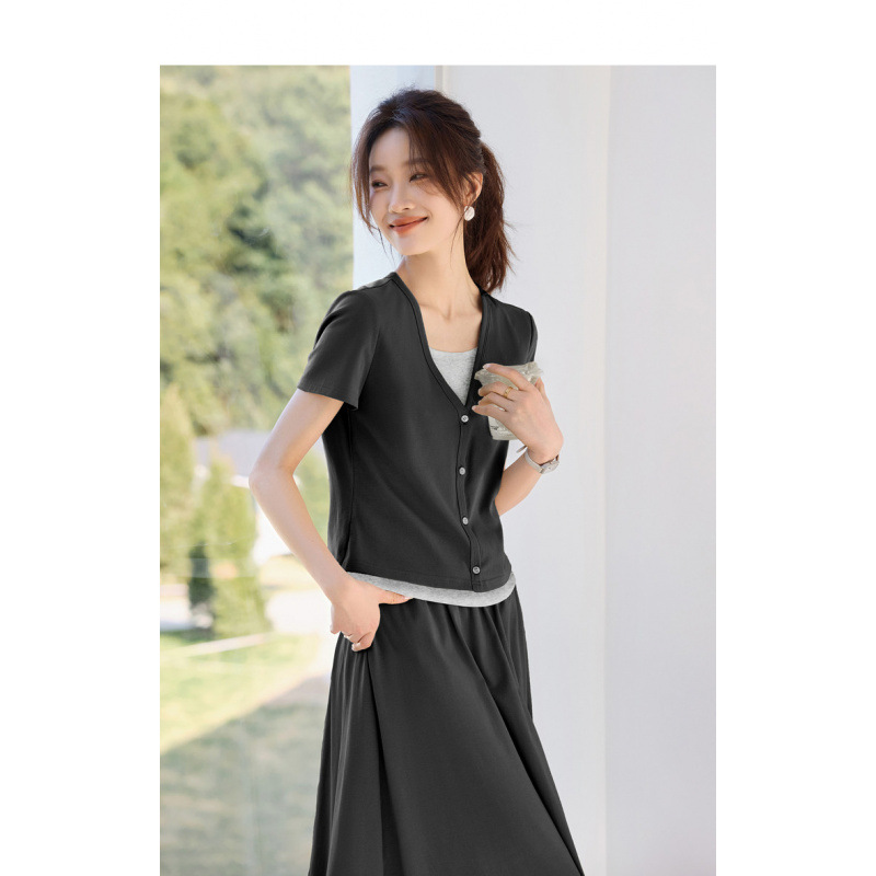 대비 컬러 가짜 투피스 캐주얼 티셔츠 스커트 세트 2025 여름 디자인 센스 여성 세트