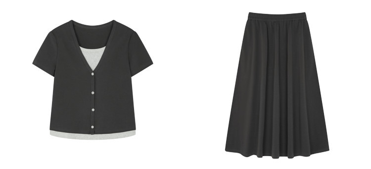 대비 컬러 가짜 투피스 캐주얼 티셔츠 스커트 세트 2025 여름 디자인 센스 여성 세트스토어 가기