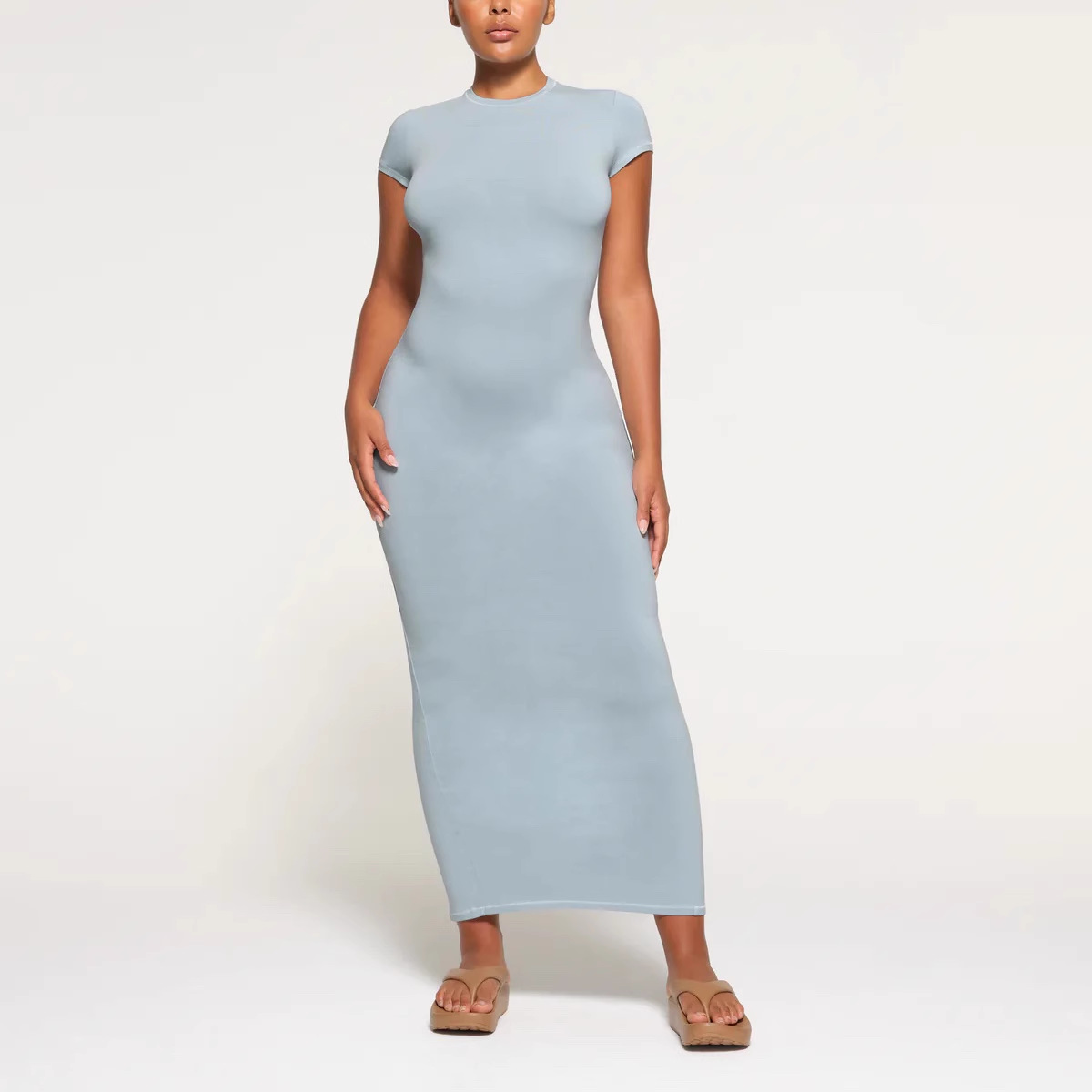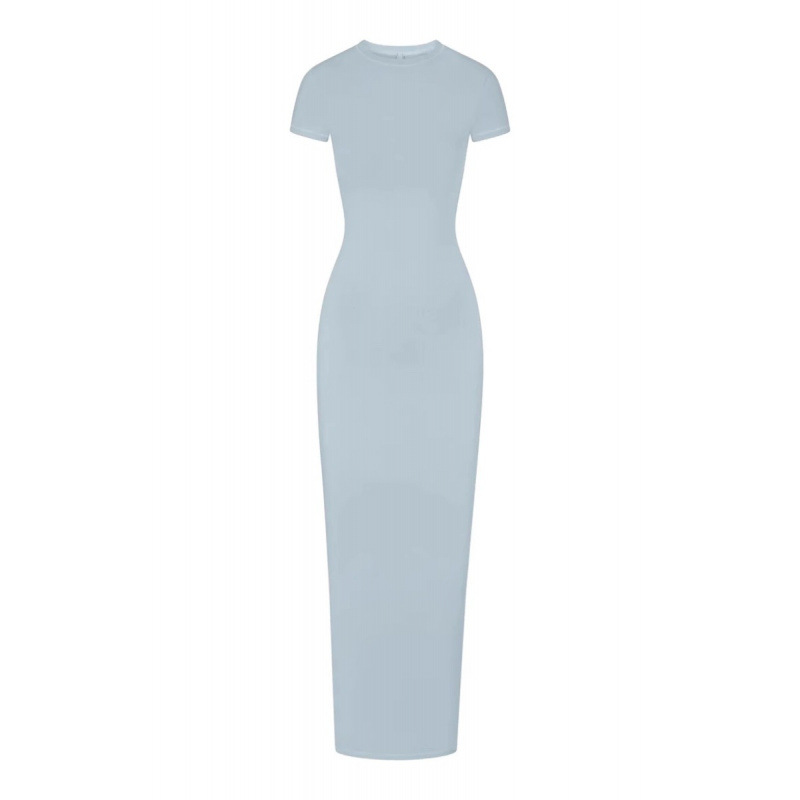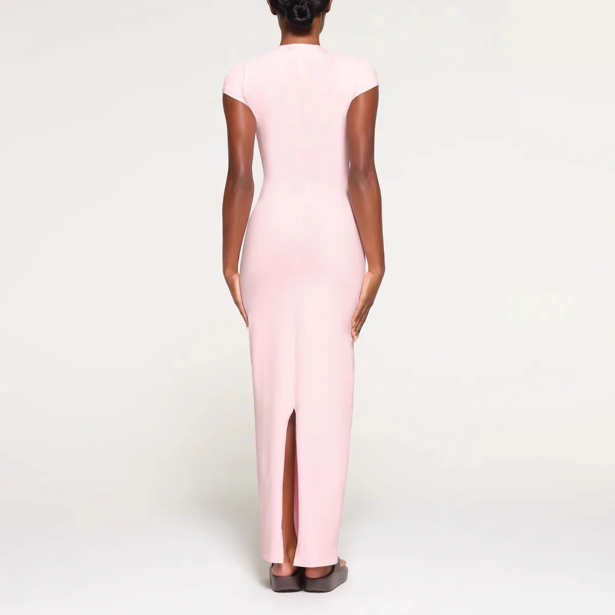 SKIMS Kardashian 새로운 빈티지 긴 원피스 분할 스레드 엉덩이 원피스 짧은 소매 긴 원피스