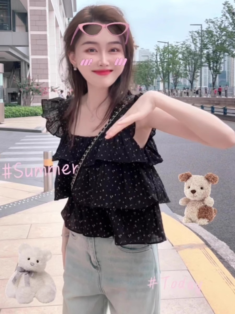 프랑스 스타일 스위트 웨이브 닷 작은 플라잉 슬리브 셔츠 여성의 여름 디자인 센스 에이지 감소 스퀘어 칼라 쉬폰 인형 셔츠 쇼트 탑