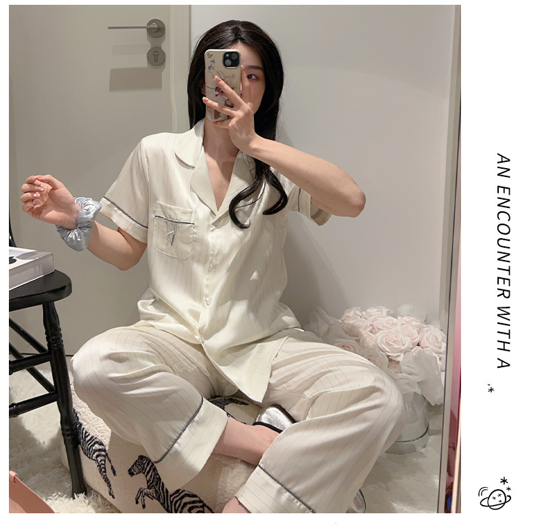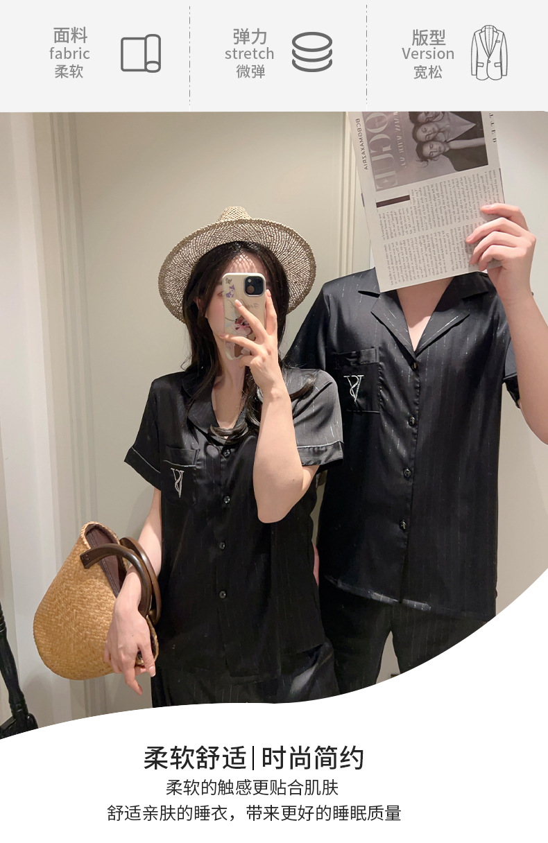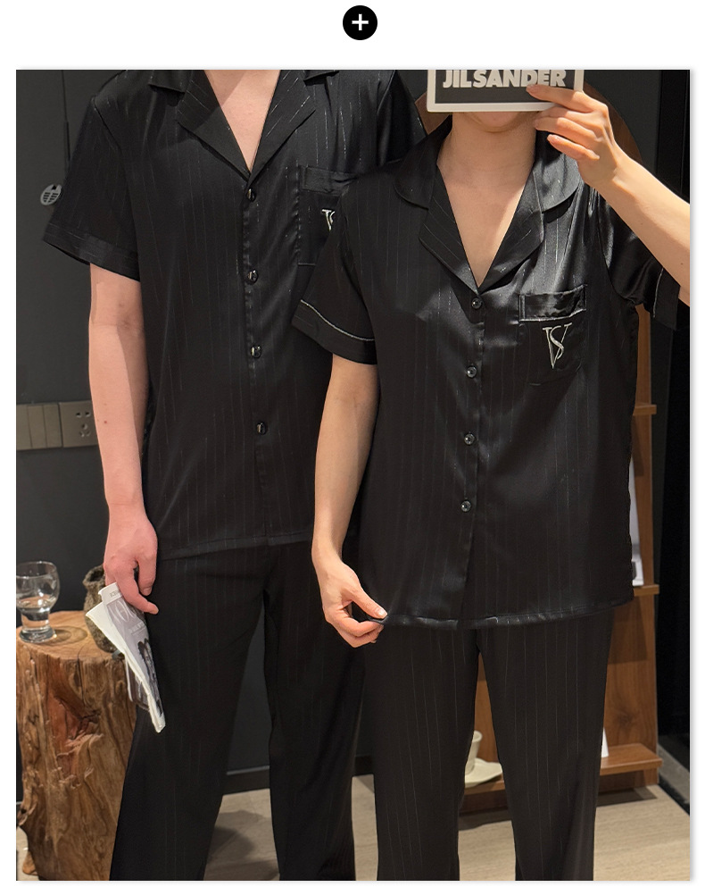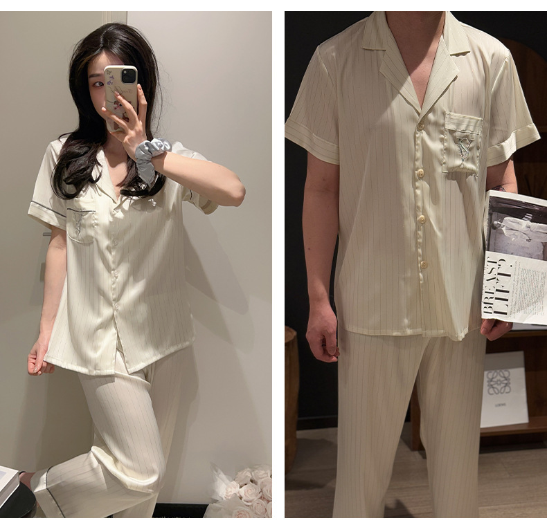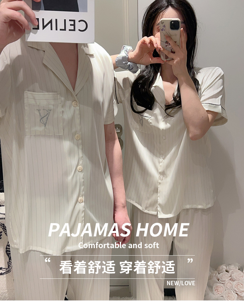 커플 아이스 실크 잠옷 봄과 여름 남성과 여성의 가볍고 통기성이 뛰어난 반팔 바지 자수는 집 밖에서 입을 수 있습니다 도매스토어 가기