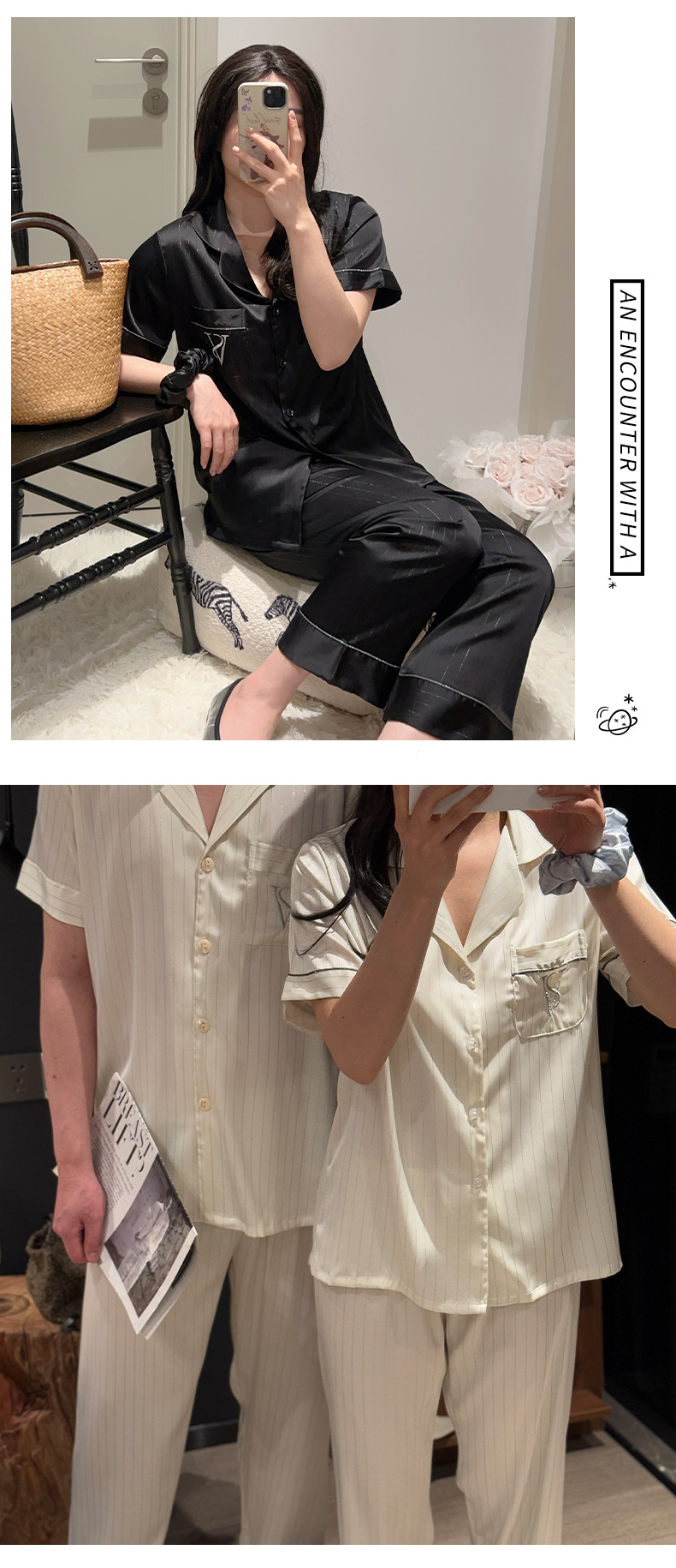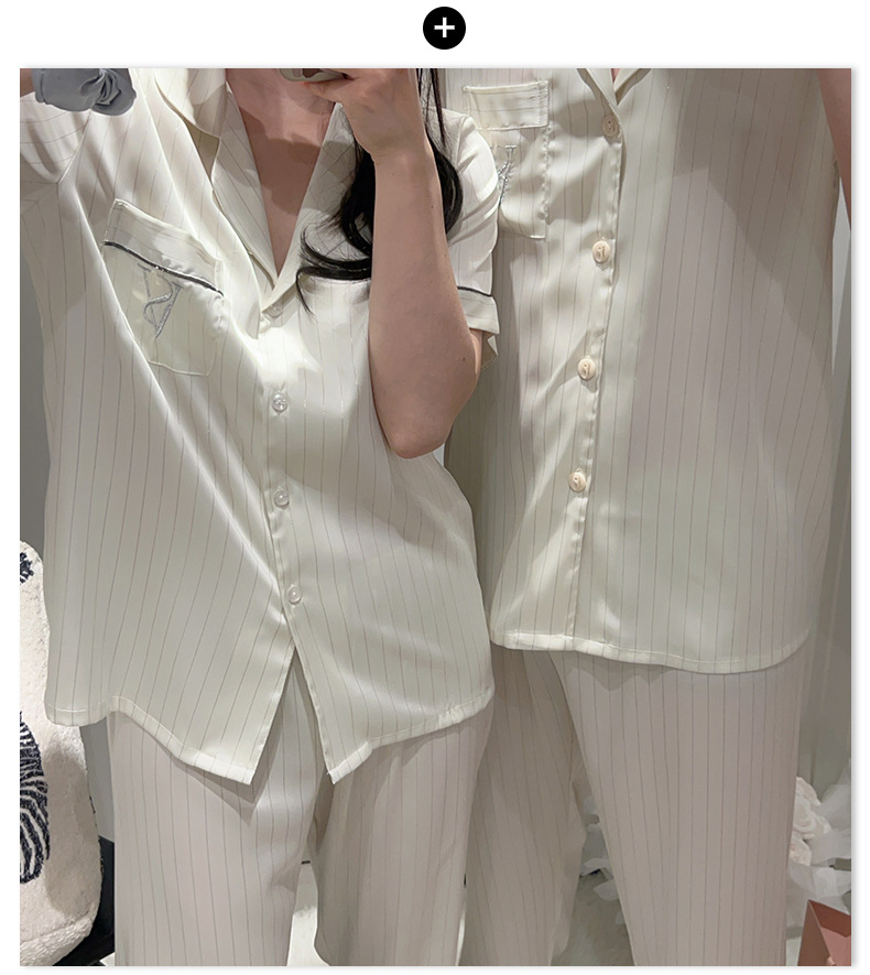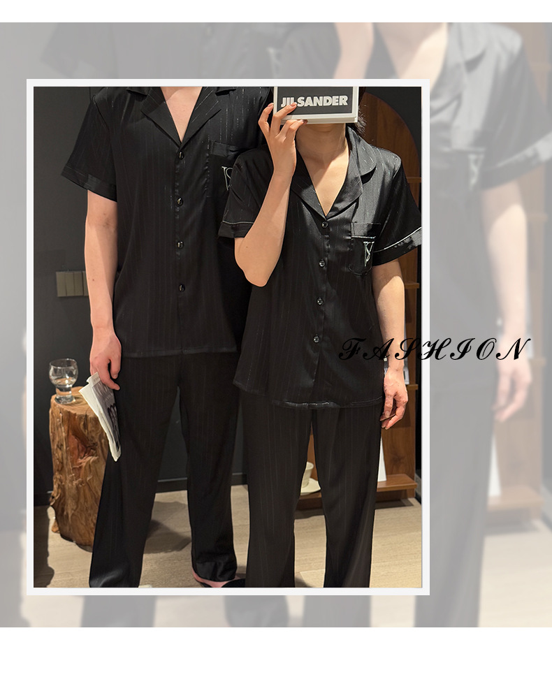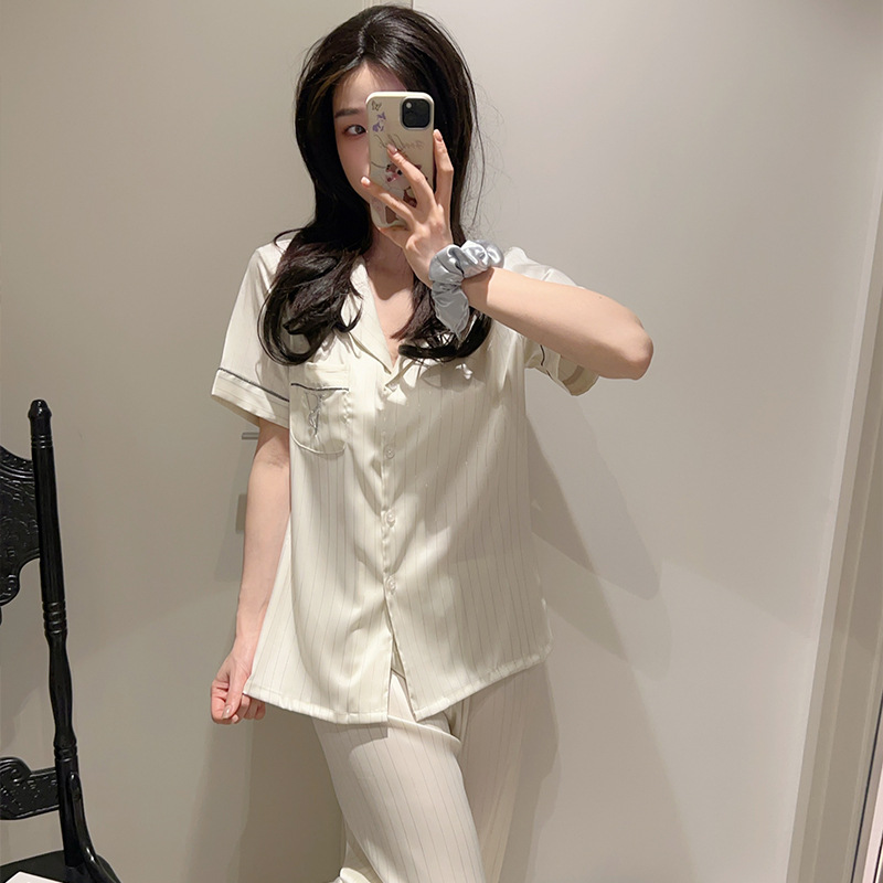 커플 아이스 실크 잠옷 봄과 여름 남성과 여성의 가볍고 통기성이 뛰어난 반팔 바지 자수는 집 밖에서 입을 수 있습니다 도매스토어 가기