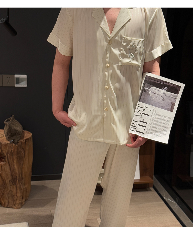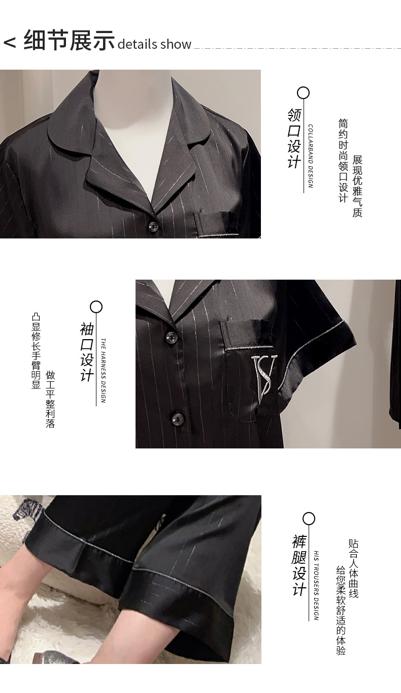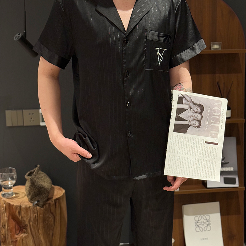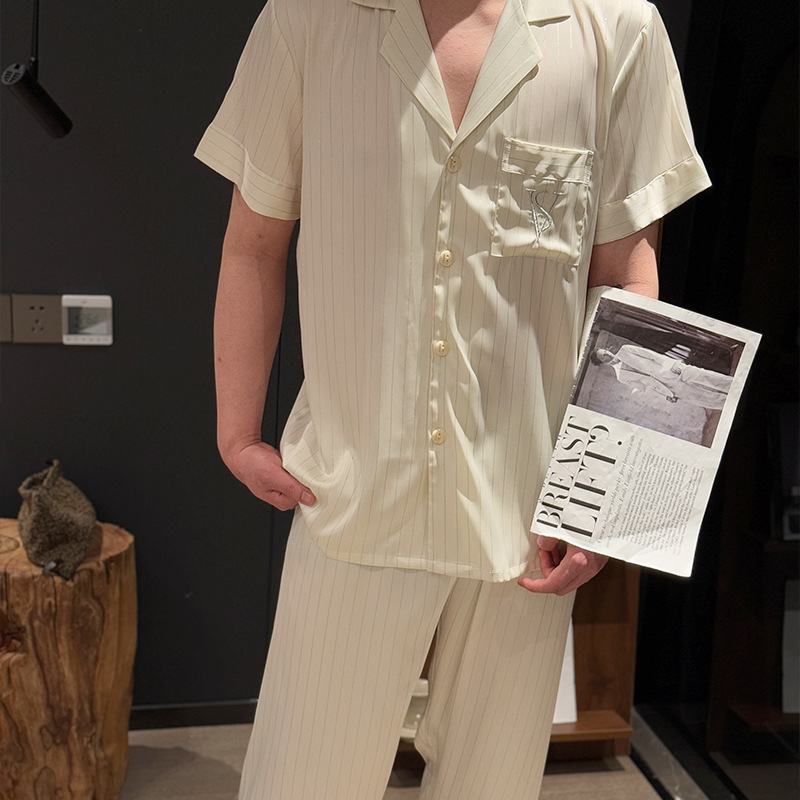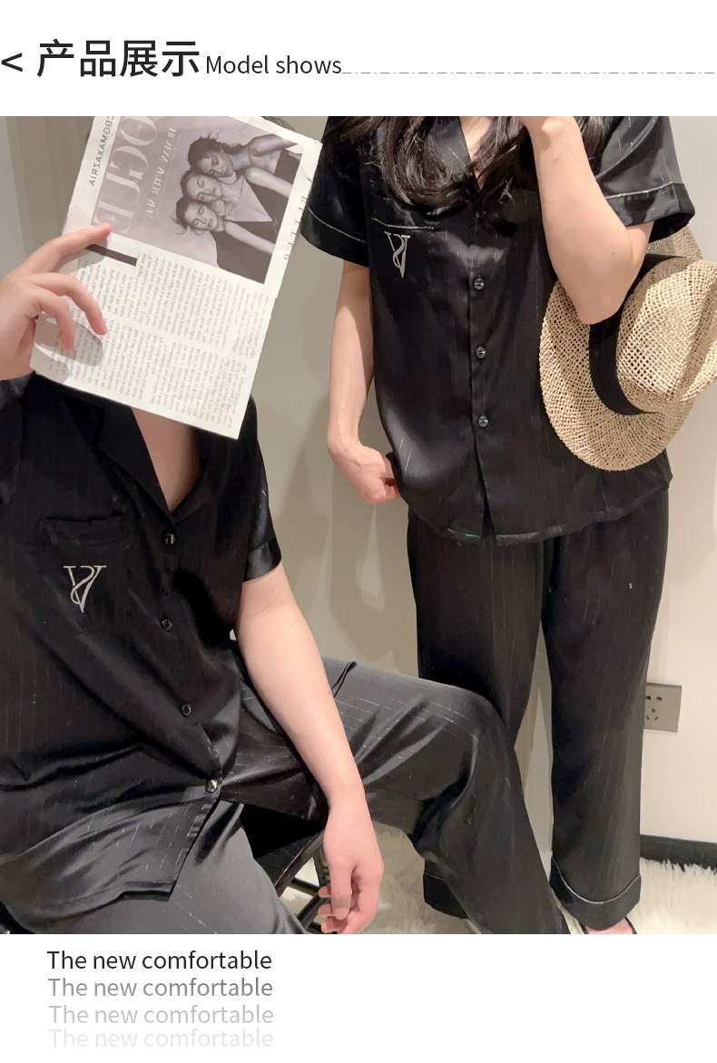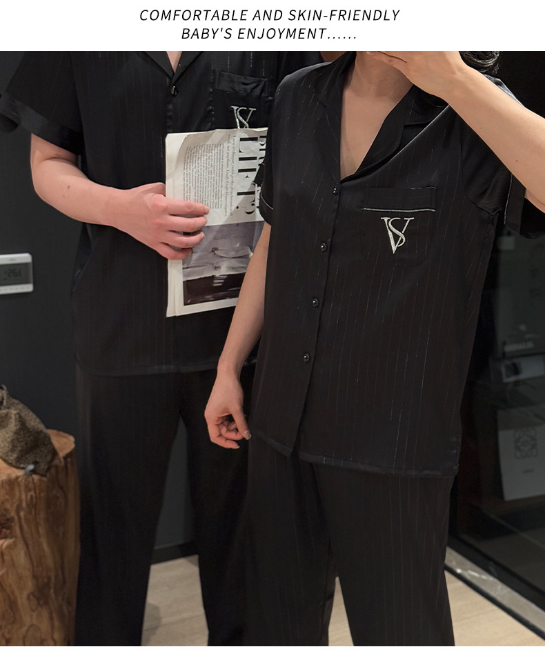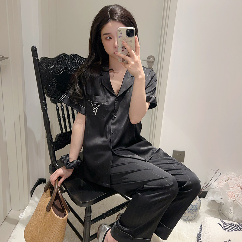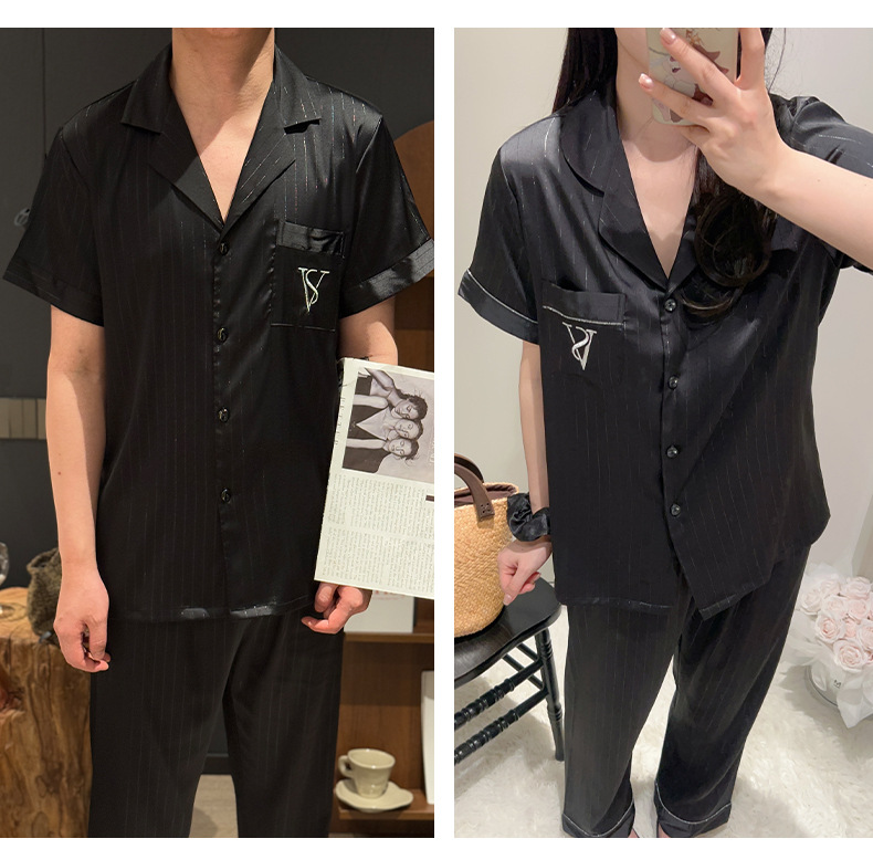 커플 아이스 실크 잠옷 봄과 여름 남성과 여성의 가볍고 통기성이 뛰어난 반팔 바지 자수는 집 밖에서 입을 수 있습니다 도매