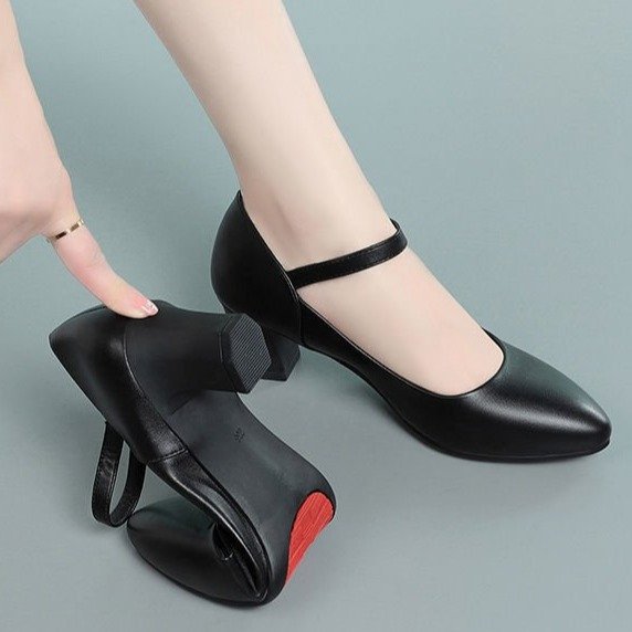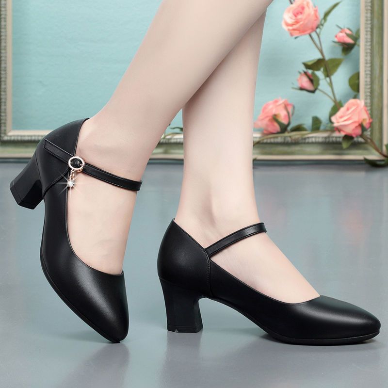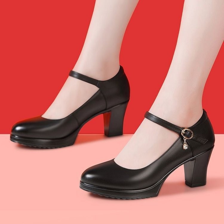 중노년 어머니를 위한 원버튼 두꺼운 굽 하이힐, 여성용 봄 치파오 두꺼운 굽 싱글 슈즈, 캣워크 슈즈, 여성용 가죽 슈즈스토어 가기
