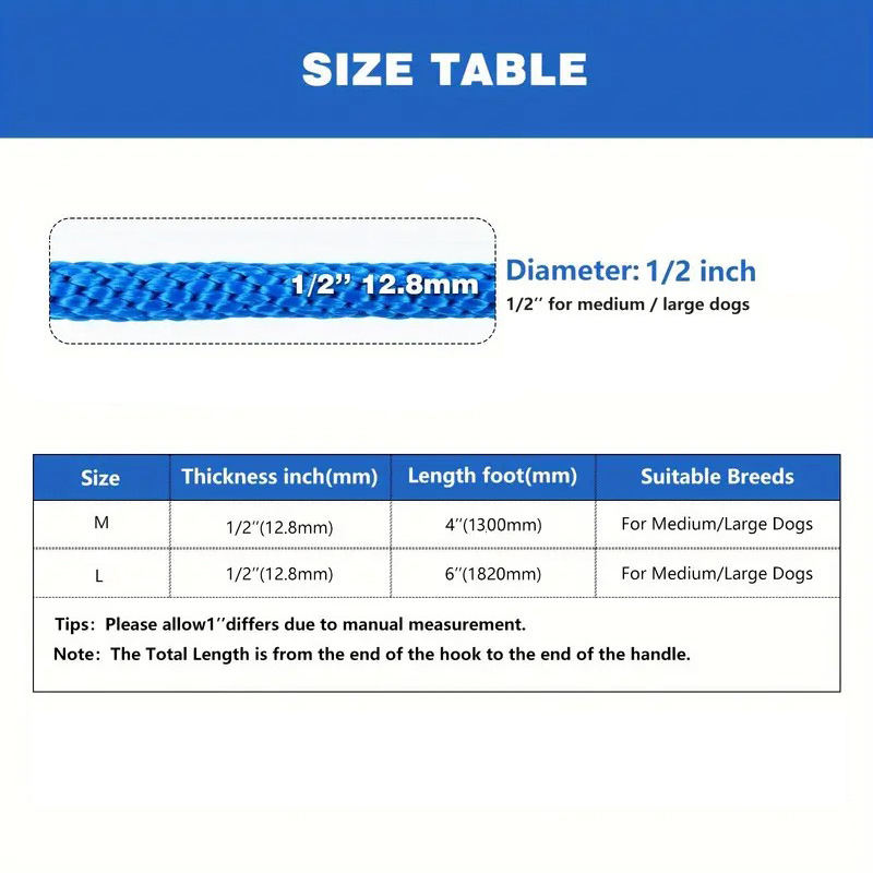 M:长度:6英尺/185cm/73英寸,绳宽:12.8毫米/1/2英寸(适用于中型和大型狗)