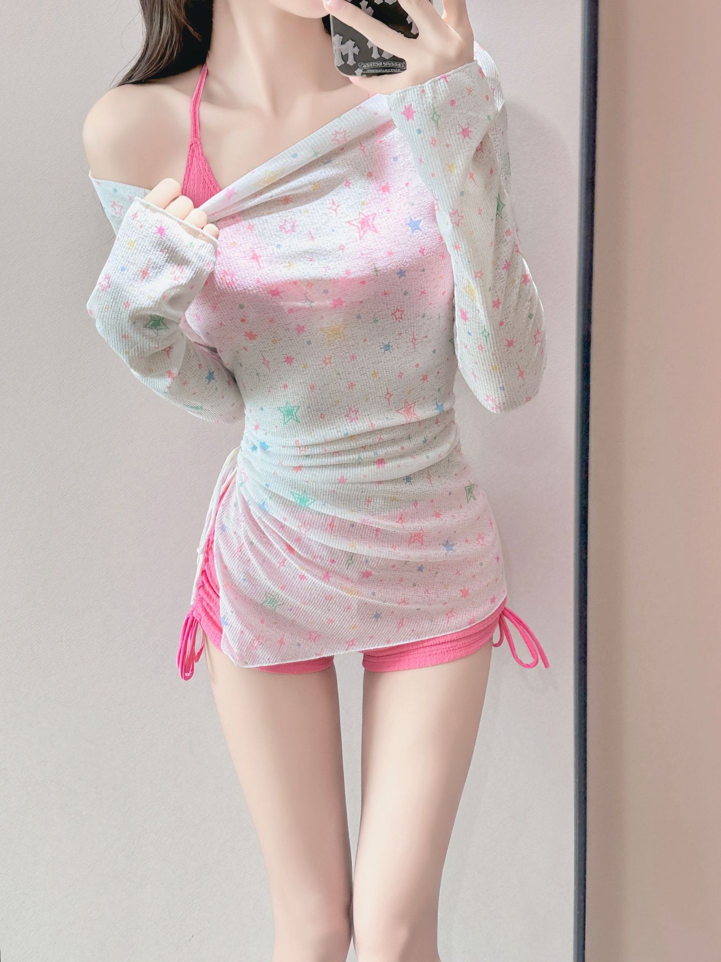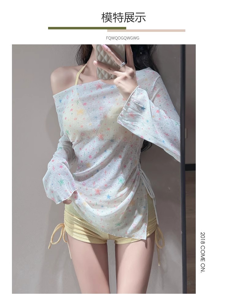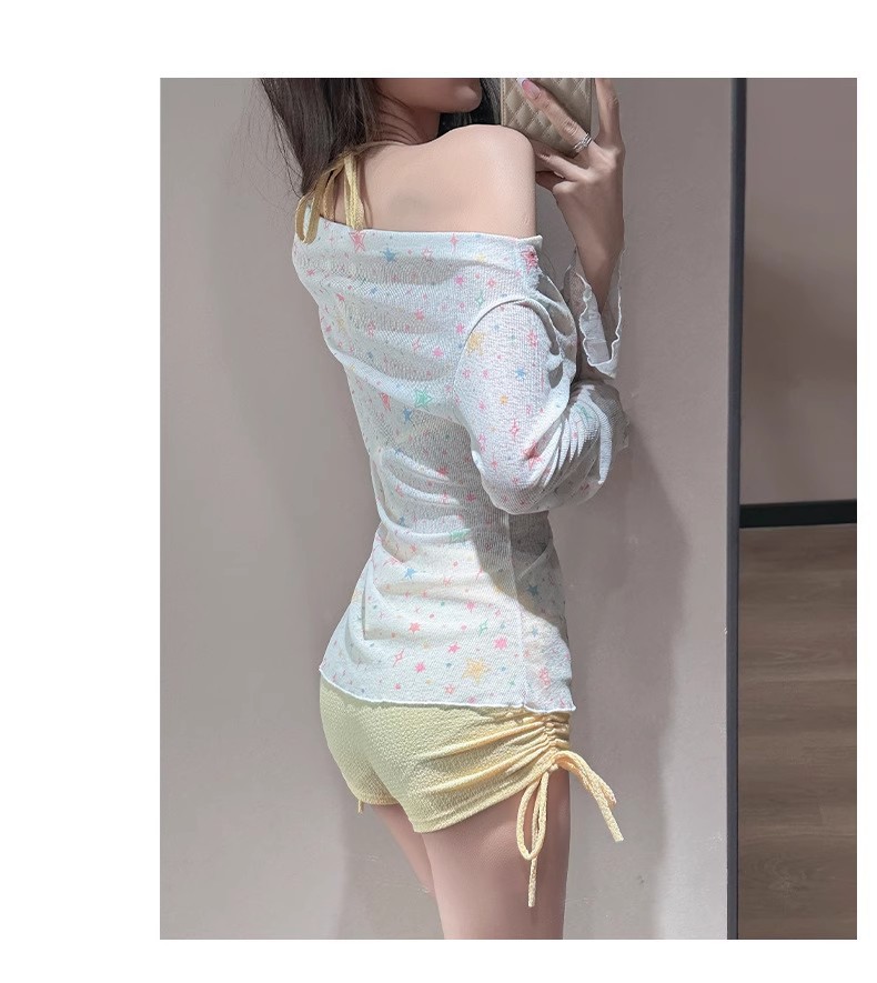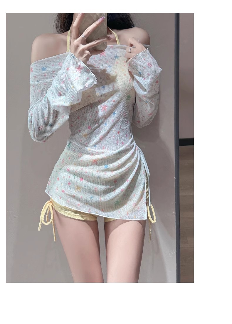 해변 휴가를 즐기는 여성을 위한 스플릿 수영복, 고급 긴팔 자외선 차단 3피스 세트, 섹시한 순수한 욕망 복서 온천 수영복