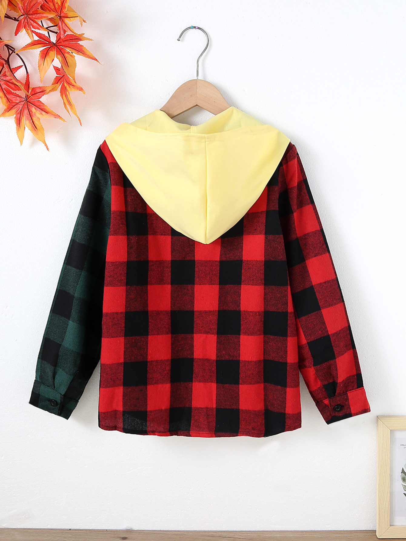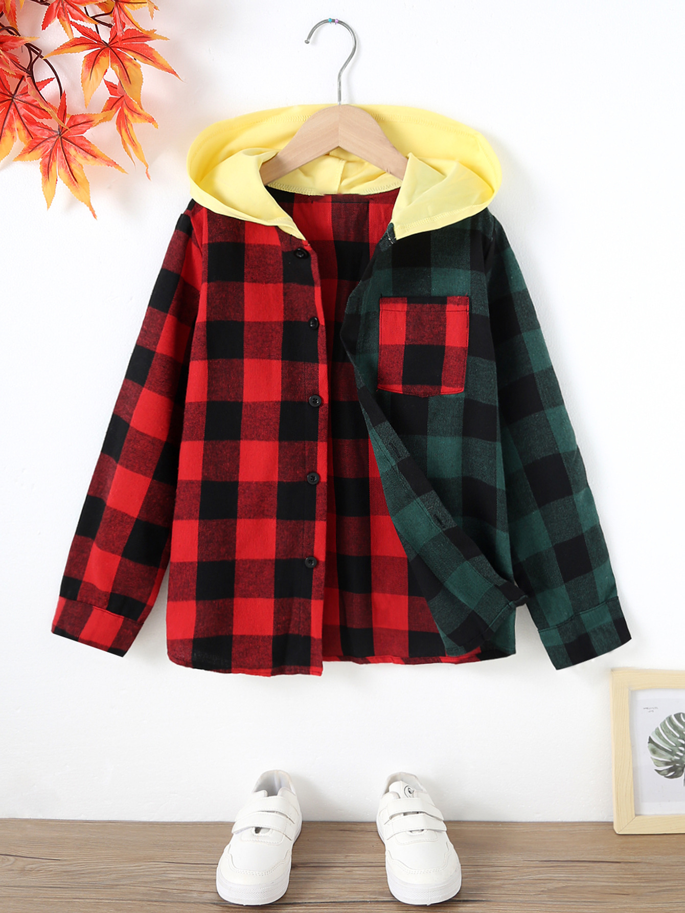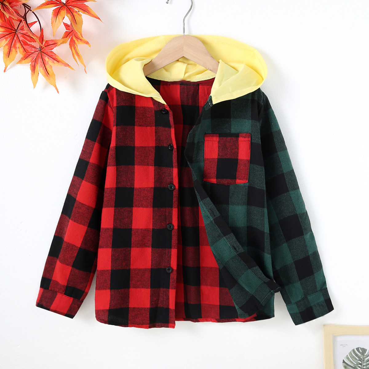 대형 격자 무늬 포켓 장식이있는 대형 소년을위한 대외 무역 새로운 가을 후드 셔츠 캐주얼 후드 컬러 블록 격자 무늬 셔츠