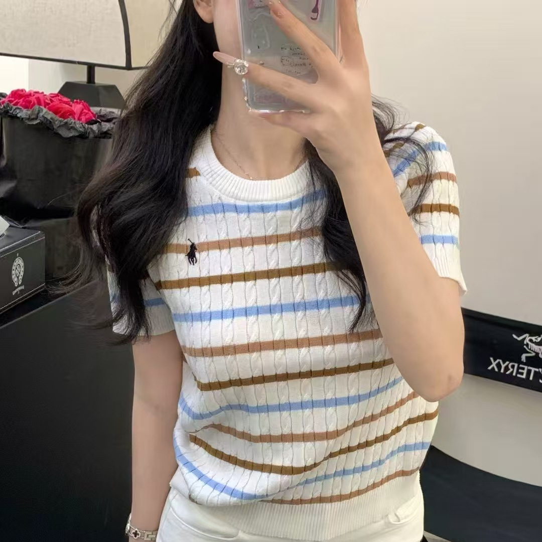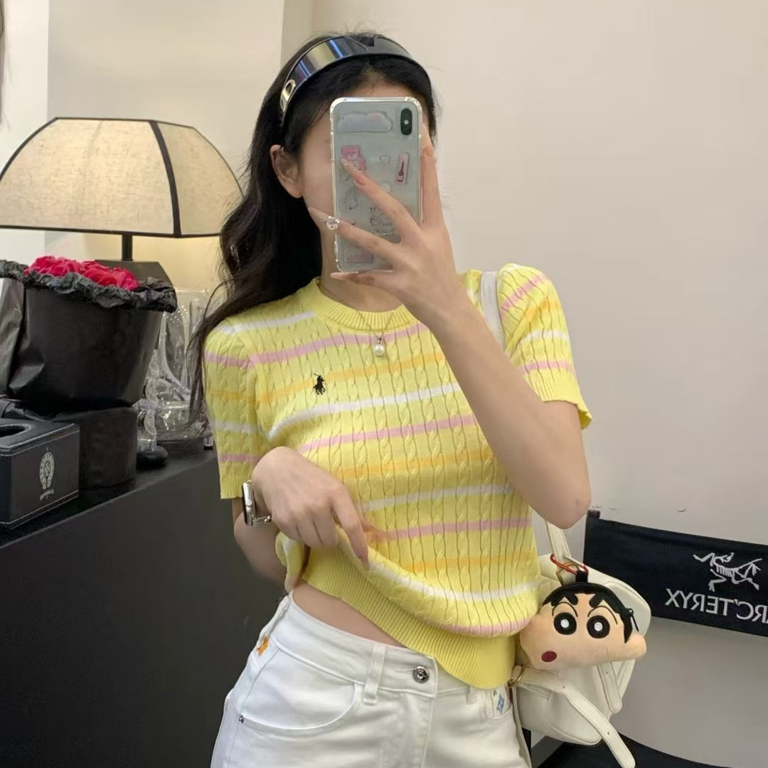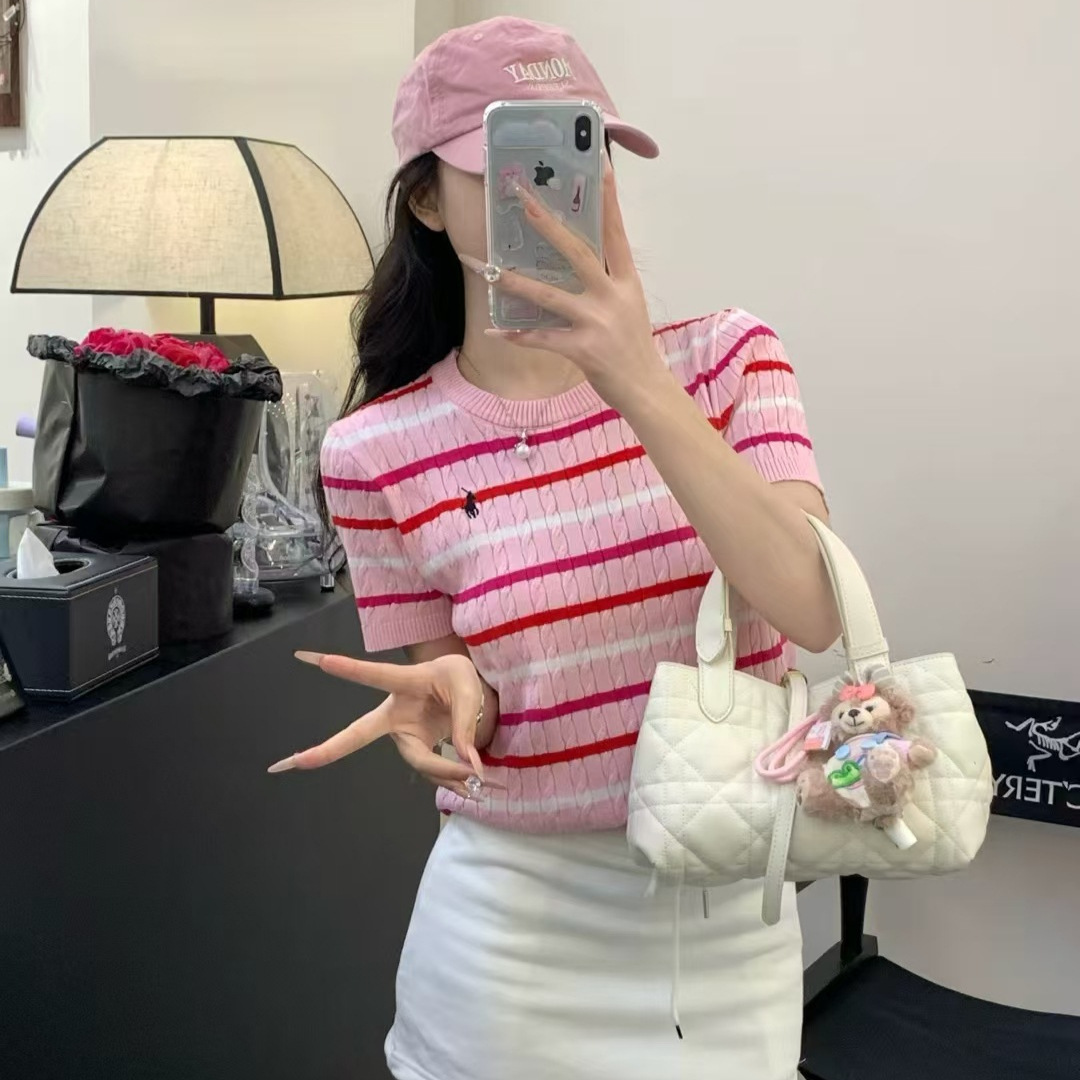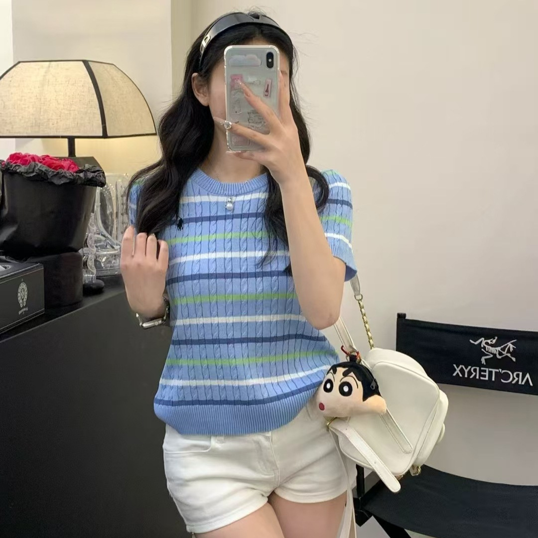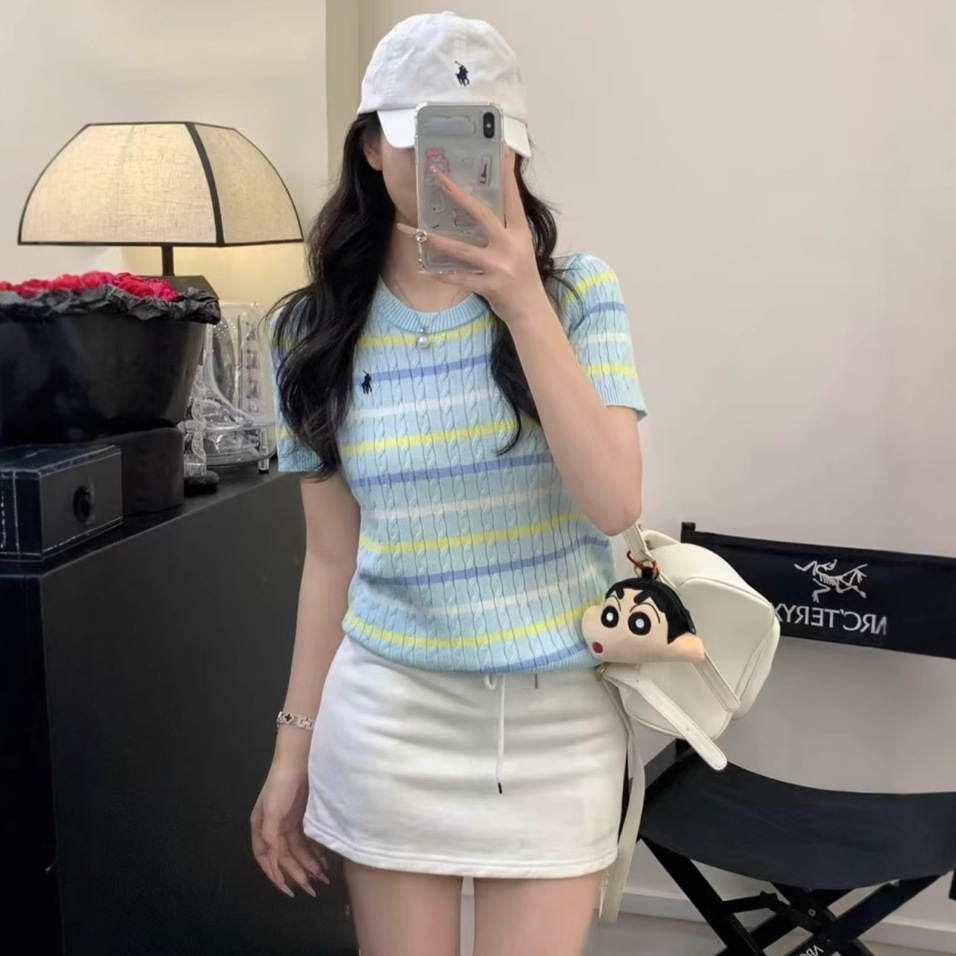 Xiaoxiangfeng 자수 스트라이프 트위스트 대비 색상 반팔 틈새 독특한 라운드 넥 오른쪽 어깨 Dalang 스웨터 루즈 여성용스토어 가기