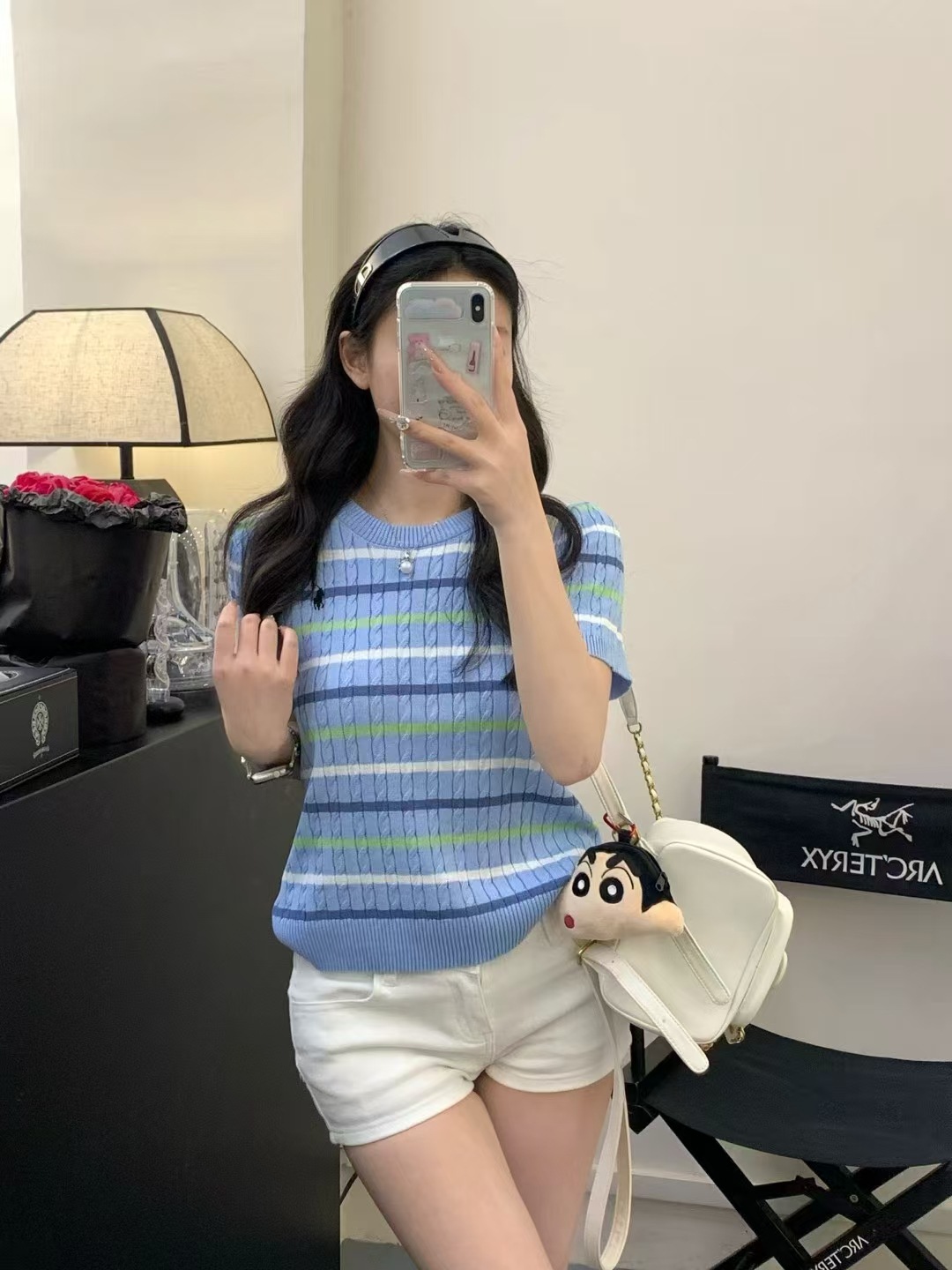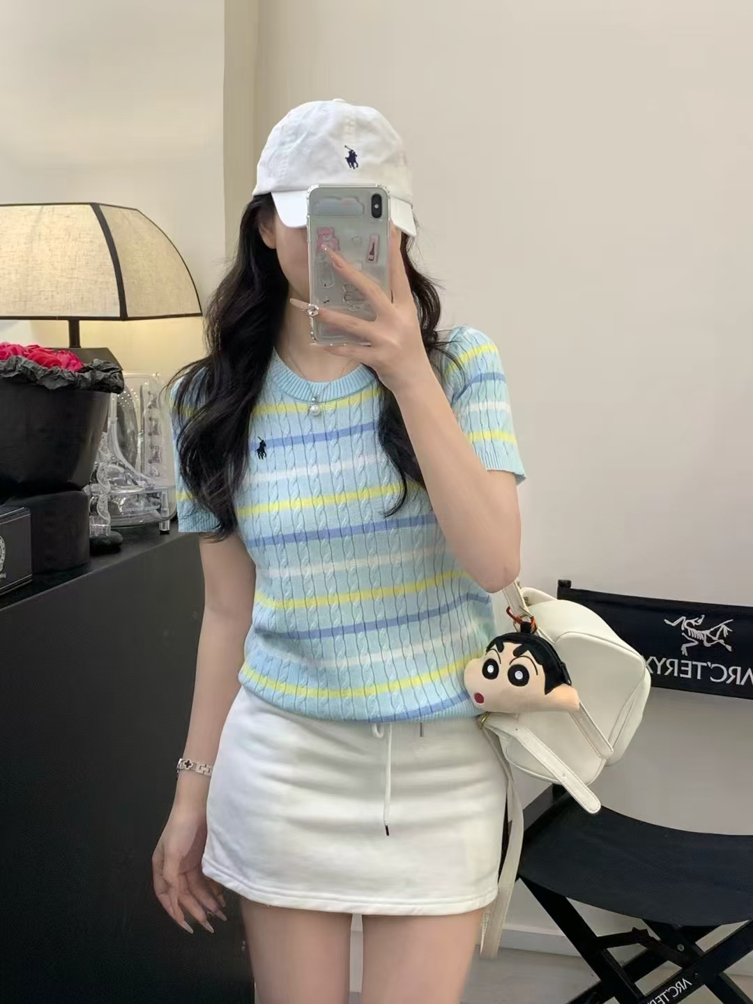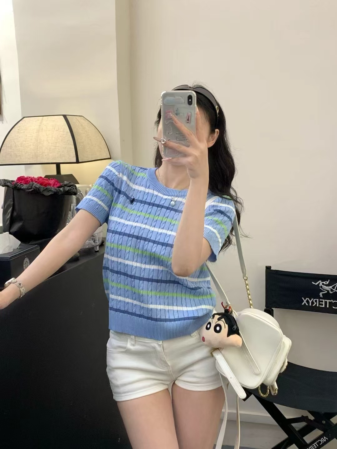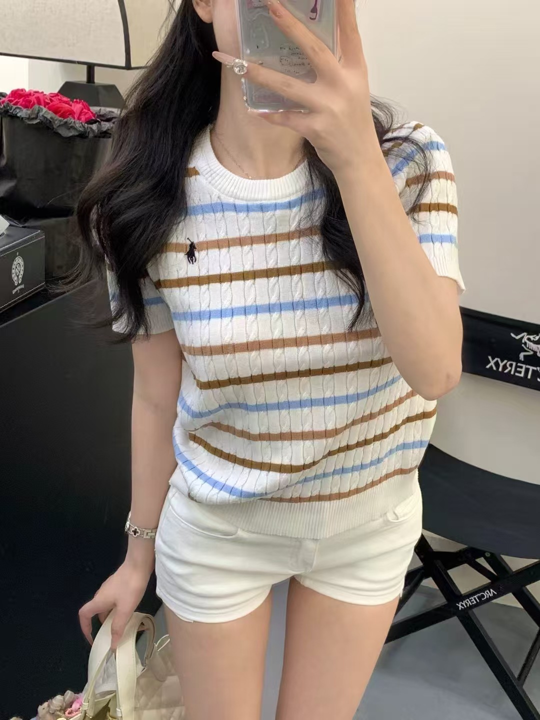 Xiaoxiangfeng 자수 스트라이프 트위스트 대비 색상 반팔 틈새 독특한 라운드 넥 오른쪽 어깨 Dalang 스웨터 루즈 여성용스토어 가기