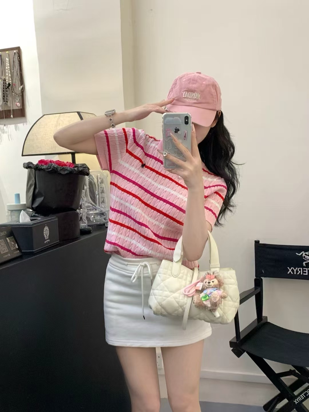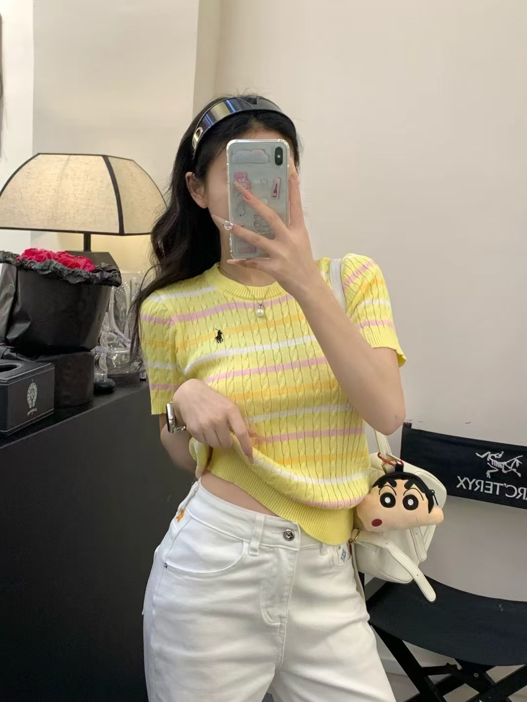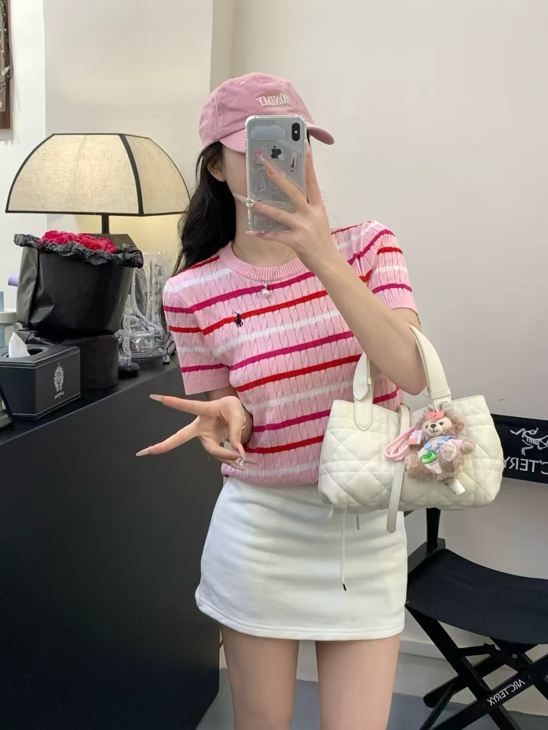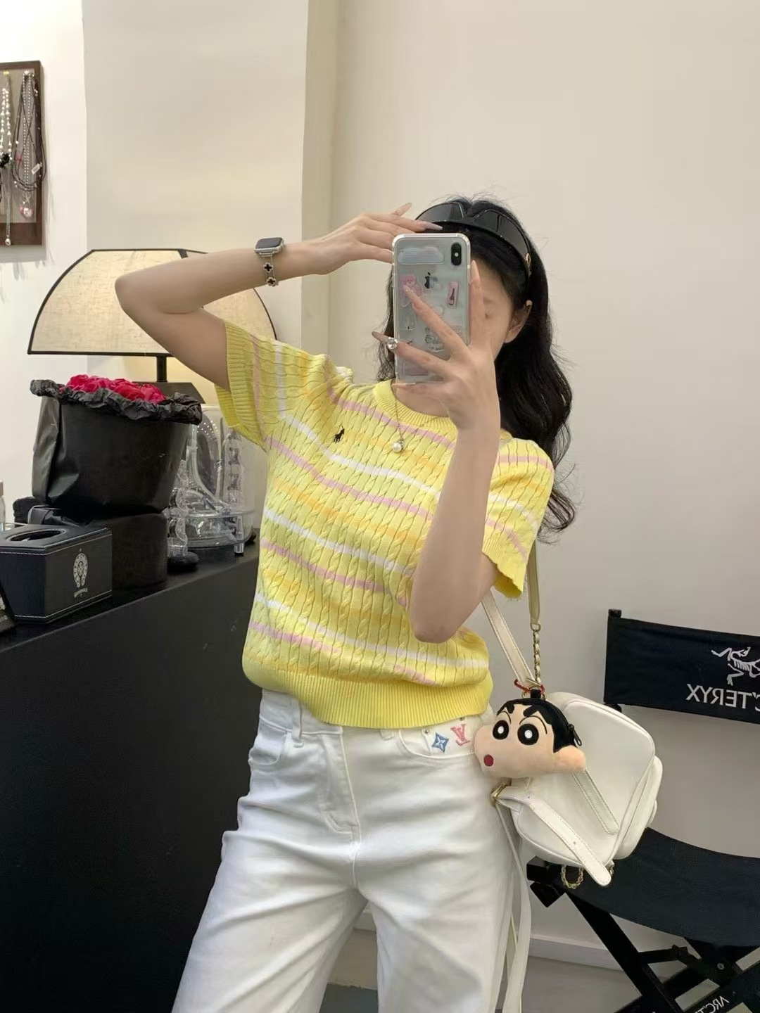 Xiaoxiangfeng 자수 스트라이프 트위스트 대비 색상 반팔 틈새 독특한 라운드 넥 오른쪽 어깨 Dalang 스웨터 루즈 여성용스토어 가기