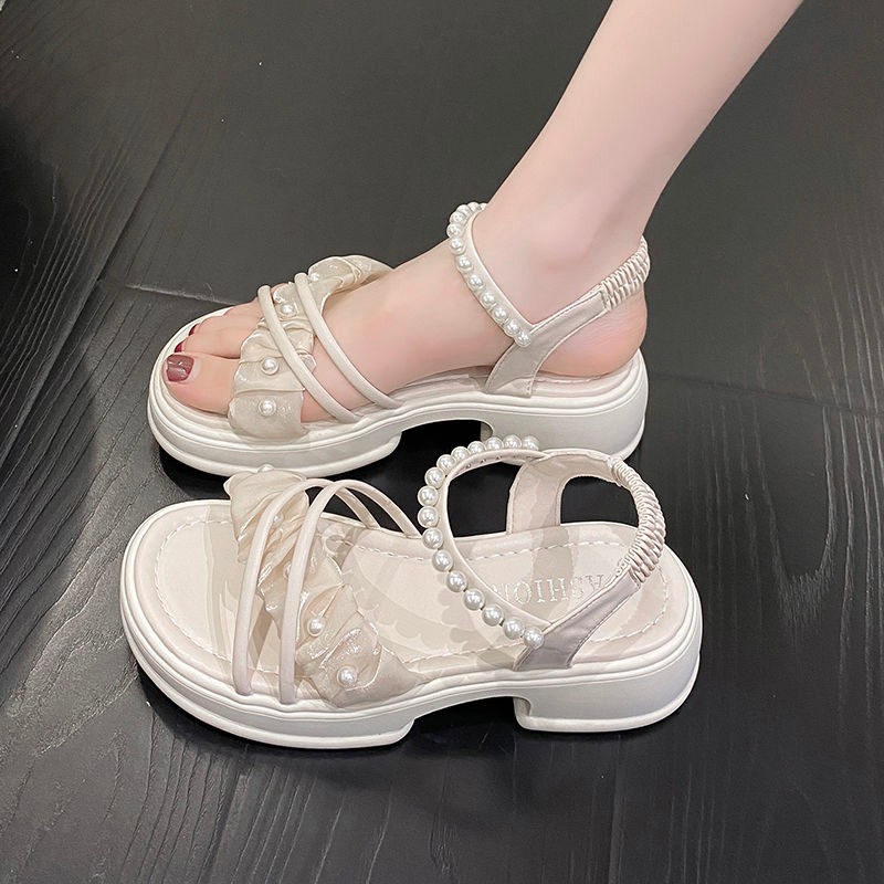 여름 2025 여성을 위한 진주 요정 스타일 두꺼운 밑창 샌들 새로운 스타일 작은 사람들을 위한 다용도 패션 비치 샌들