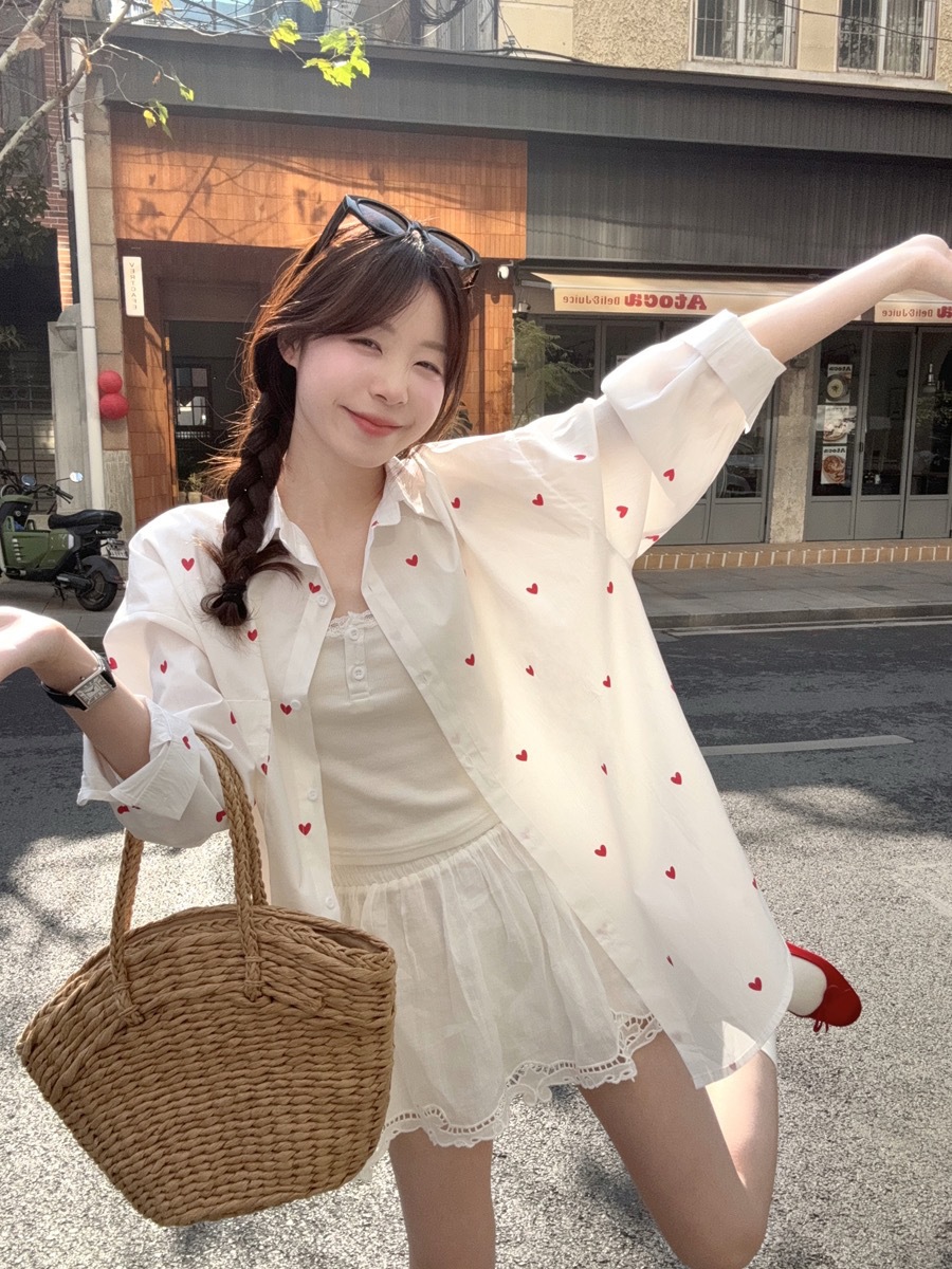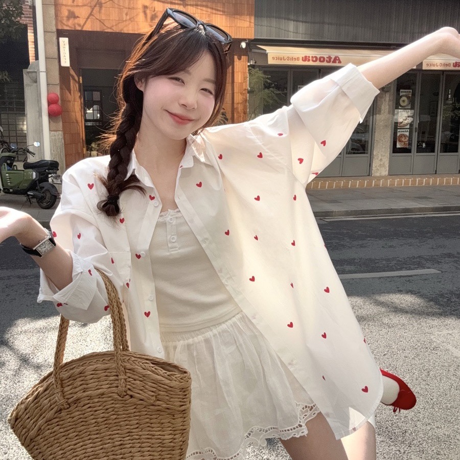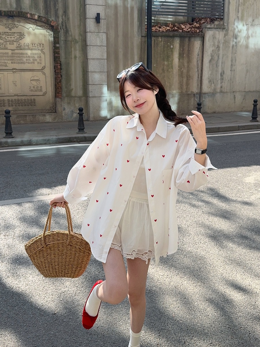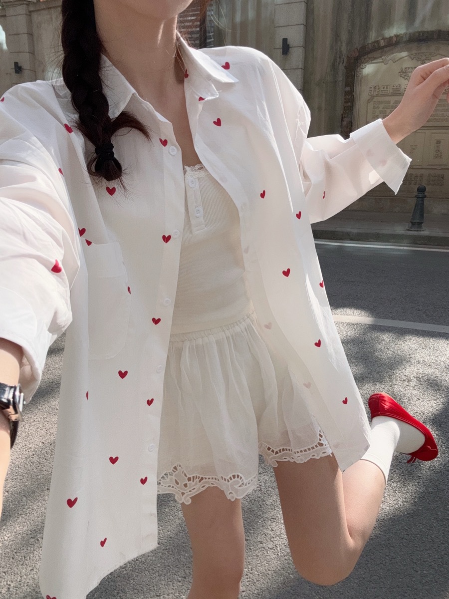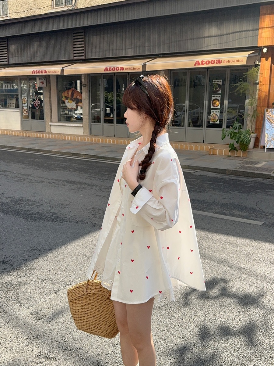 한국 스타일 디자인 사랑 인쇄 된 선 스크린 긴 소매 셔츠 여성의 봄과 여름 느슨한 올매치 틈새 셔츠 화이트 탑