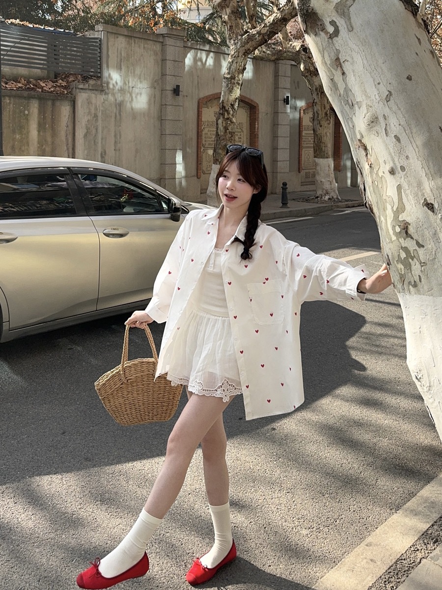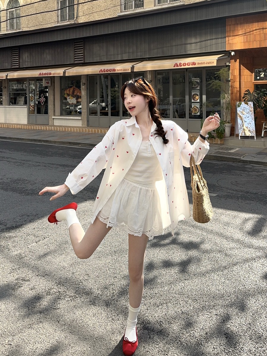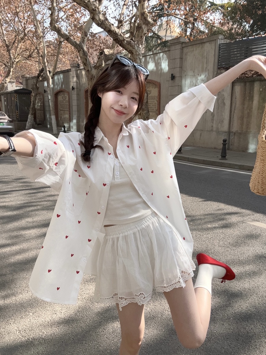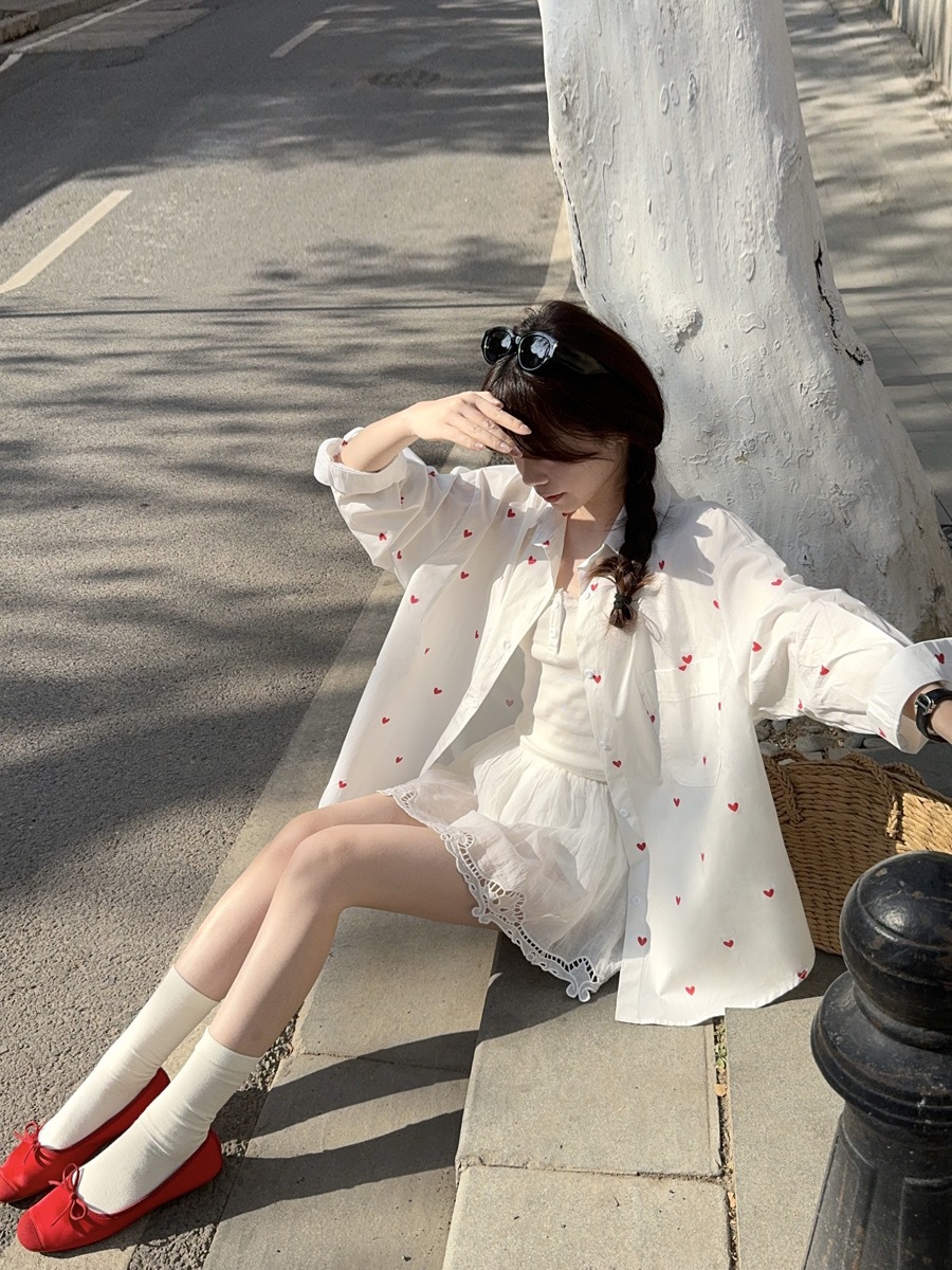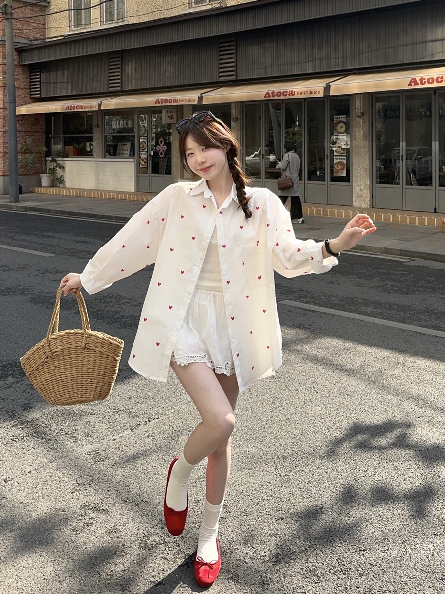 한국 스타일 디자인 사랑 인쇄 된 선 스크린 긴 소매 셔츠 여성의 봄과 여름 느슨한 올매치 틈새 셔츠 화이트 탑