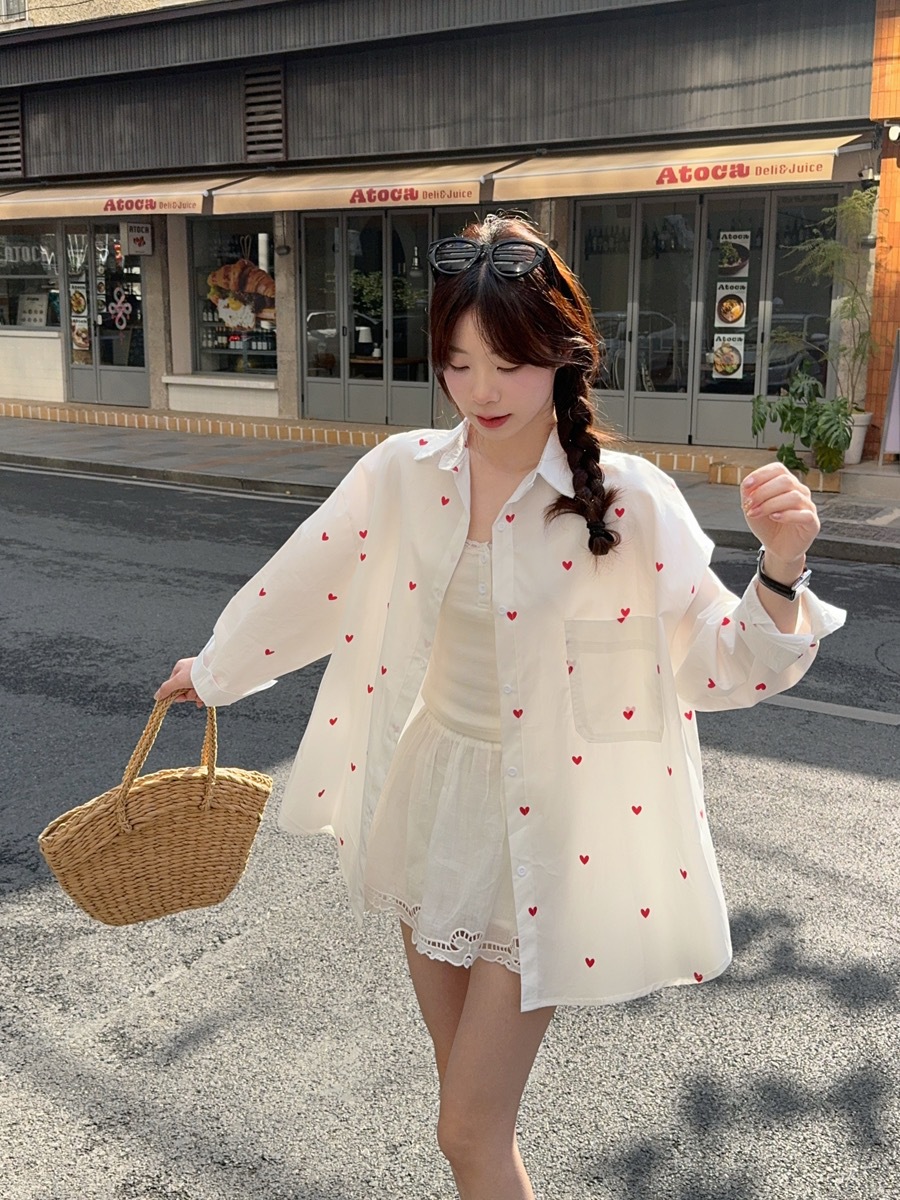 한국 스타일 디자인 사랑 인쇄 된 선 스크린 긴 소매 셔츠 여성의 봄과 여름 느슨한 올매치 틈새 셔츠 화이트 탑스토어 가기
