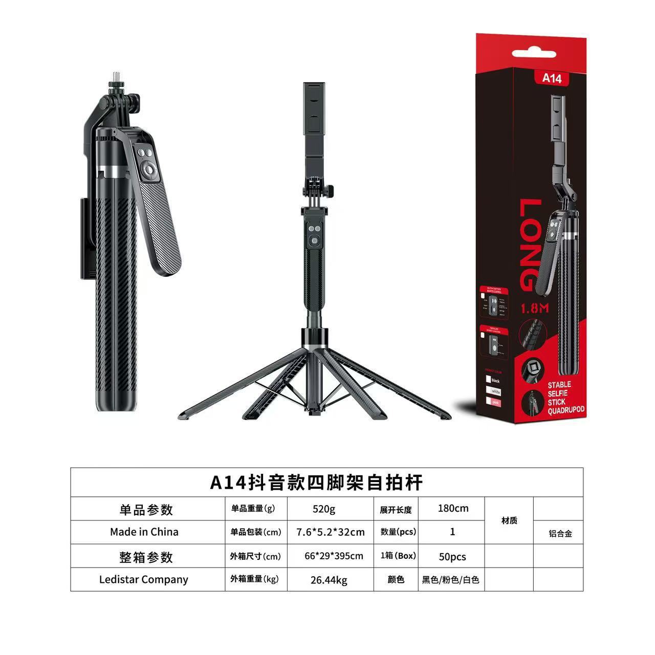 • A14 블랙 [알루미늄 합금 셀카봉 1.8m개 + 충전 기능 Douyin 블루투스 리모컨 + 듀얼 헤드라이트]