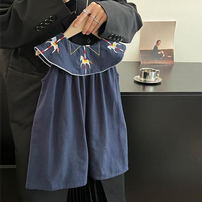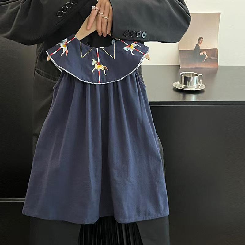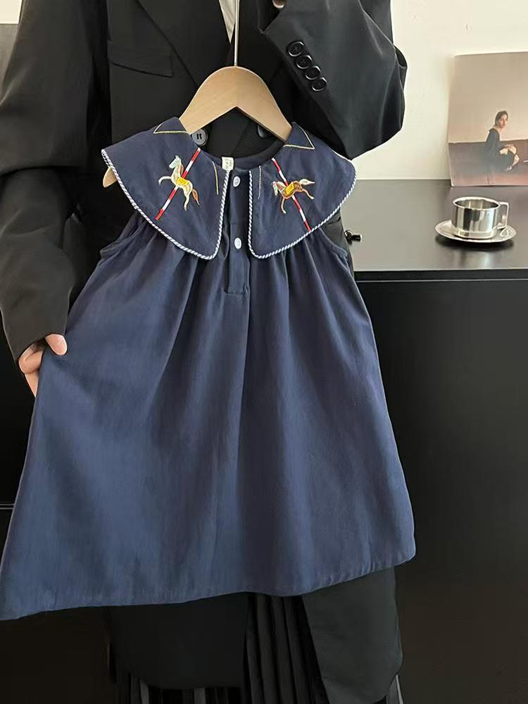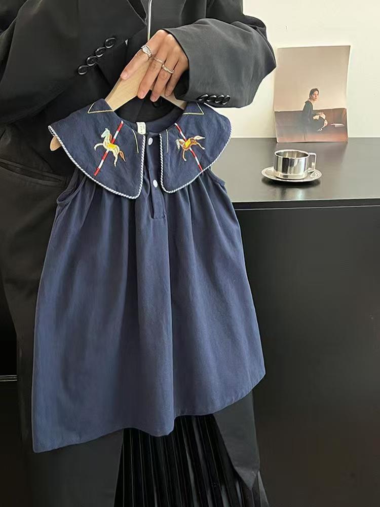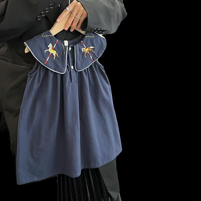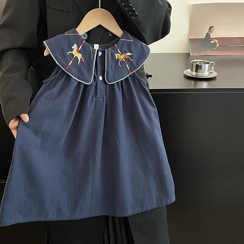 한국 아동복 2026년 신상 여름옷 여아 레트로 스타일 민소매 원피스, 세련된 자수 연잎 칼라 원피스