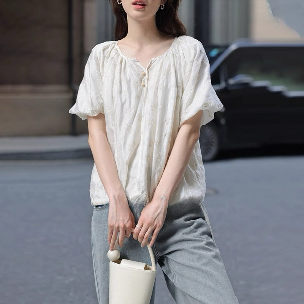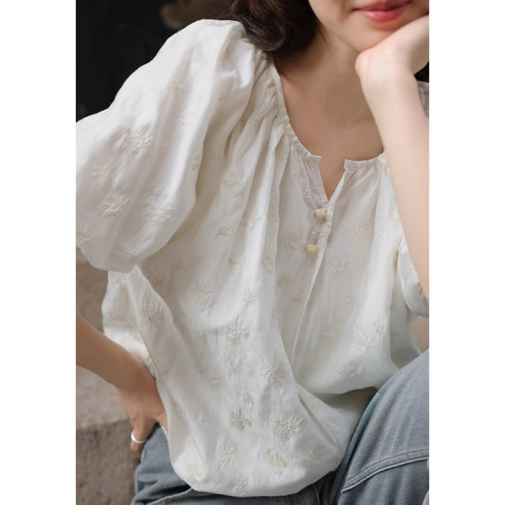 프랑스의 절묘한 크로셰! 90% 쿨 텐셀 랜턴 슬리브 반팔 쉬폰 셔츠 탑 여름 여성 셔츠