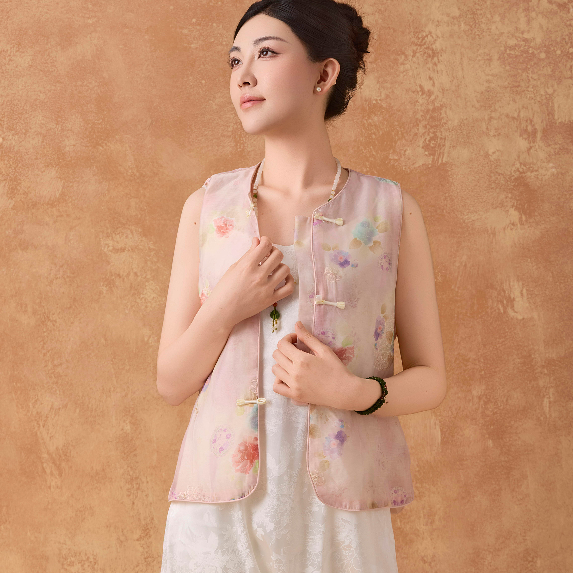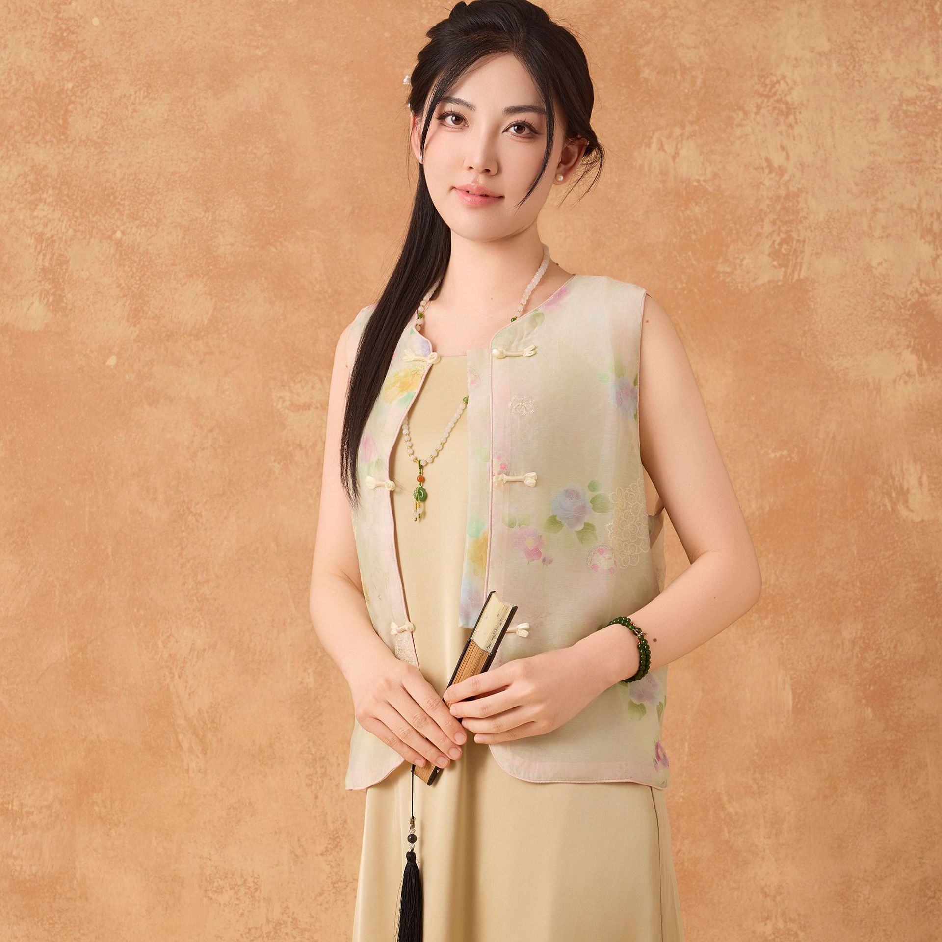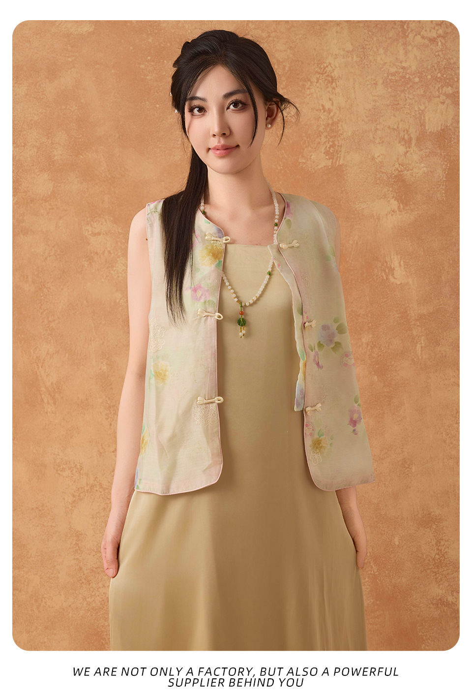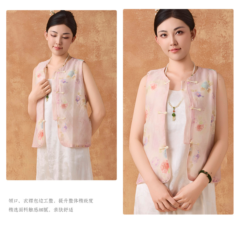2025 봄과 여름 얇은 복고풍 슬림 중국 스타일 버튼 조끼 여성의 새로운 중국 스타일 라운드 넥 신선한 조끼 재킷