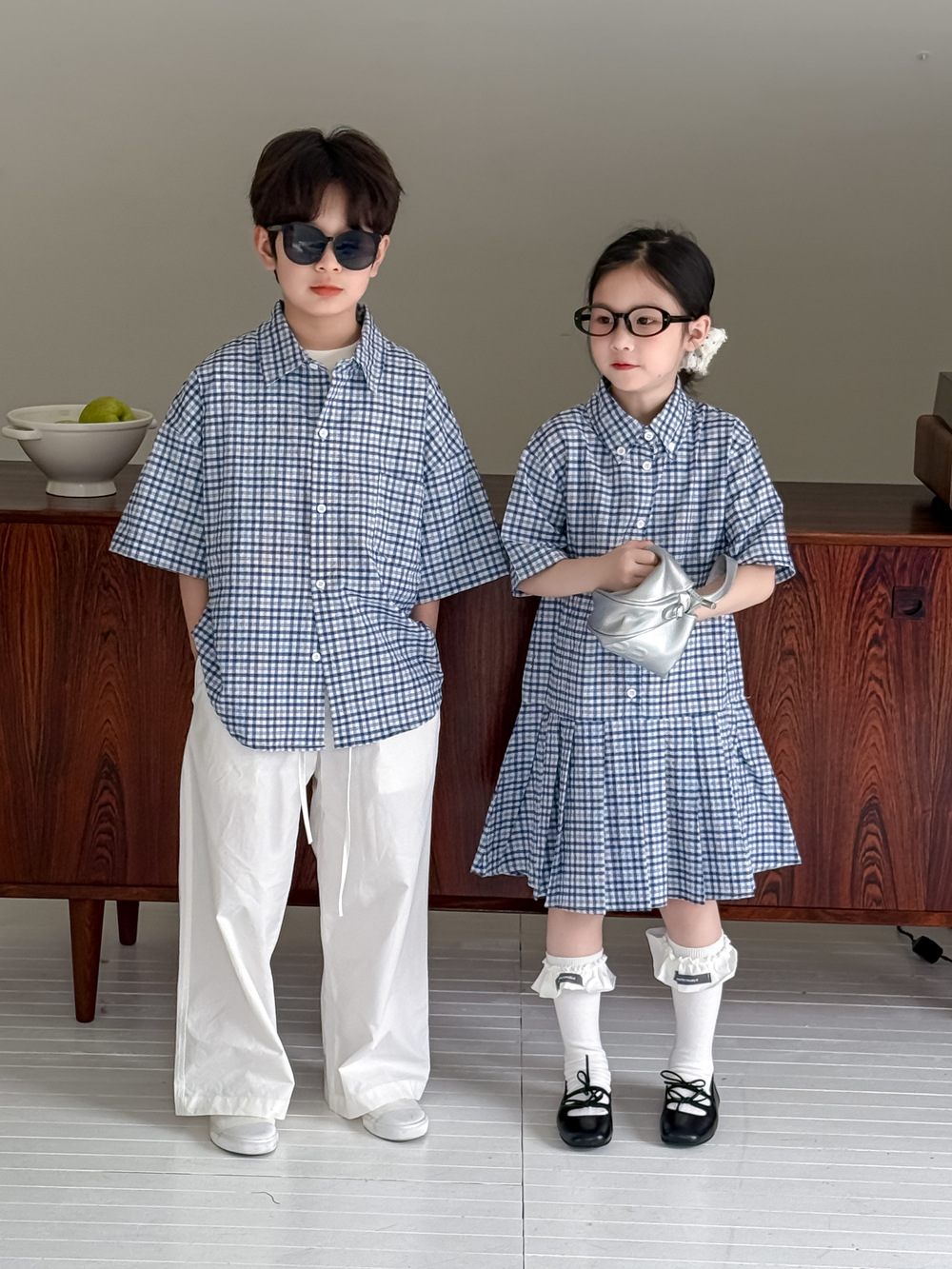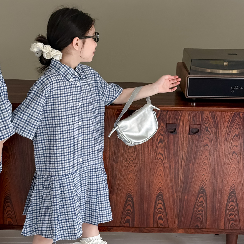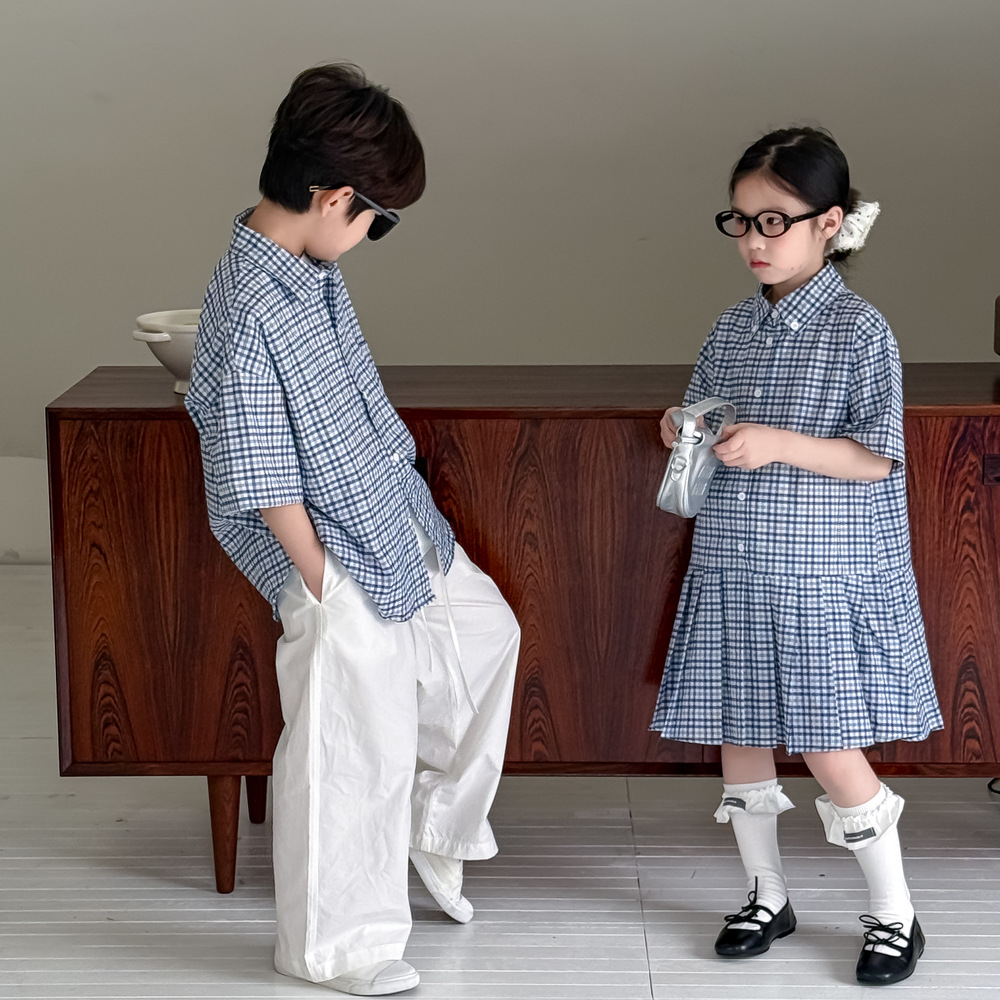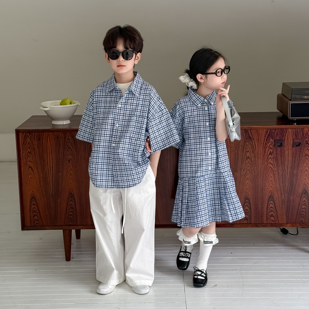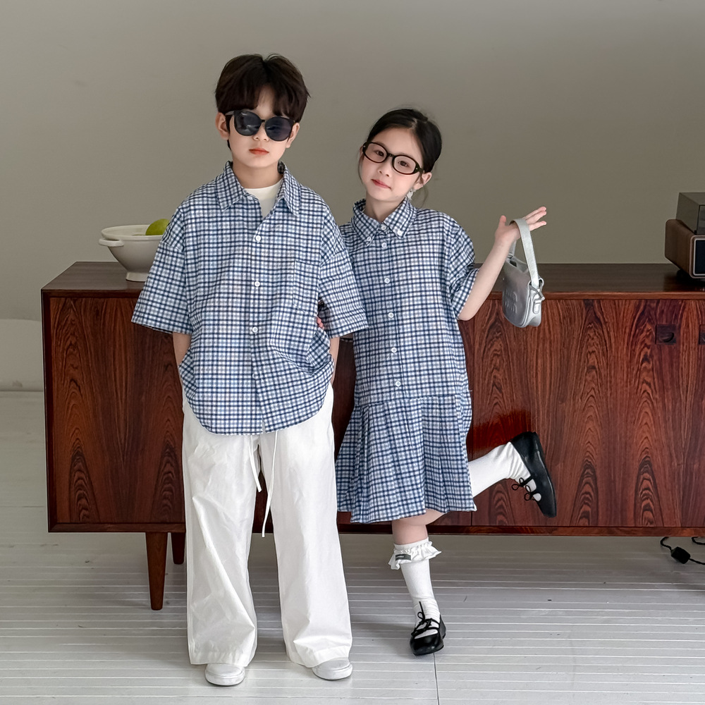 아동용 셔츠 2026 여름 남아 여아 한국식 체크무늬 라펠 셔츠 아동 캐주얼 상큼한 원피스 형제자매룩스토어 가기