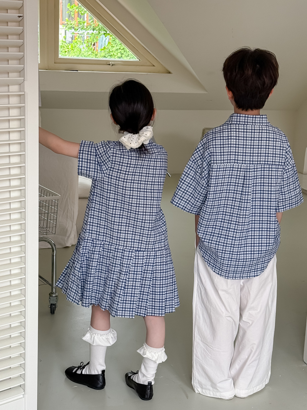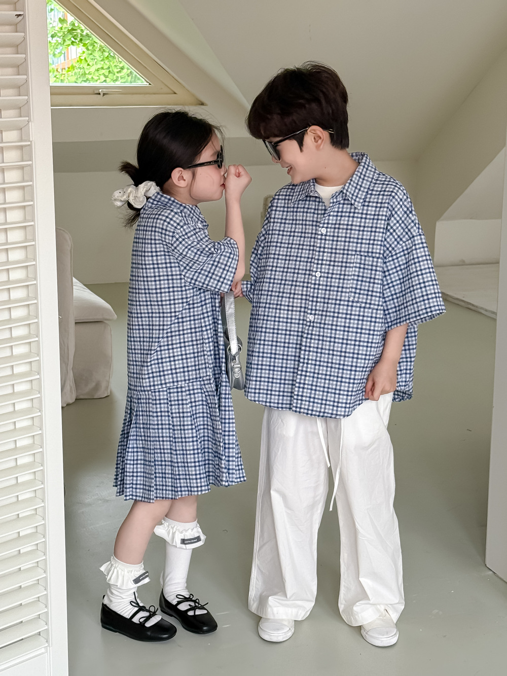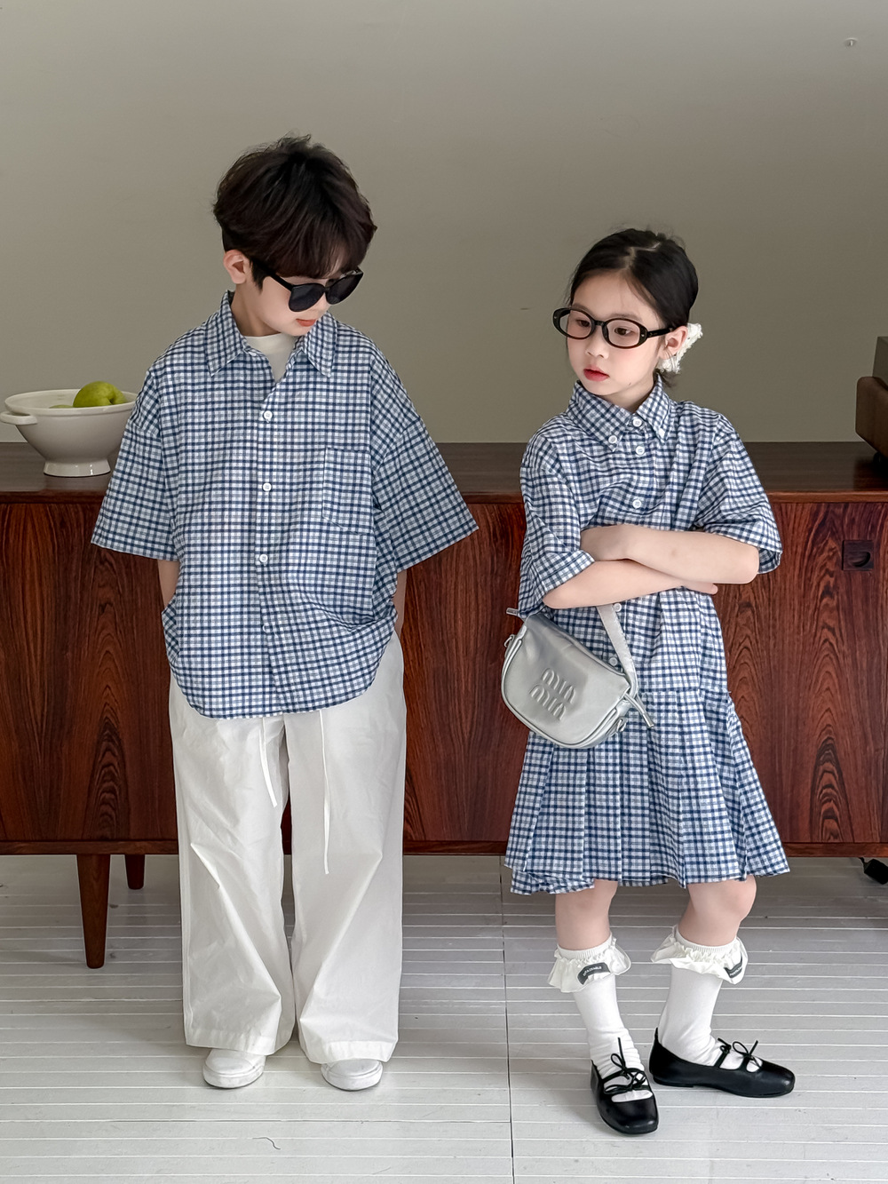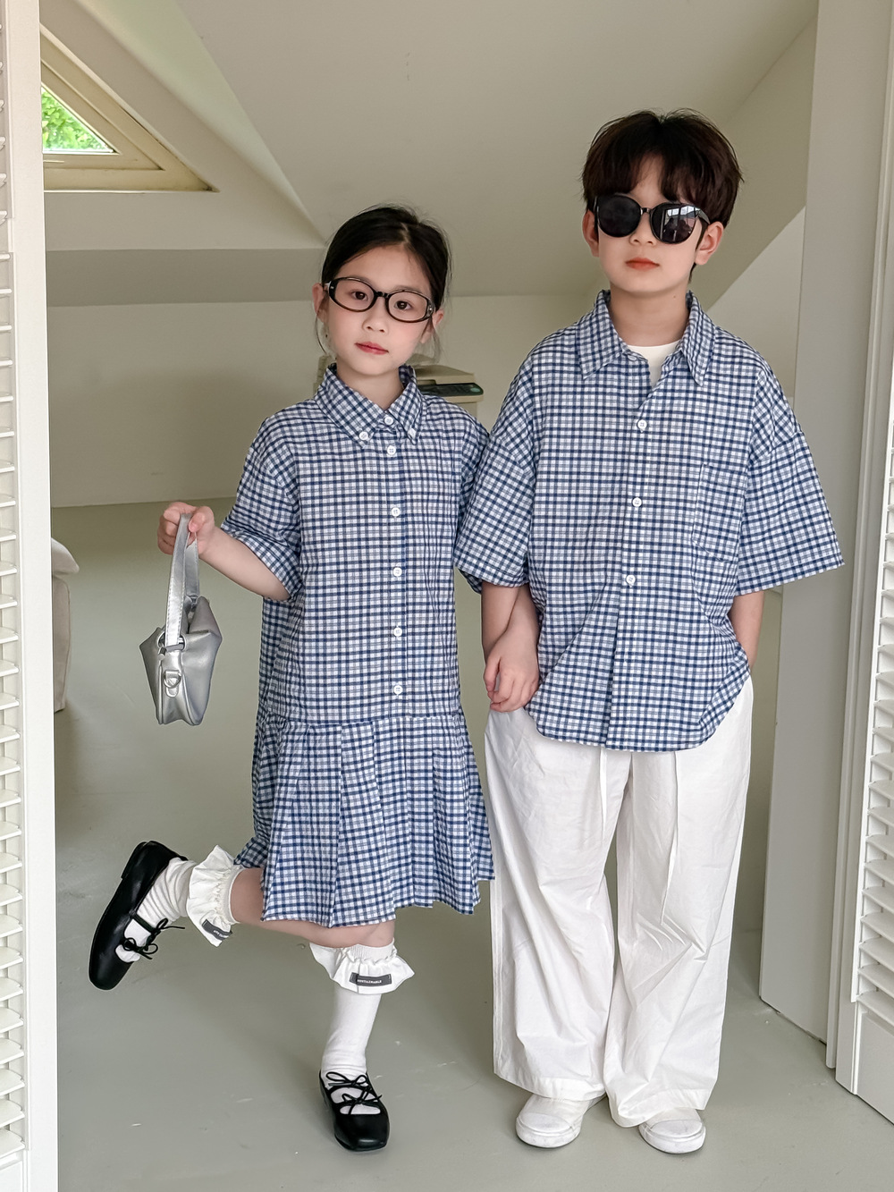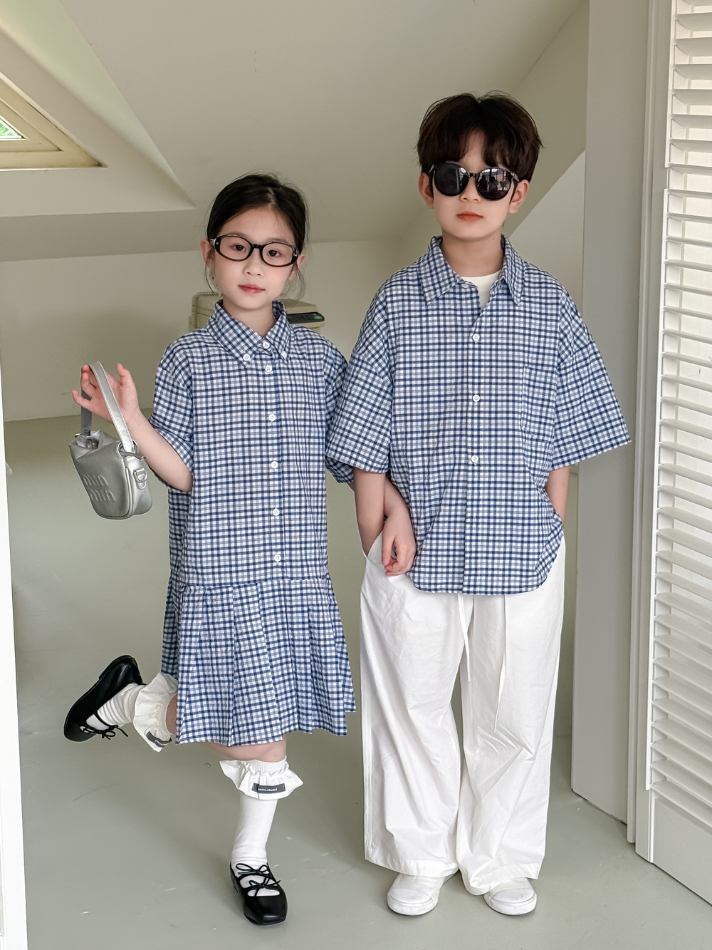 아동용 셔츠 2026 여름 남아 여아 한국식 체크무늬 라펠 셔츠 아동 캐주얼 상큼한 원피스 형제자매룩스토어 가기