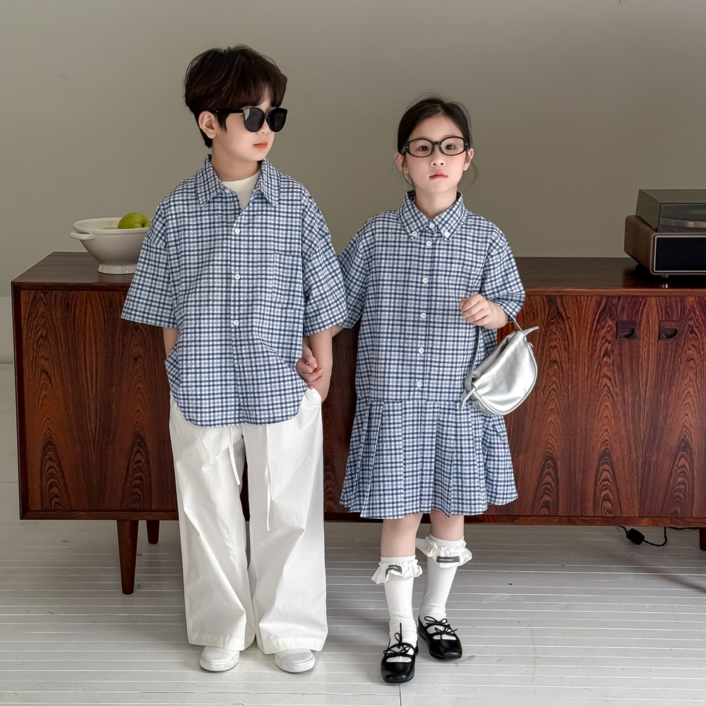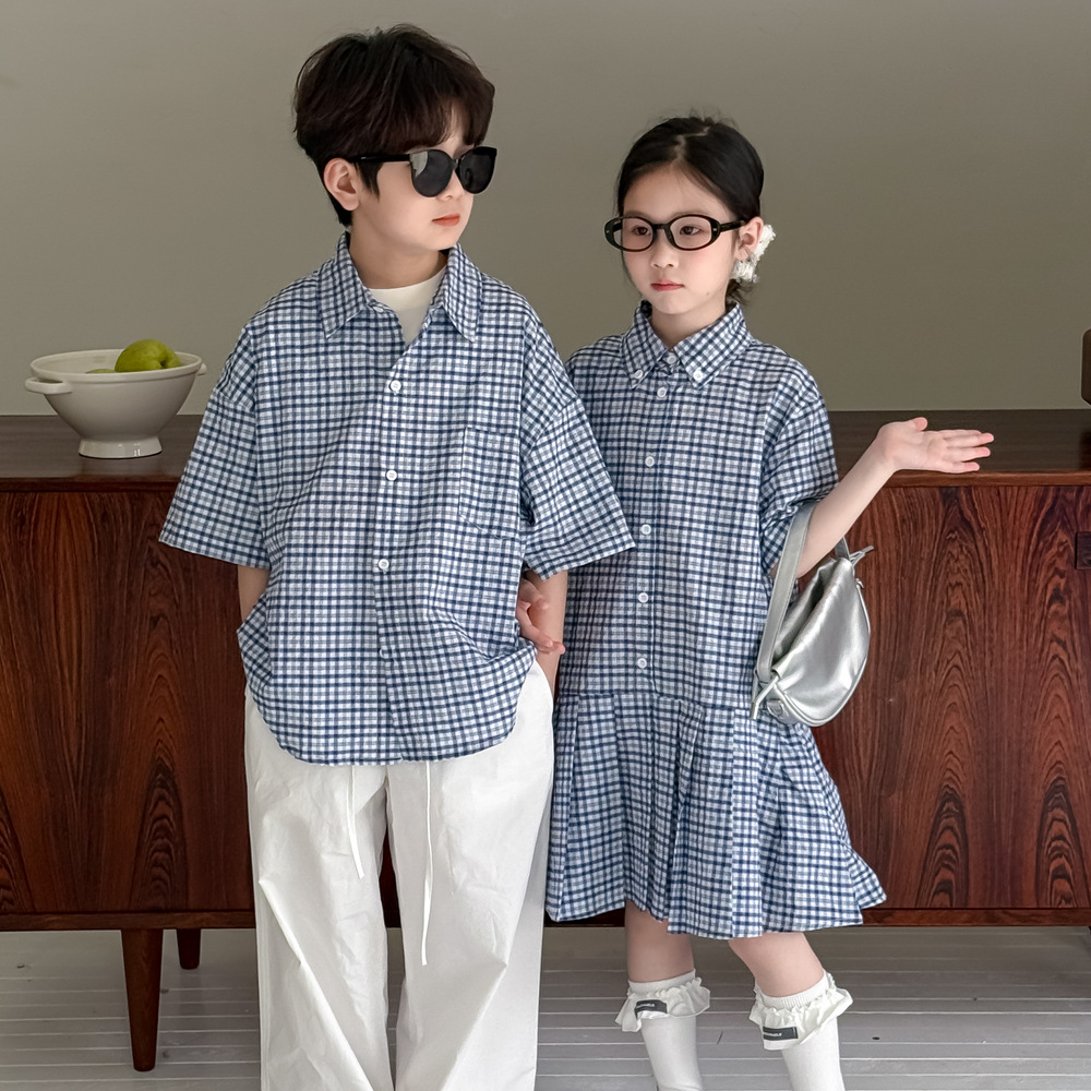 아동용 셔츠 2026 여름 남아 여아 한국식 체크무늬 라펠 셔츠 아동 캐주얼 상큼한 원피스 형제자매룩