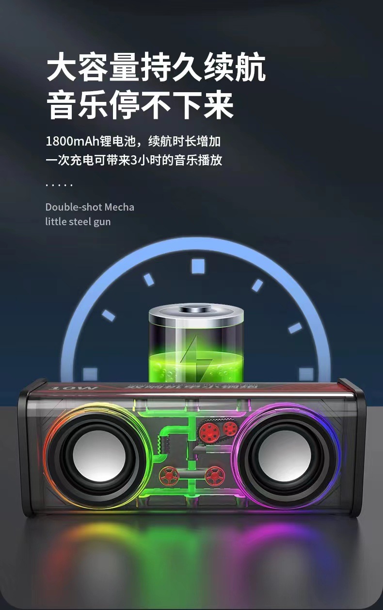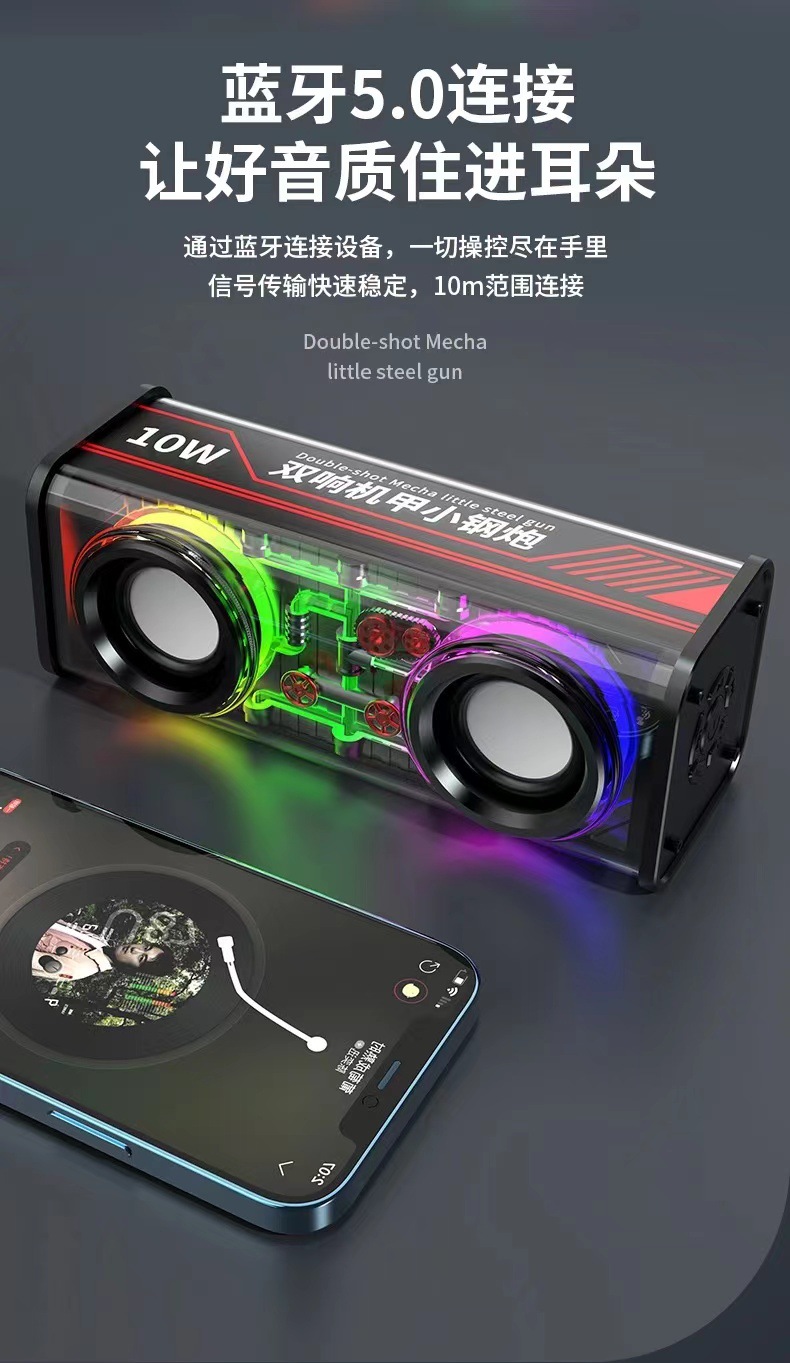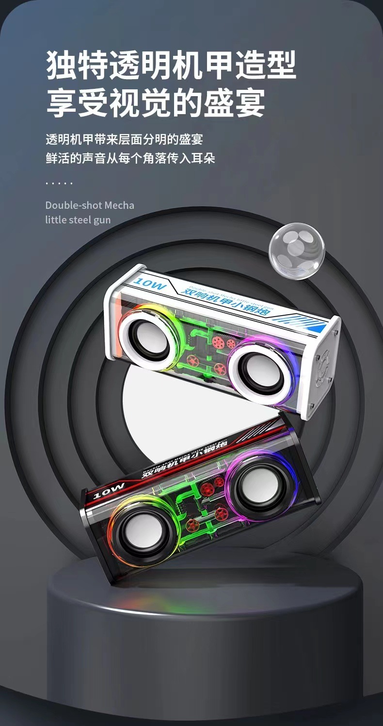 V8 블루투스 스피커 듀얼 스피커 투명 메카 소형 강철 총 다채로운 고출력 서브 우퍼 크리 에이 티브 데스크탑 소형 스피커