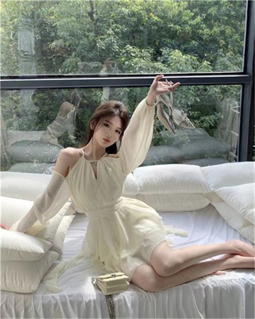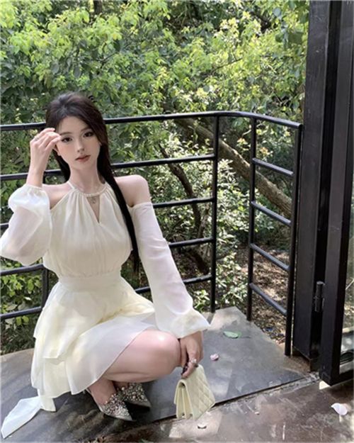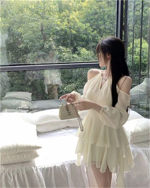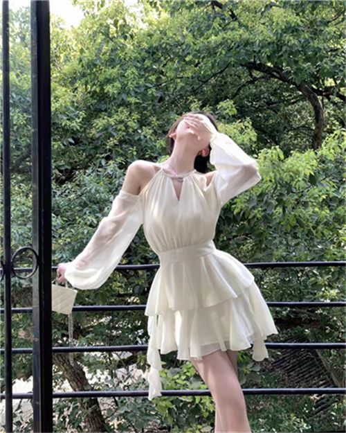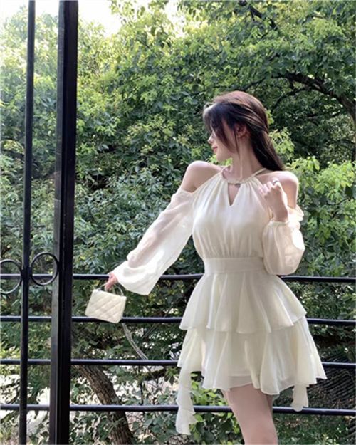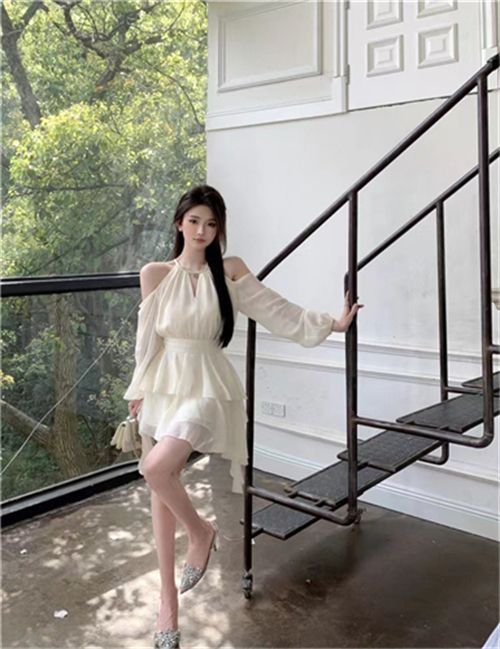 2026년 신상 프렌치 스타일 살구색 긴팔 원피스, 오프숄더 디자인, 허리를 잘록하게 잡아주는 슬리밍 효과, 매우 우아한 러플 케이크 스커트스토어 가기