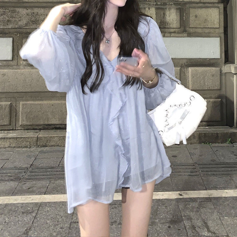 월시 별하늘 러플 쉬폰 셔츠 여성 순수한 욕망 스타일 긴팔 셔츠 초가을 신상 탑 디자인 투피스 세트스토어 가기