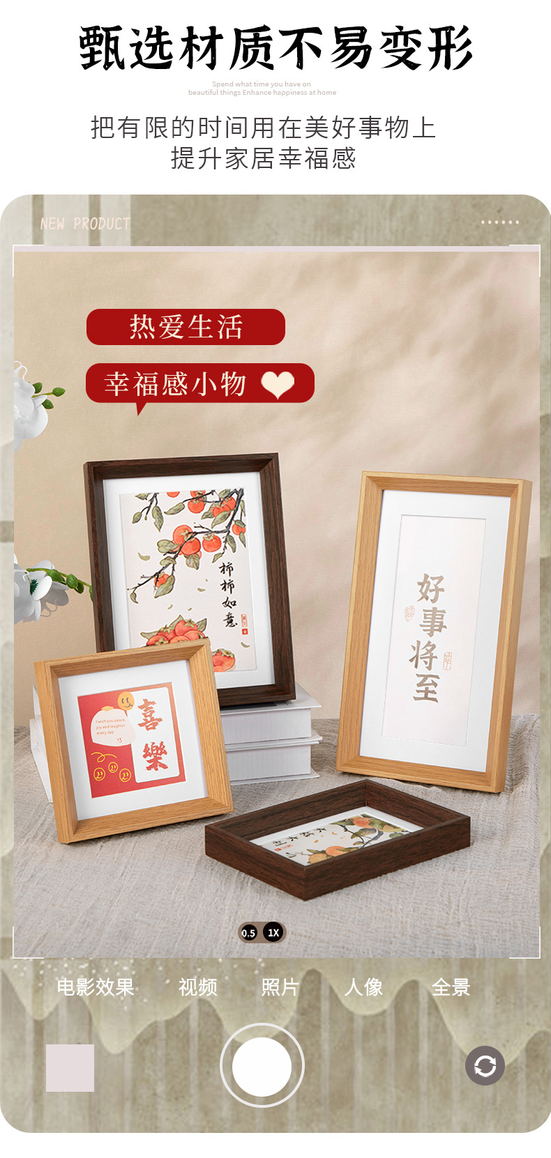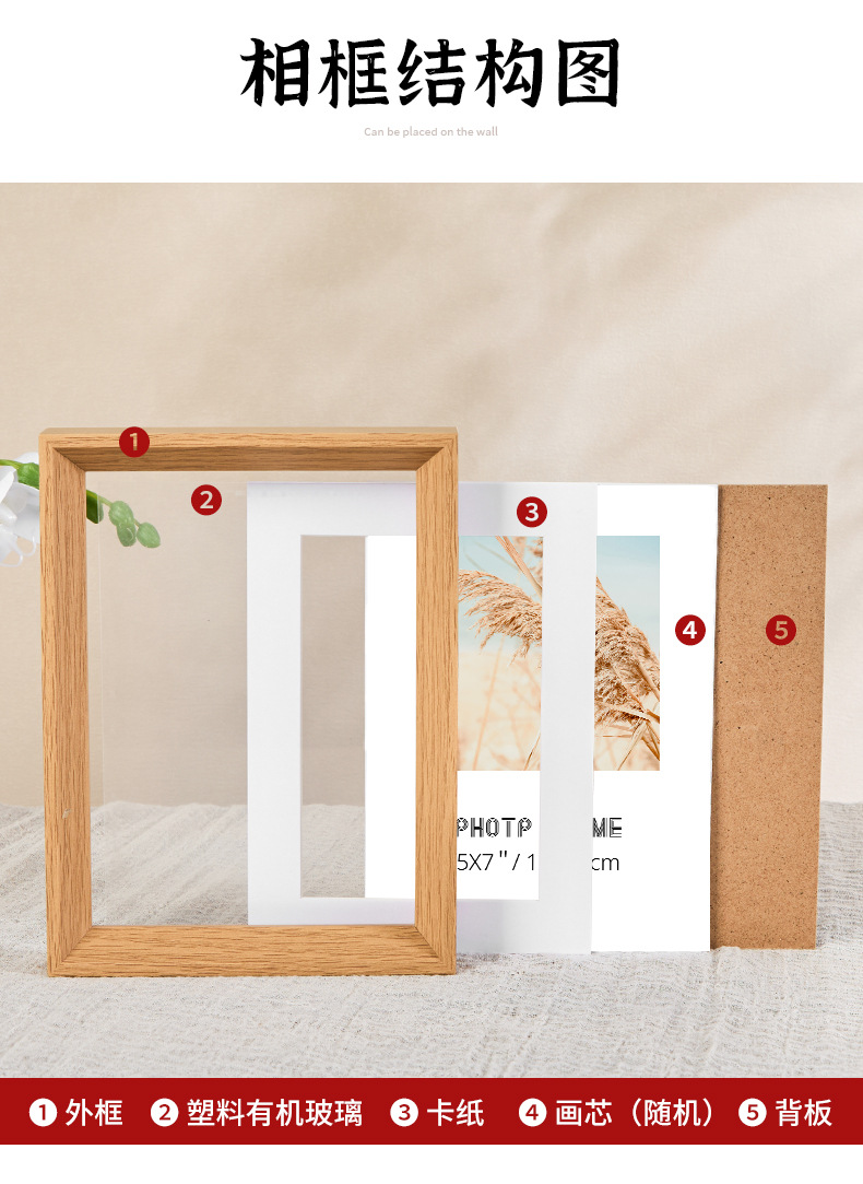 二、相框成品包含:外框、卡纸、塑料有机玻璃面板、随机图案画芯,后密度板背板、