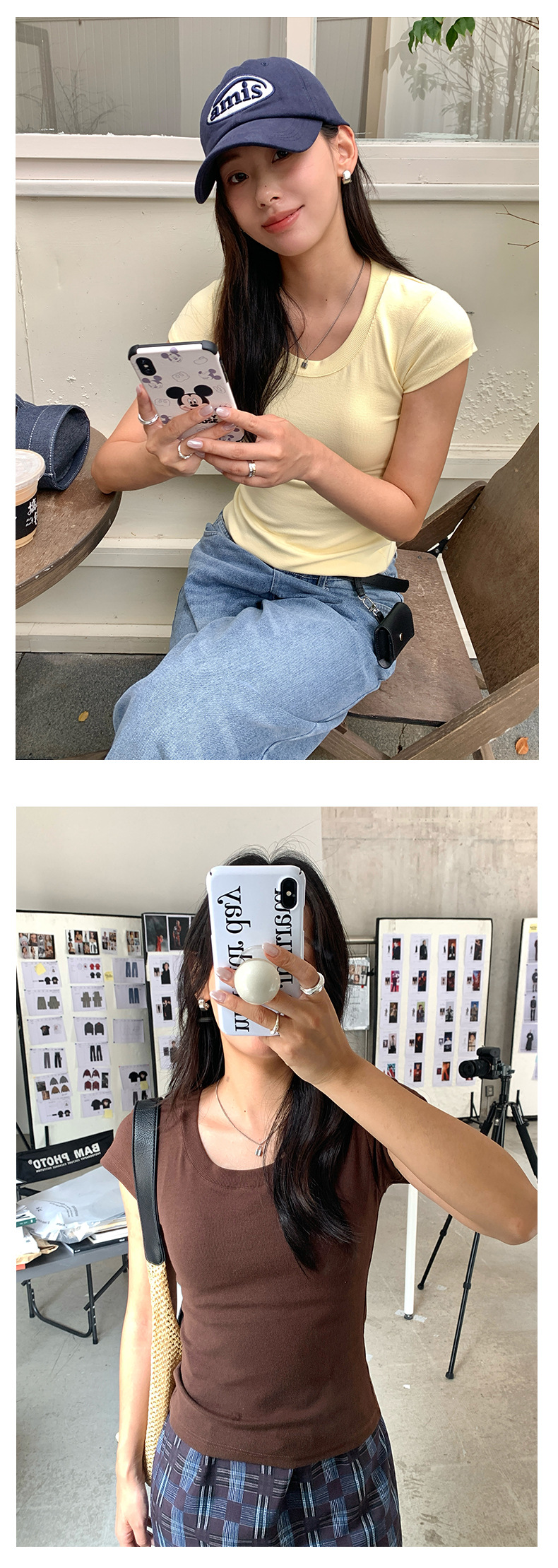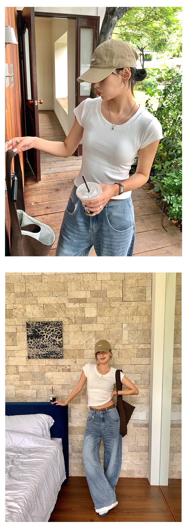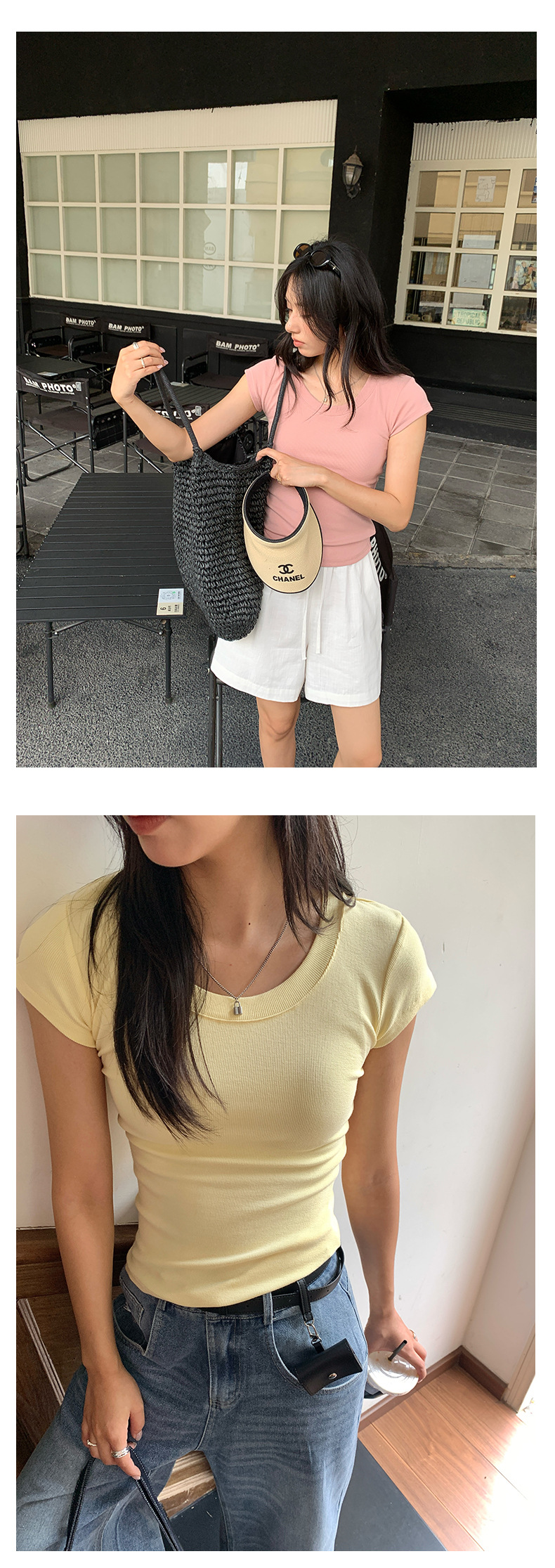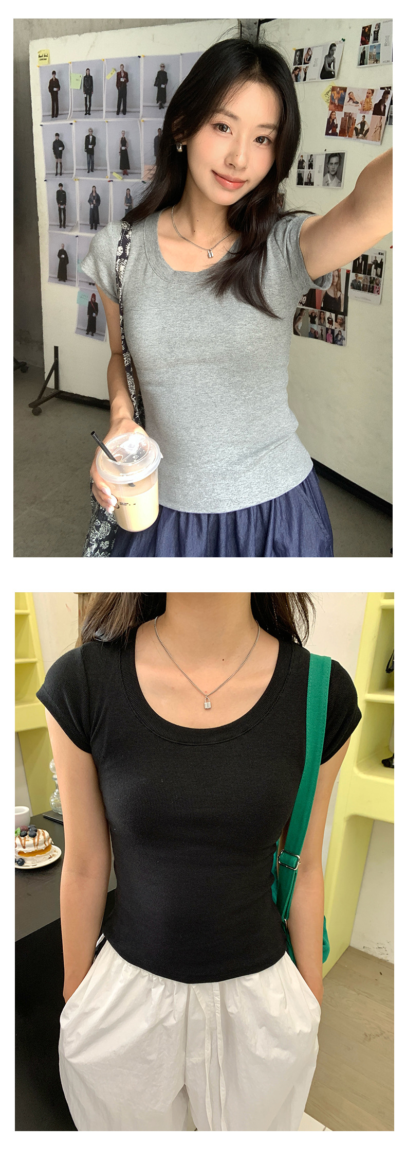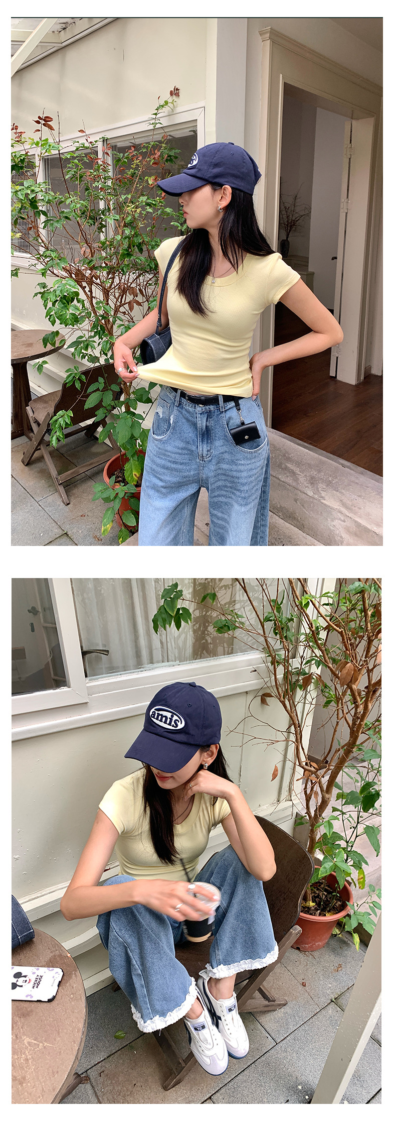 Huang Zheng 2025 새로운 허리 파인 알몸 티셔츠 짧은 소매 모든 경기 디자인 센스베이스 셔츠 U 넥 슬림 핏 탑 520496스토어 가기