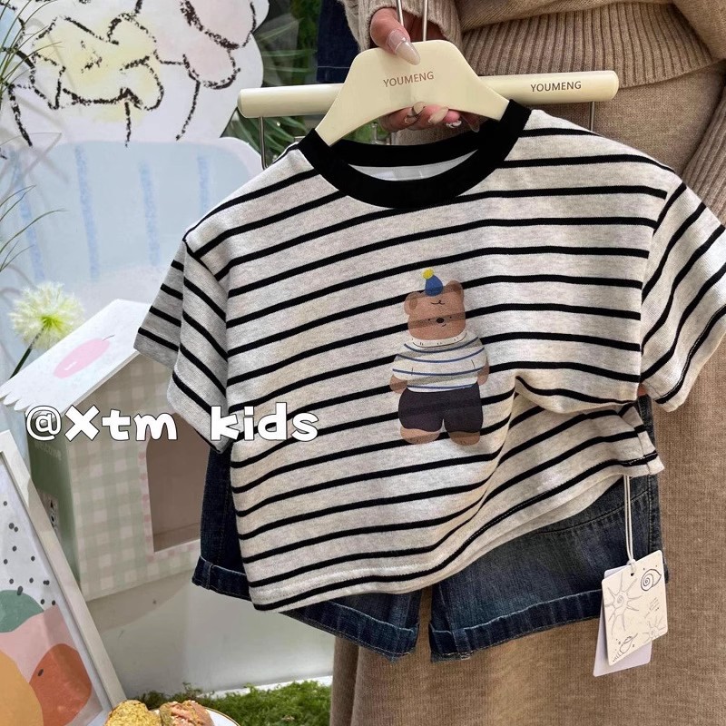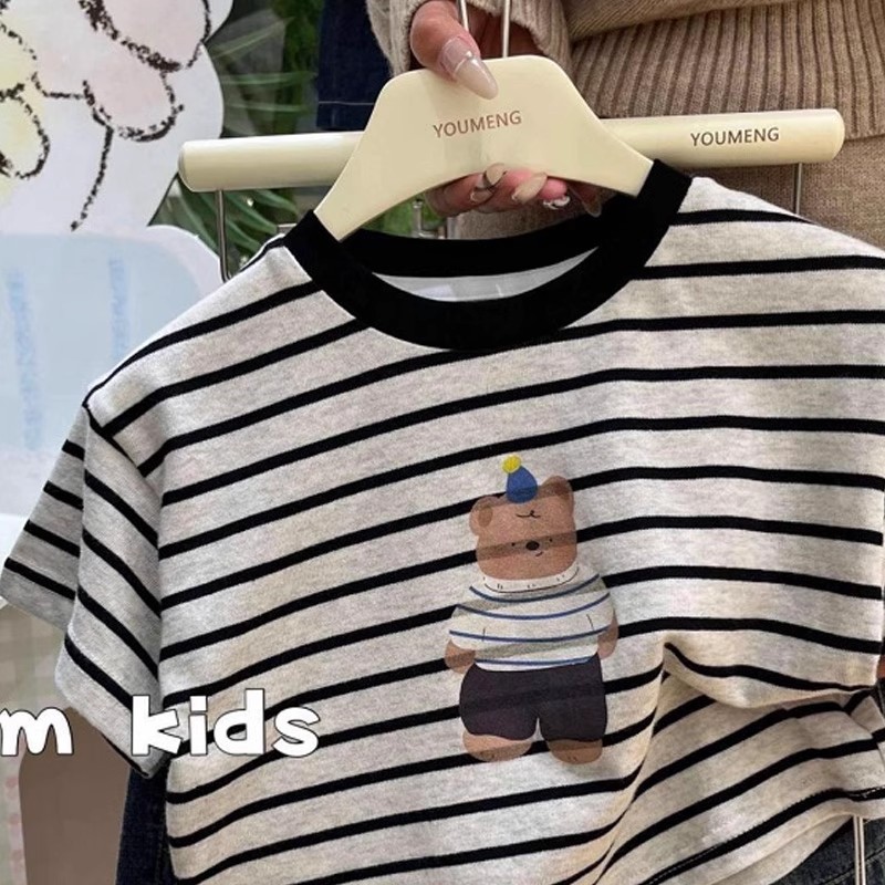 소년과 소녀를위한 어린이의 새로운 여름 줄무늬 반팔 티셔츠 귀여운 곰 프린트 반팔 어린이 라운드 넥 탑