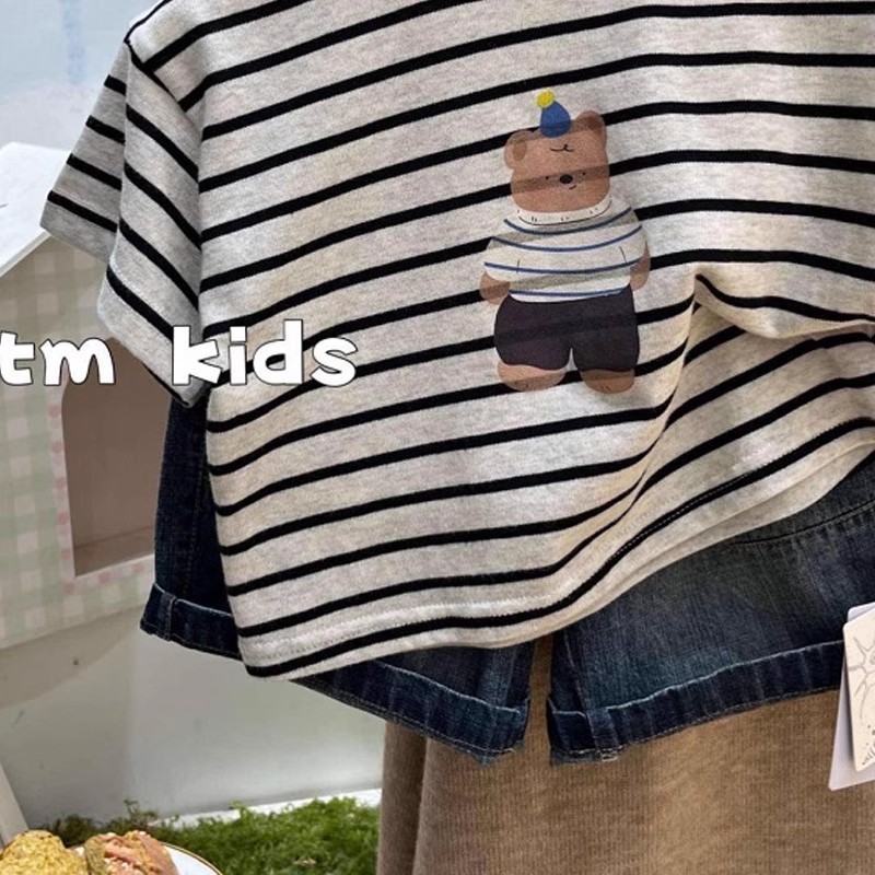 소년과 소녀를위한 어린이의 새로운 여름 줄무늬 반팔 티셔츠 귀여운 곰 프린트 반팔 어린이 라운드 넥 탑스토어 가기