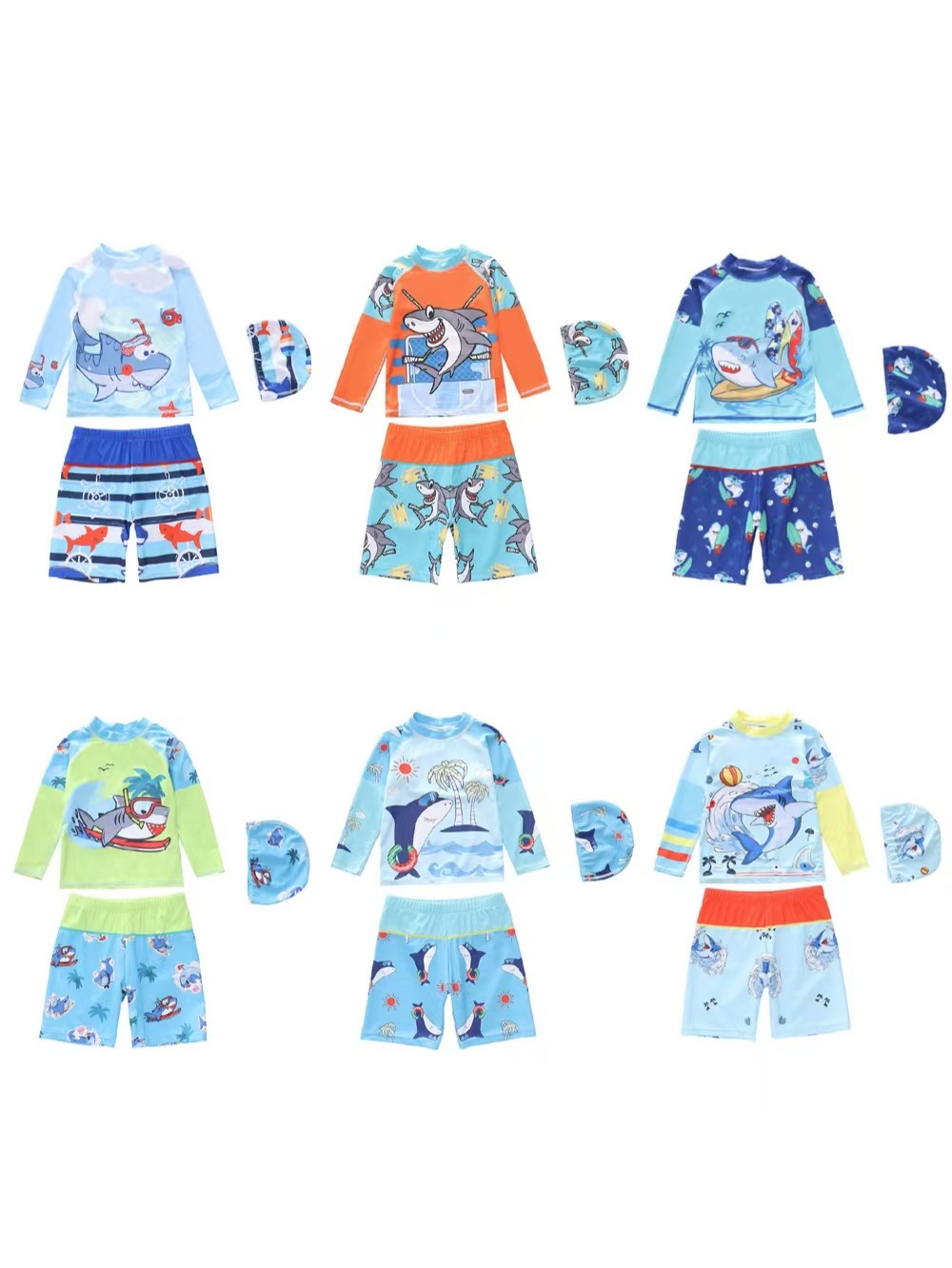 2025 새로운 어린이 수영복 남자 스플릿 긴팔 중간 바지 소형, 중형 및 대형 어린이 수영복 복서 팬티 소년 수영복스토어 가기