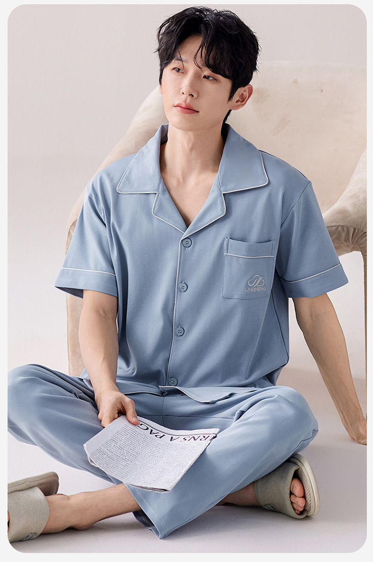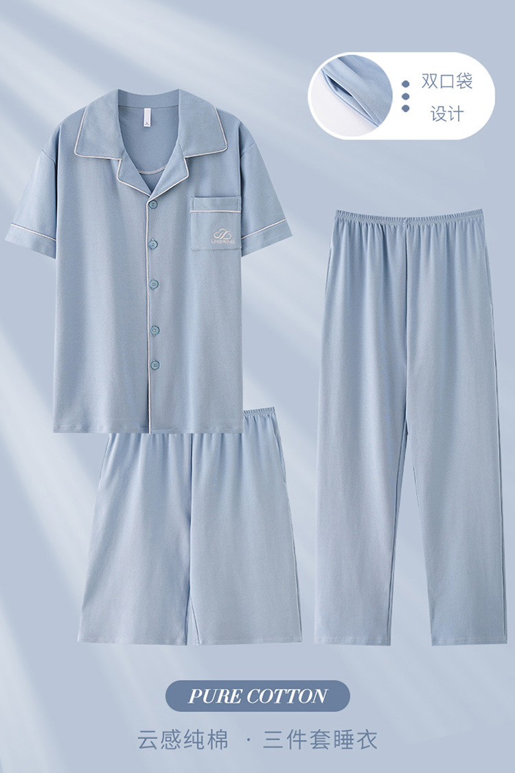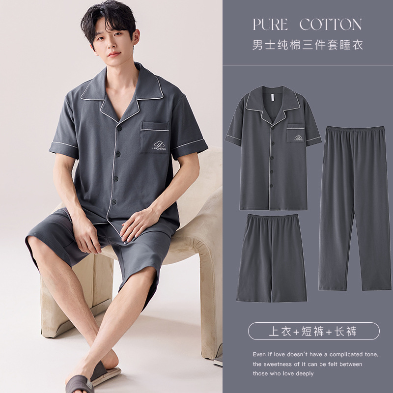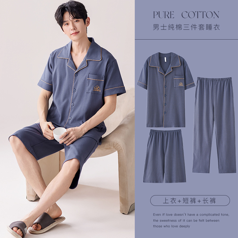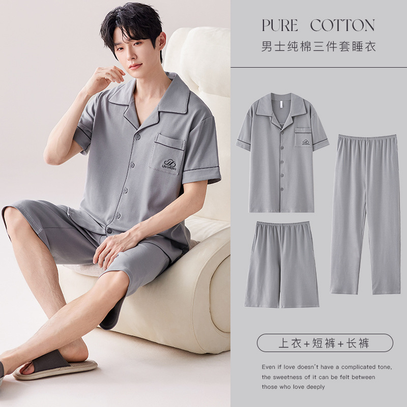 순면 잠옷 남성 여름 반팔 웨어러블 고급 셔츠 남성 홈웨어 3피스 슈트