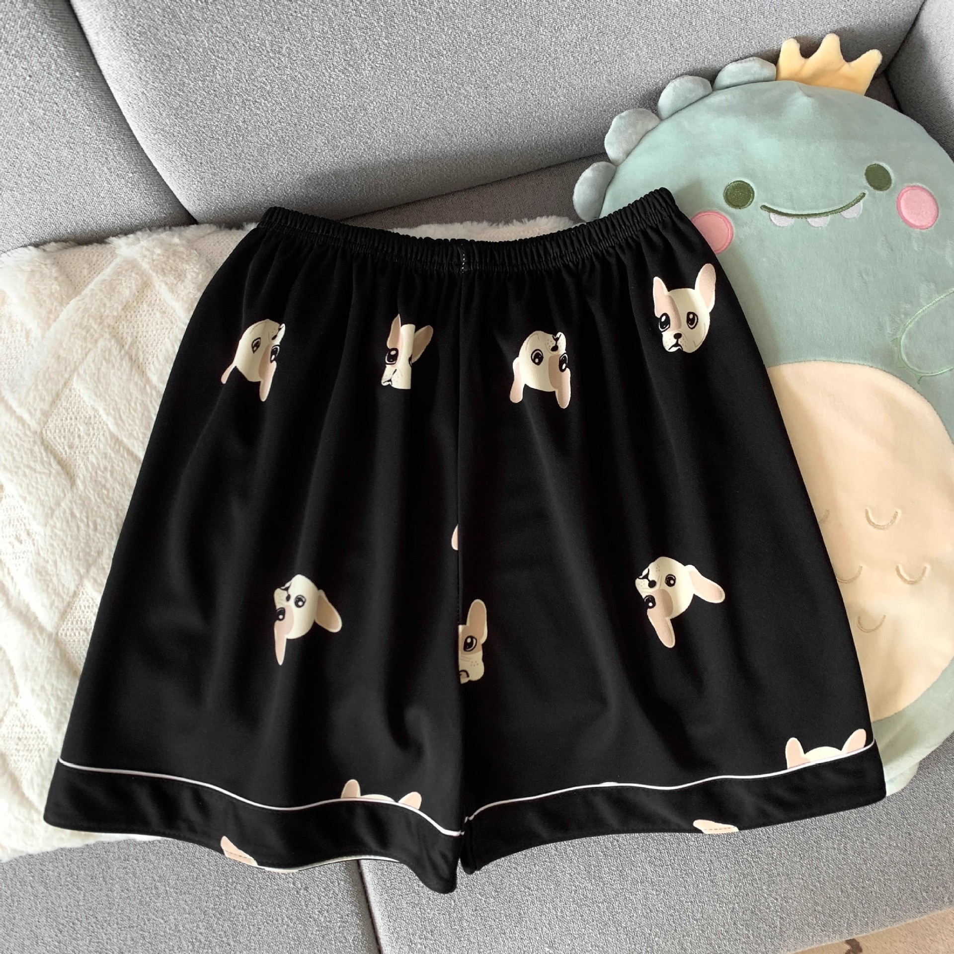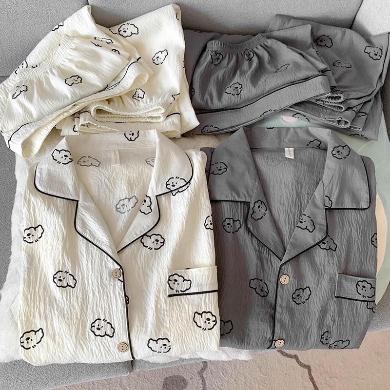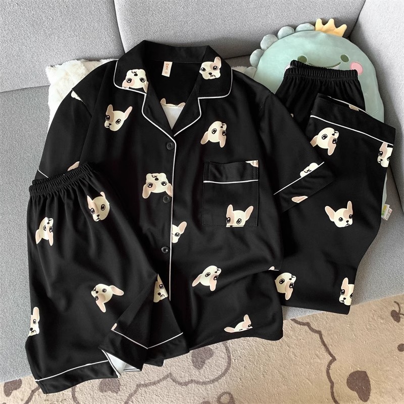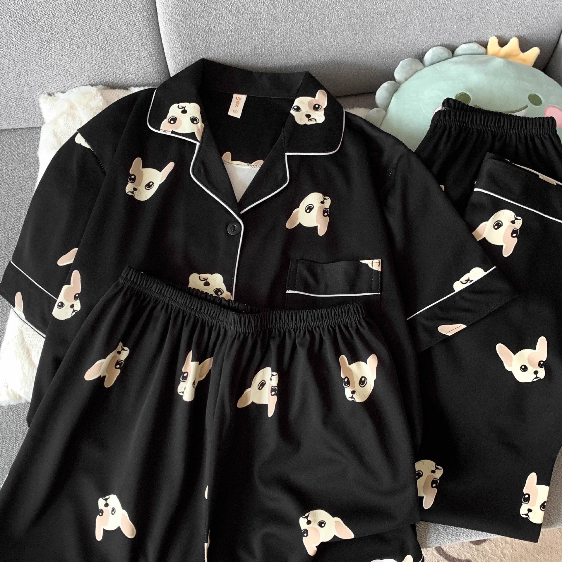 남성과 여성을 위한 만화 강아지 커플 잠옷, 여름 순면 반팔 3피스 양복, 얇은 가정복으로 착용 가능