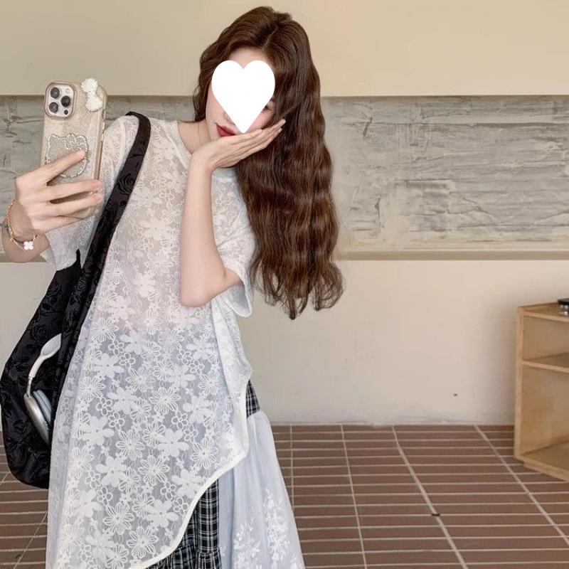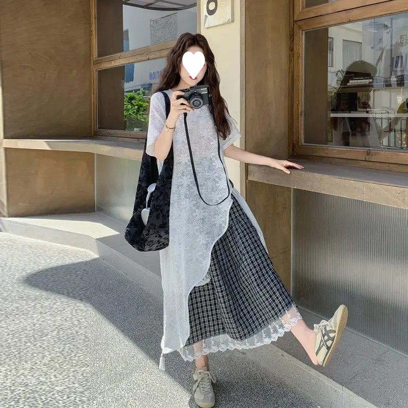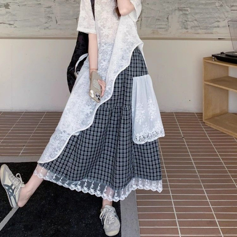 여성을위한 플러스 사이즈 한국 스타일 작은 신선한 정장 스커트 2025 여름 ins 스타일 레이스 사이드 슬래시 T 스커트 격자 무늬 스커트 투피스 세트