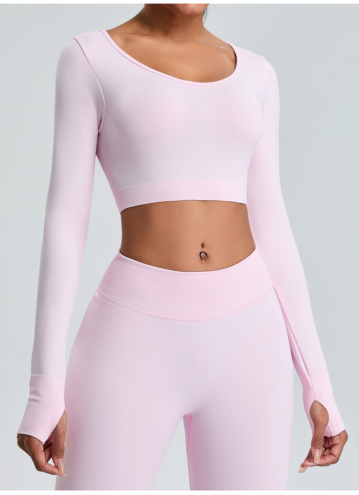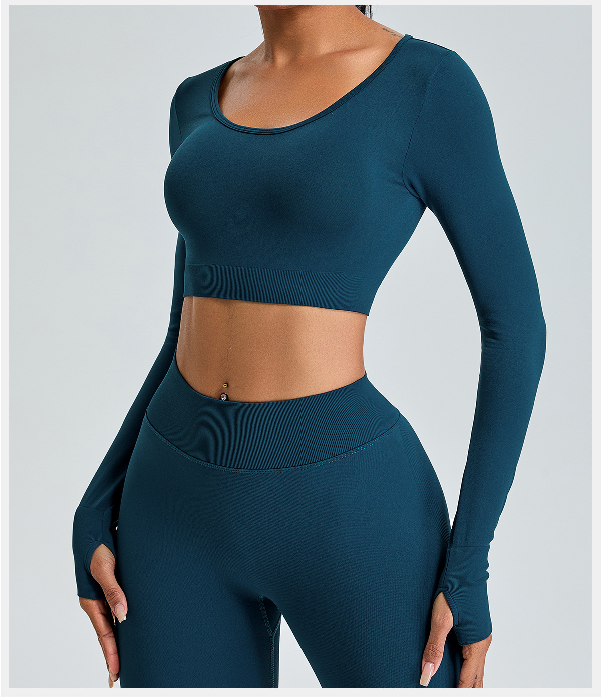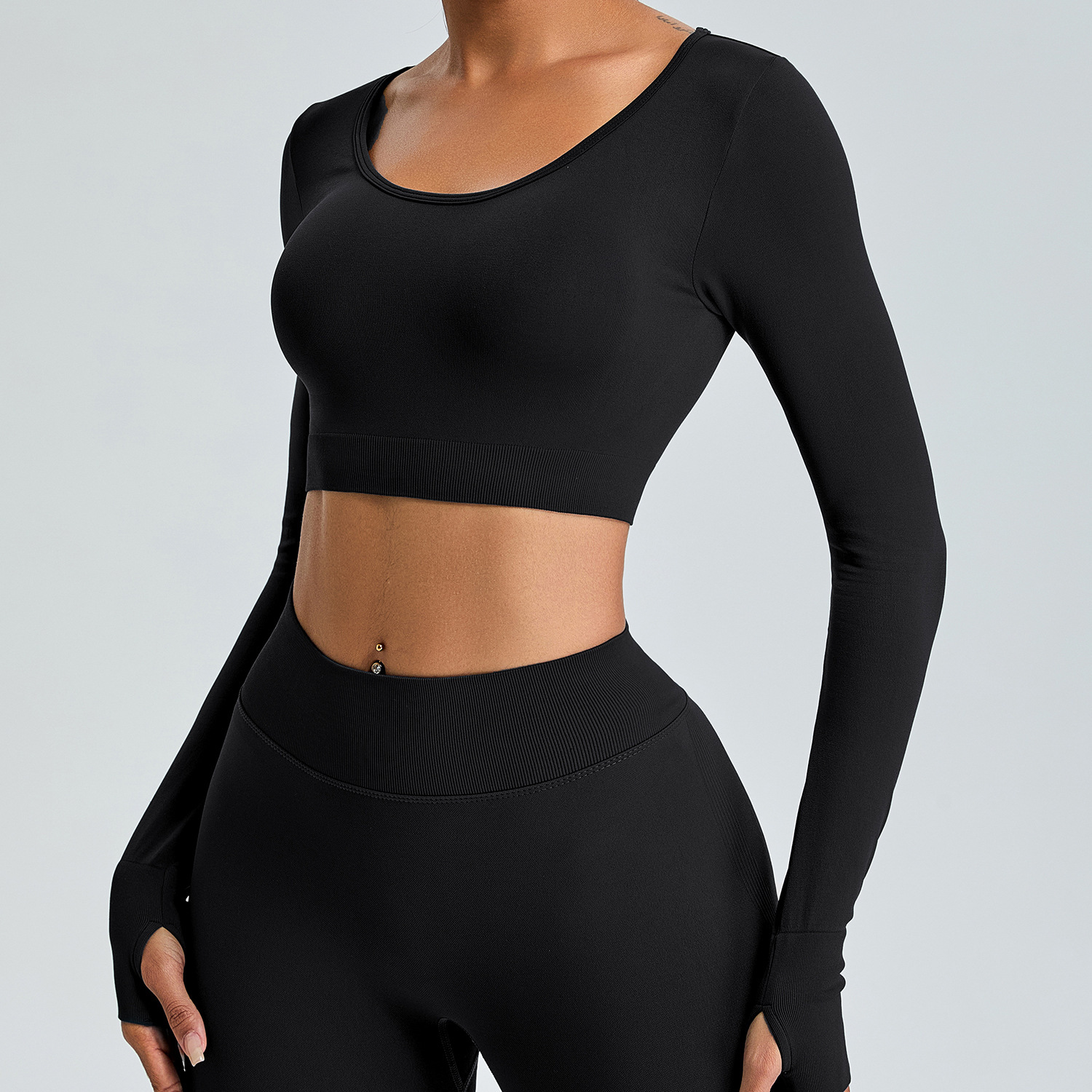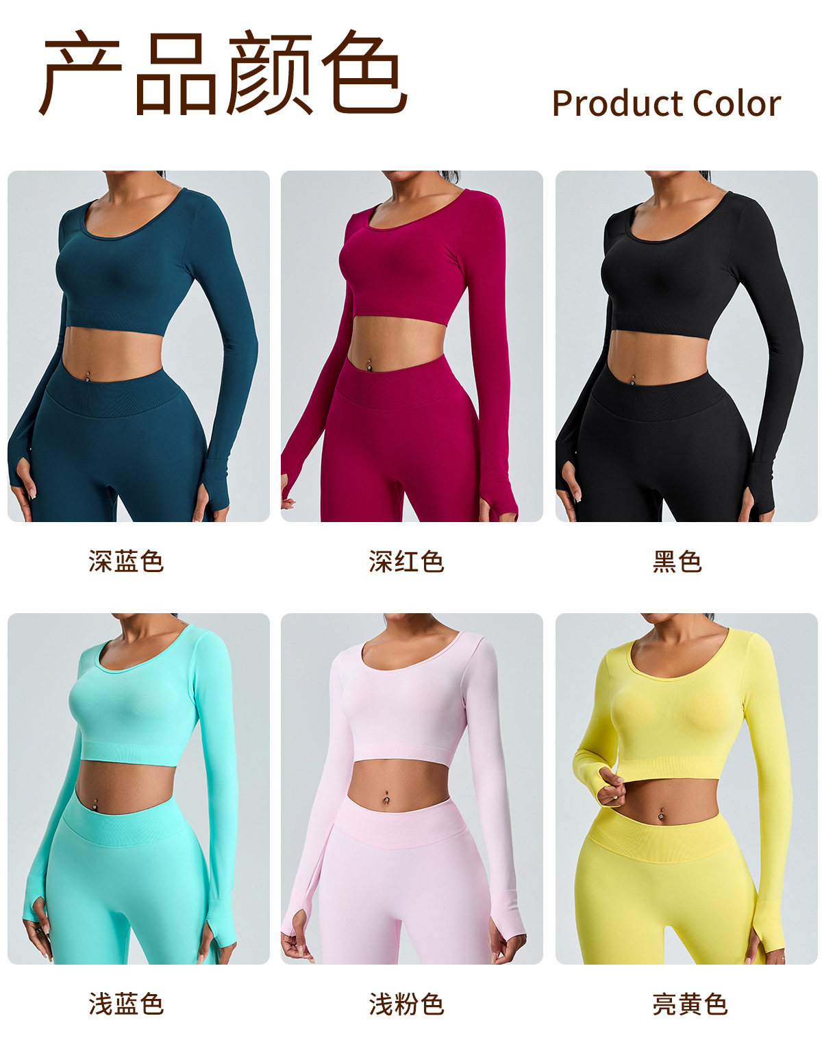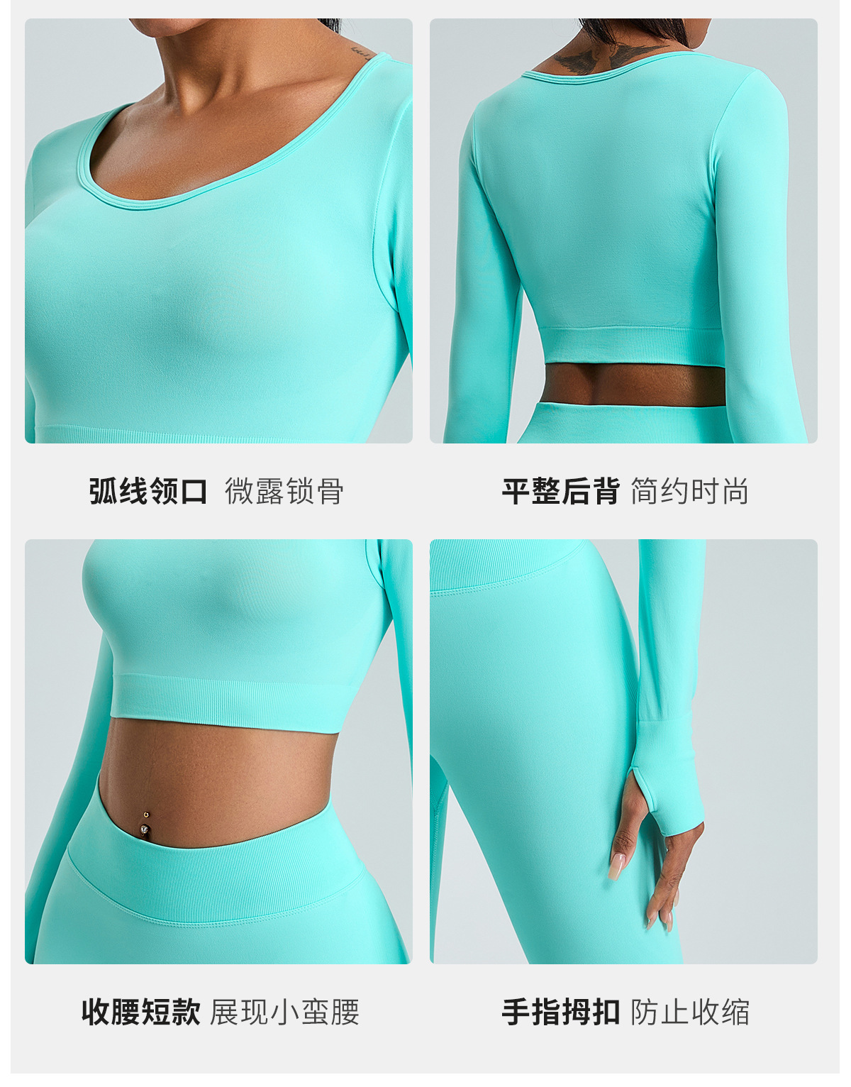 유럽과 미국의 새로운 스타일의 심리스 라운드넥 타이트핏 긴팔 요가탑 여성용 숏탑 허리 노출 속건 스포츠 피트니스웨어