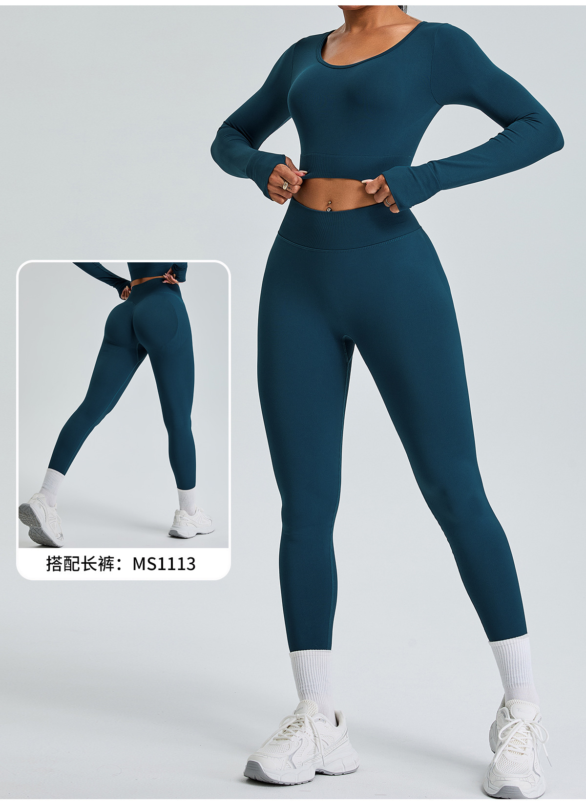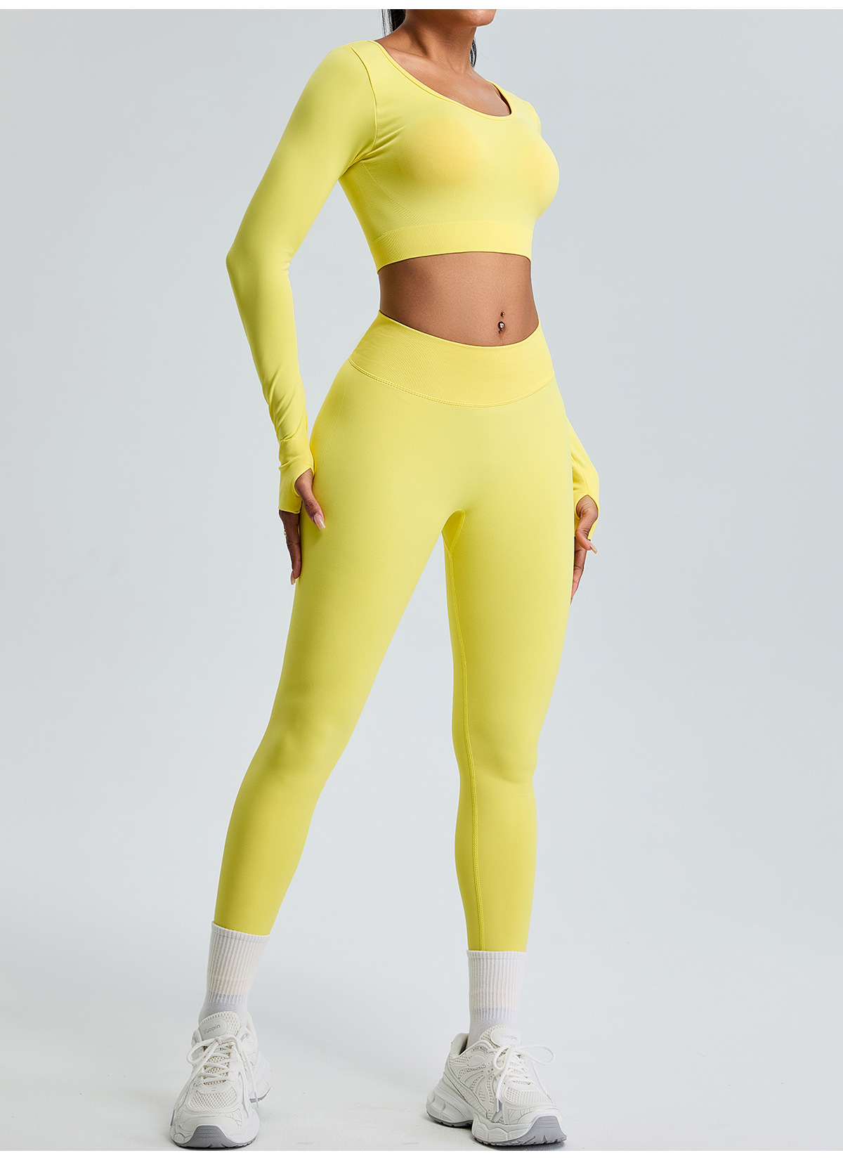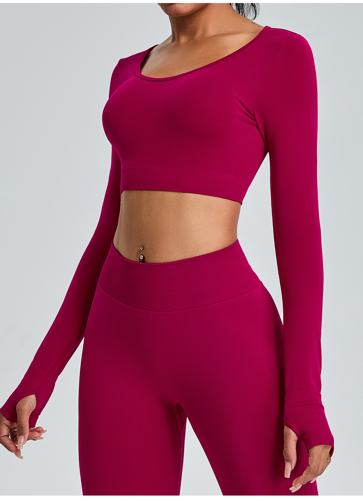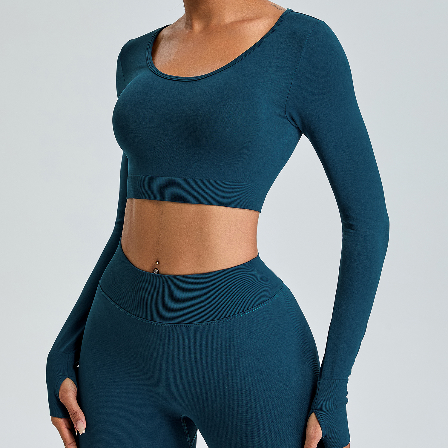 유럽과 미국의 새로운 스타일의 심리스 라운드넥 타이트핏 긴팔 요가탑 여성용 숏탑 허리 노출 속건 스포츠 피트니스웨어