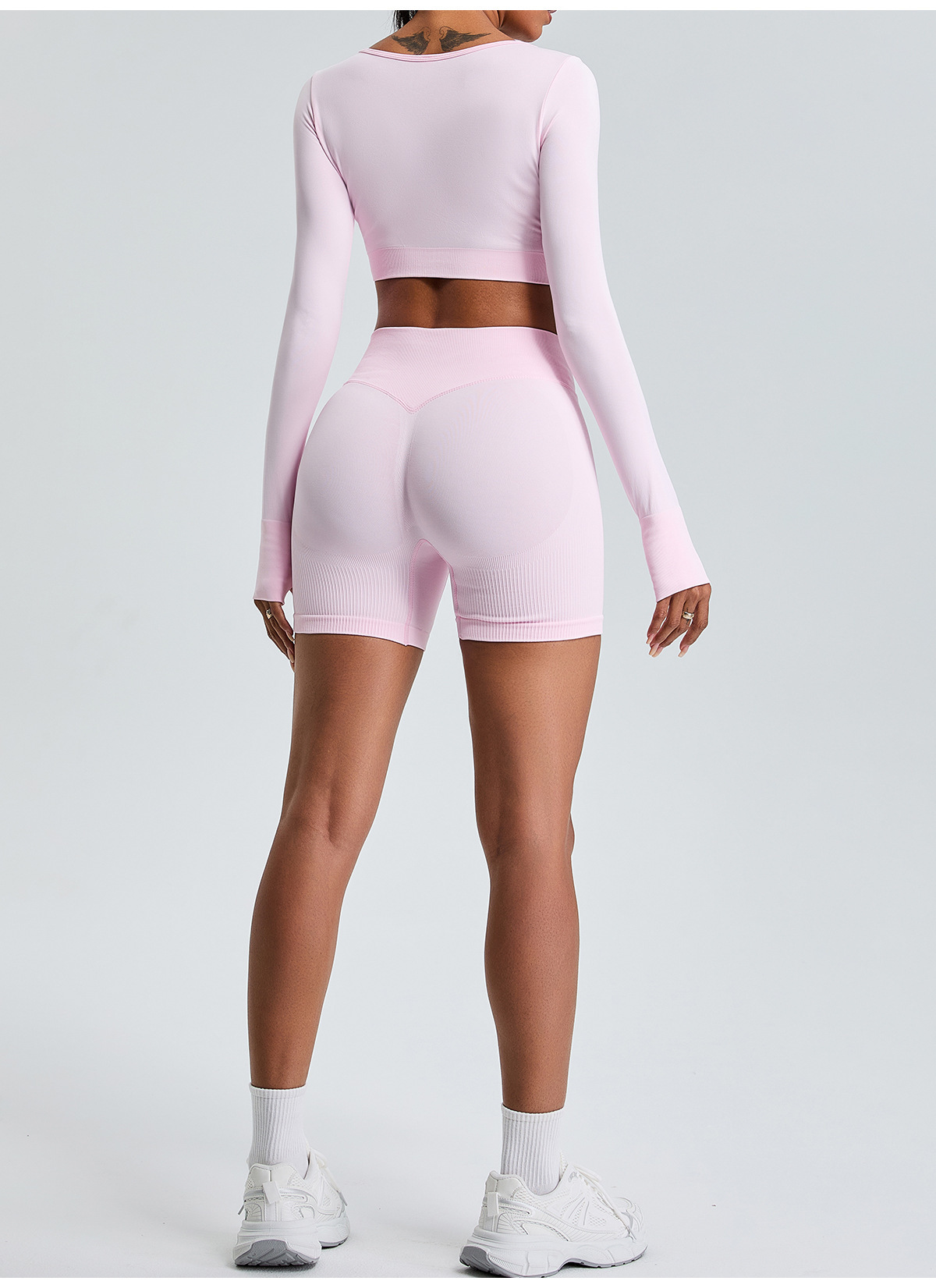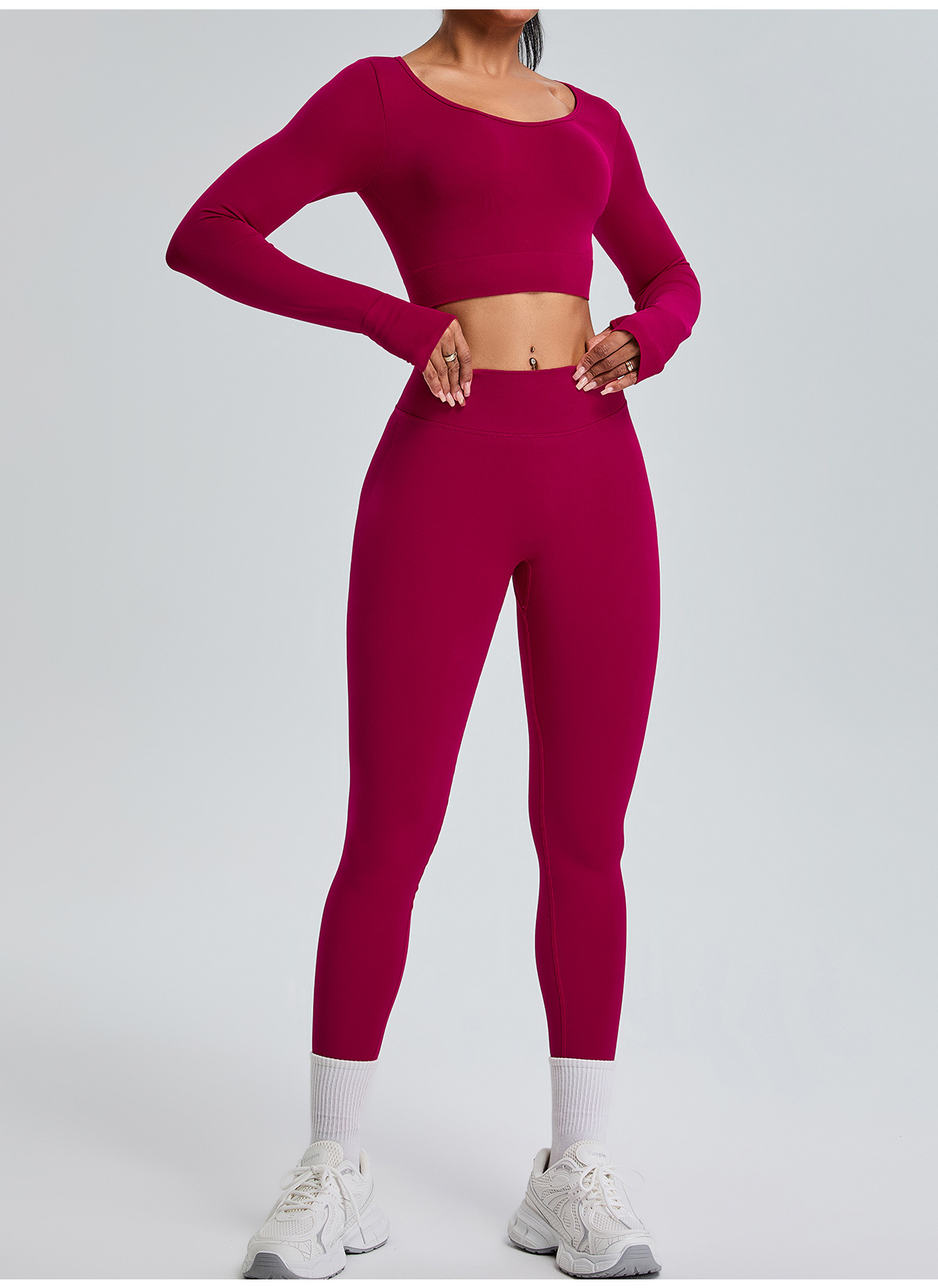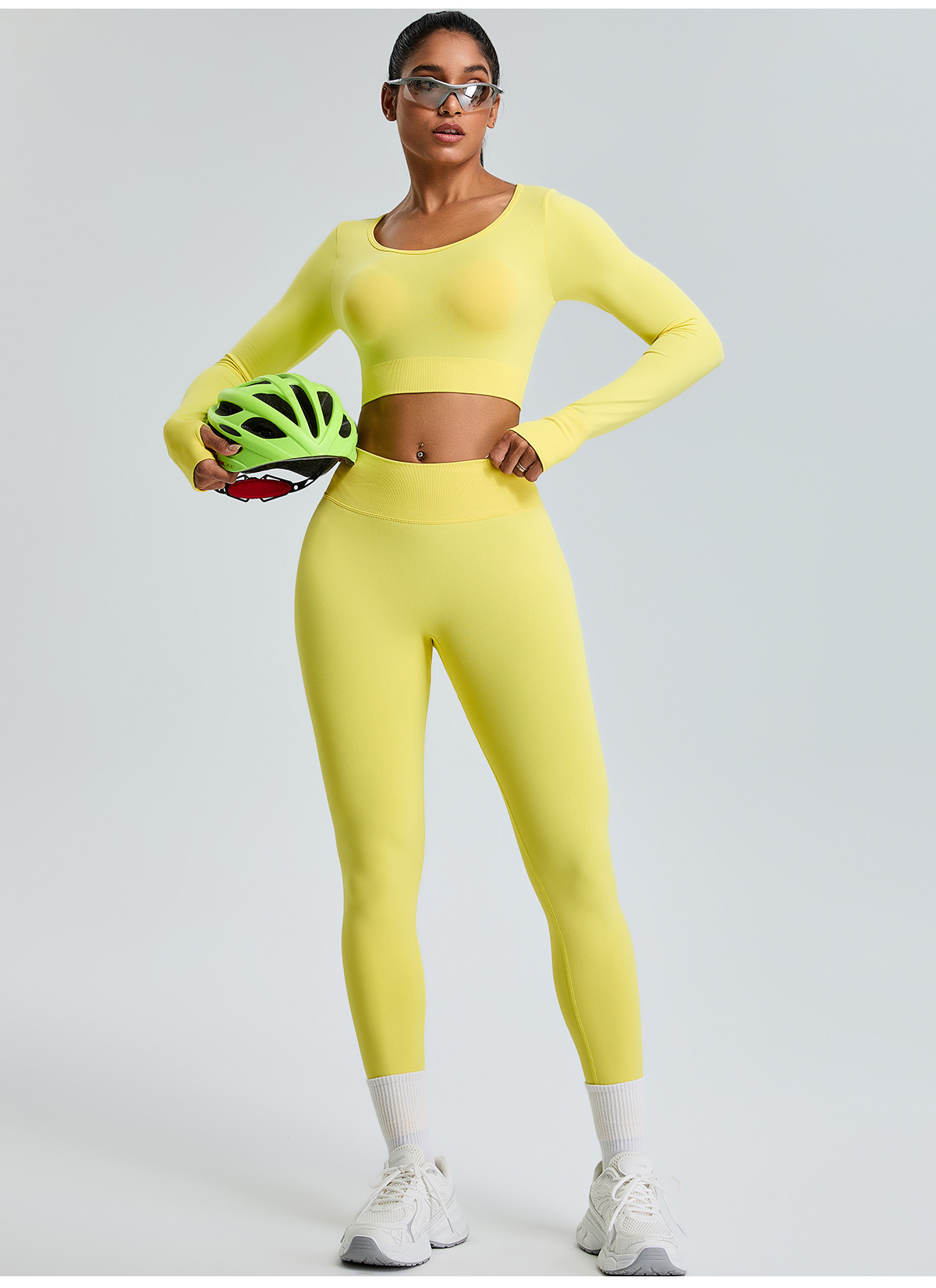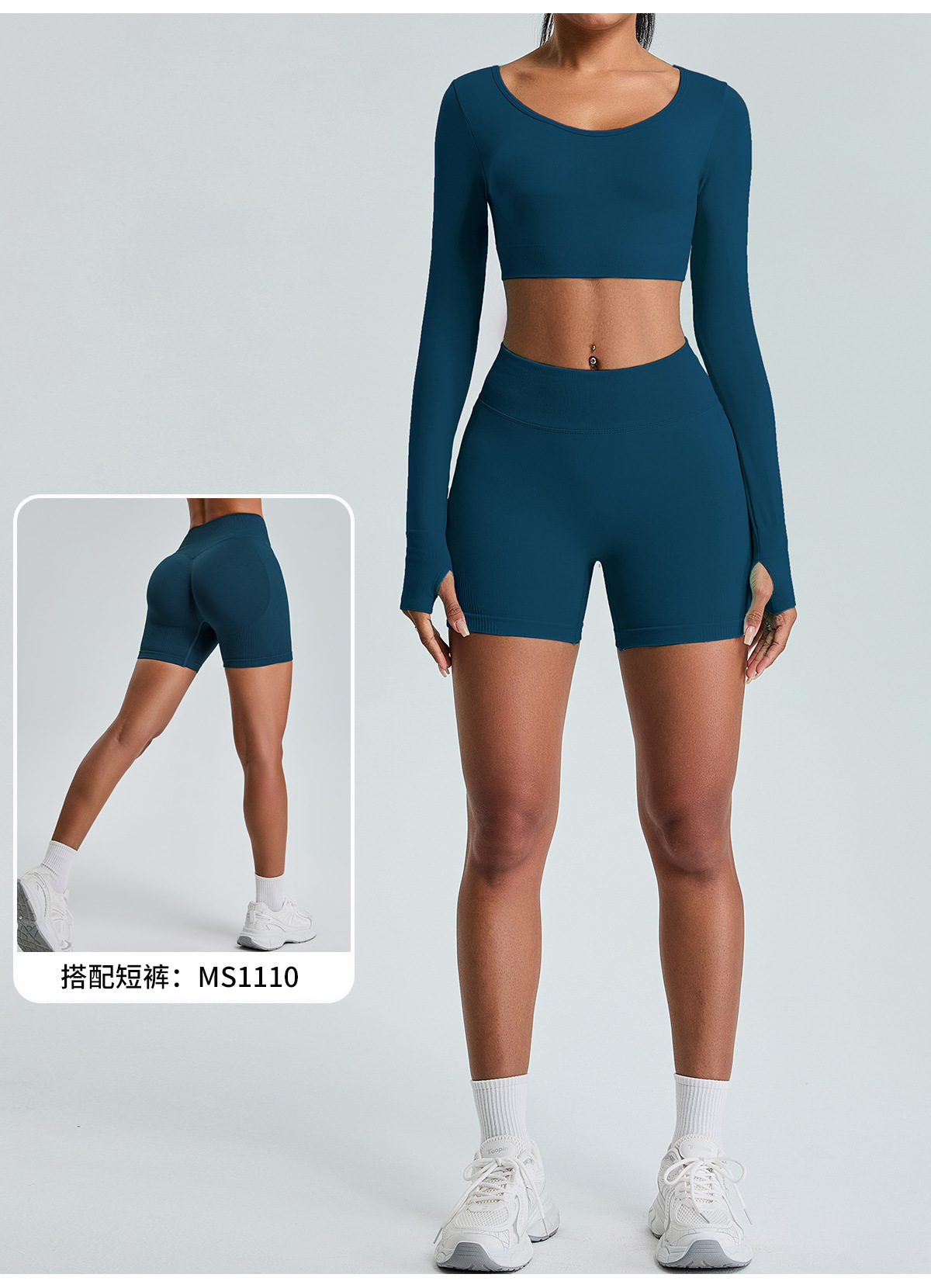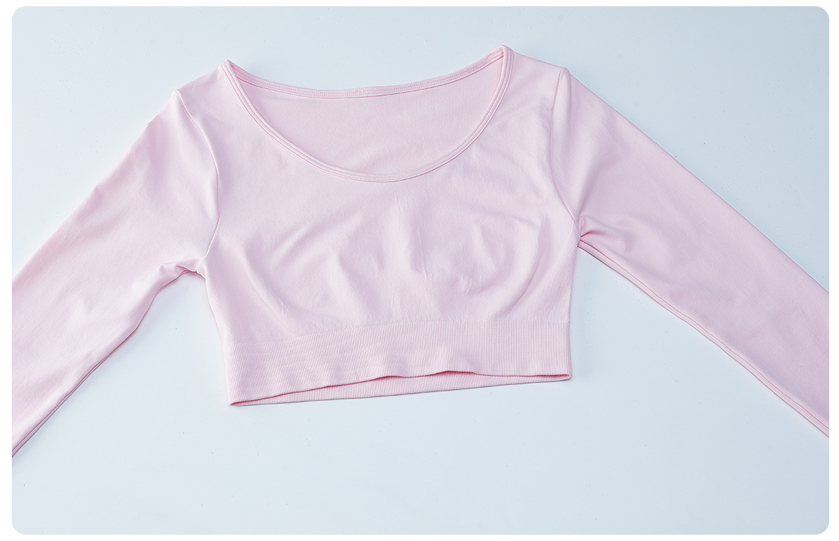 유럽과 미국의 새로운 스타일의 심리스 라운드넥 타이트핏 긴팔 요가탑 여성용 숏탑 허리 노출 속건 스포츠 피트니스웨어