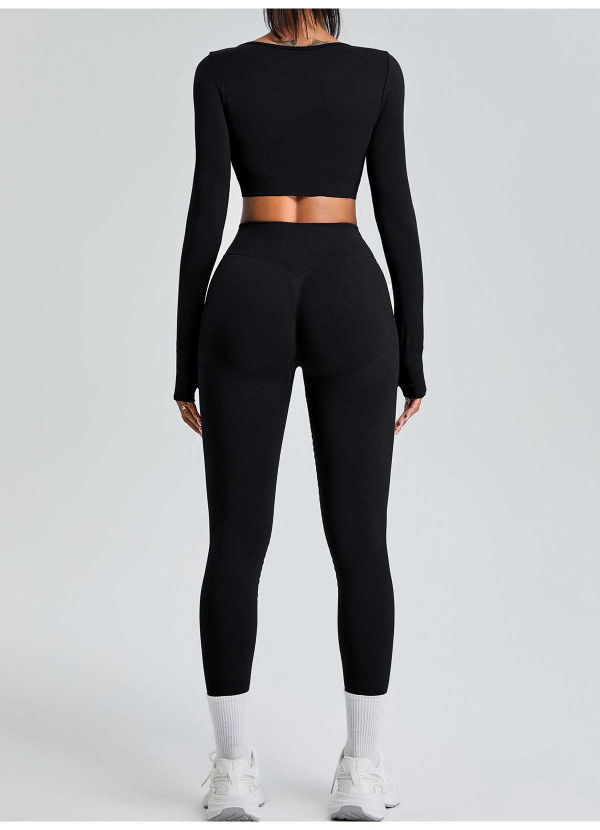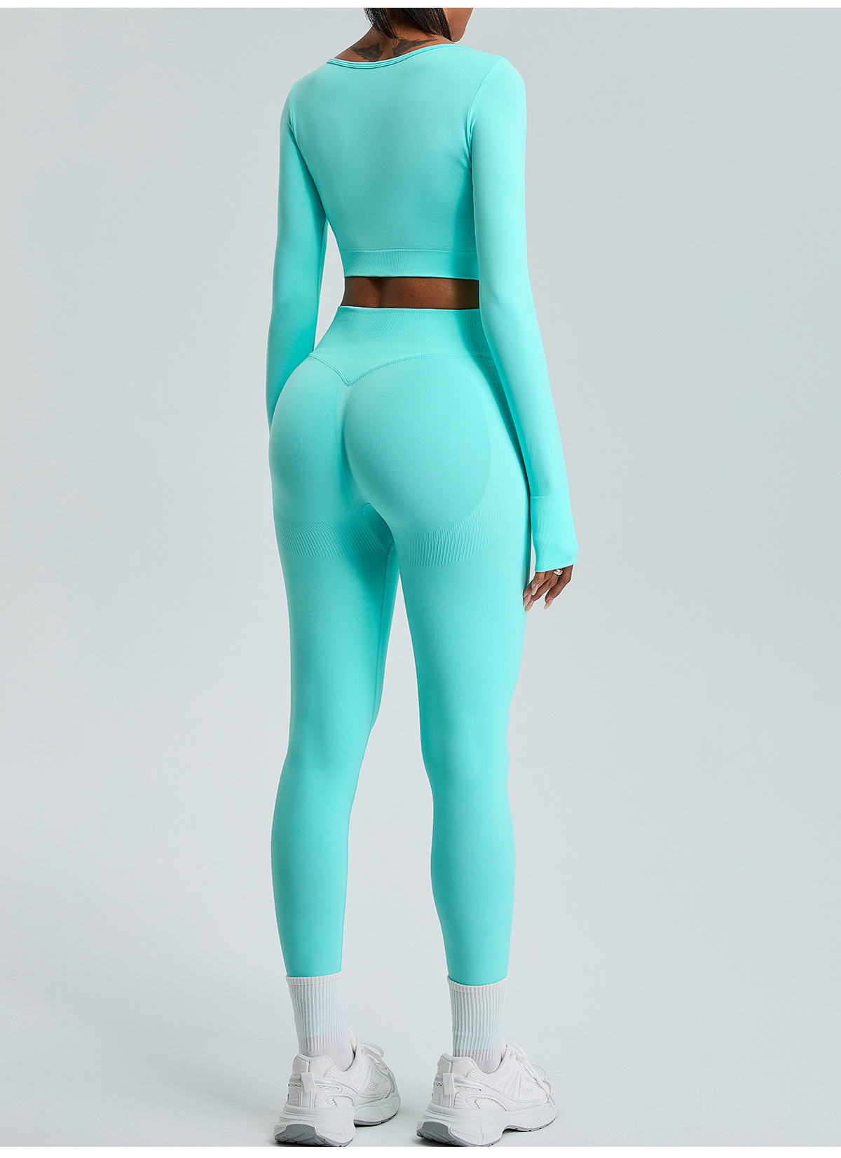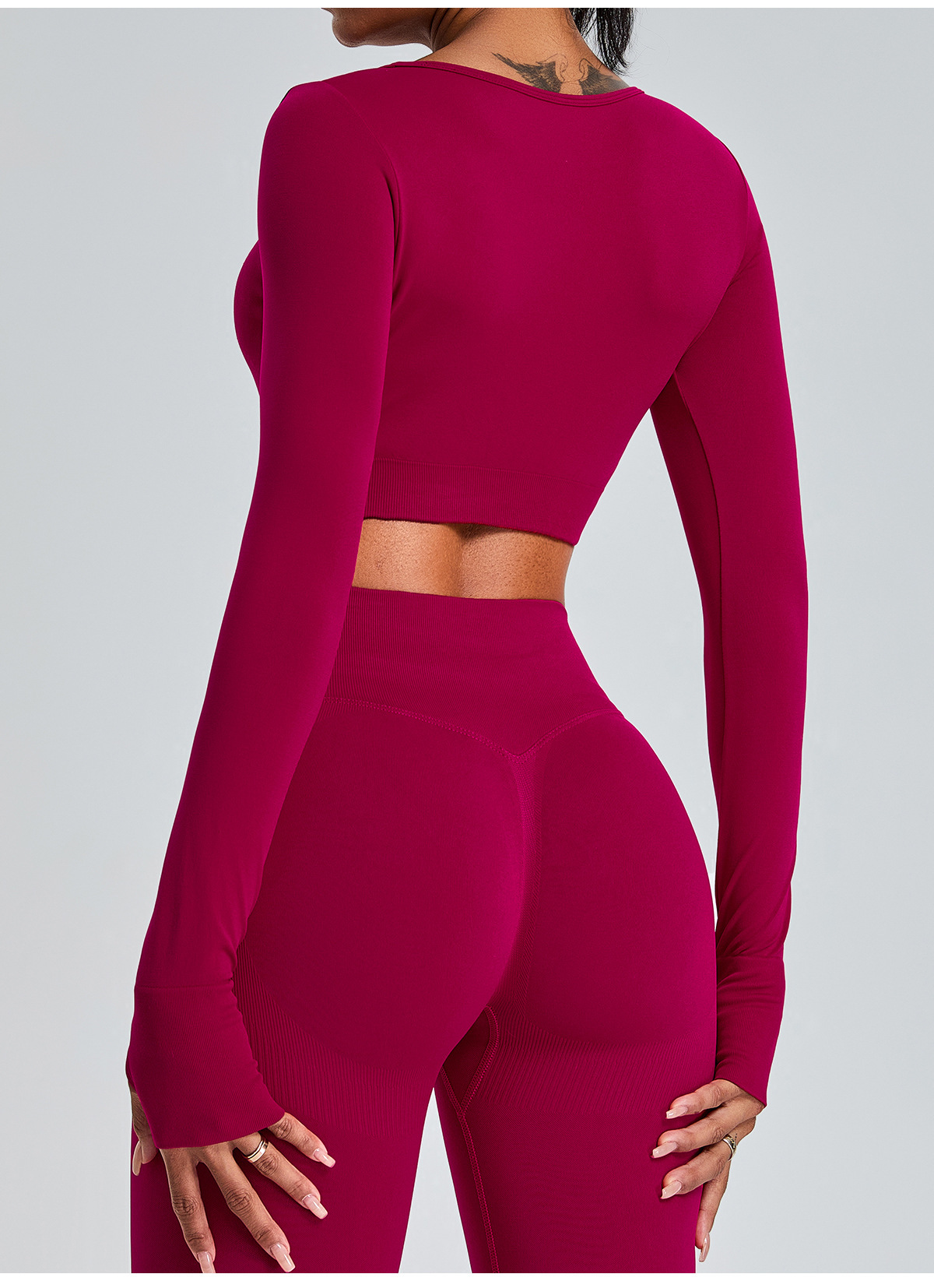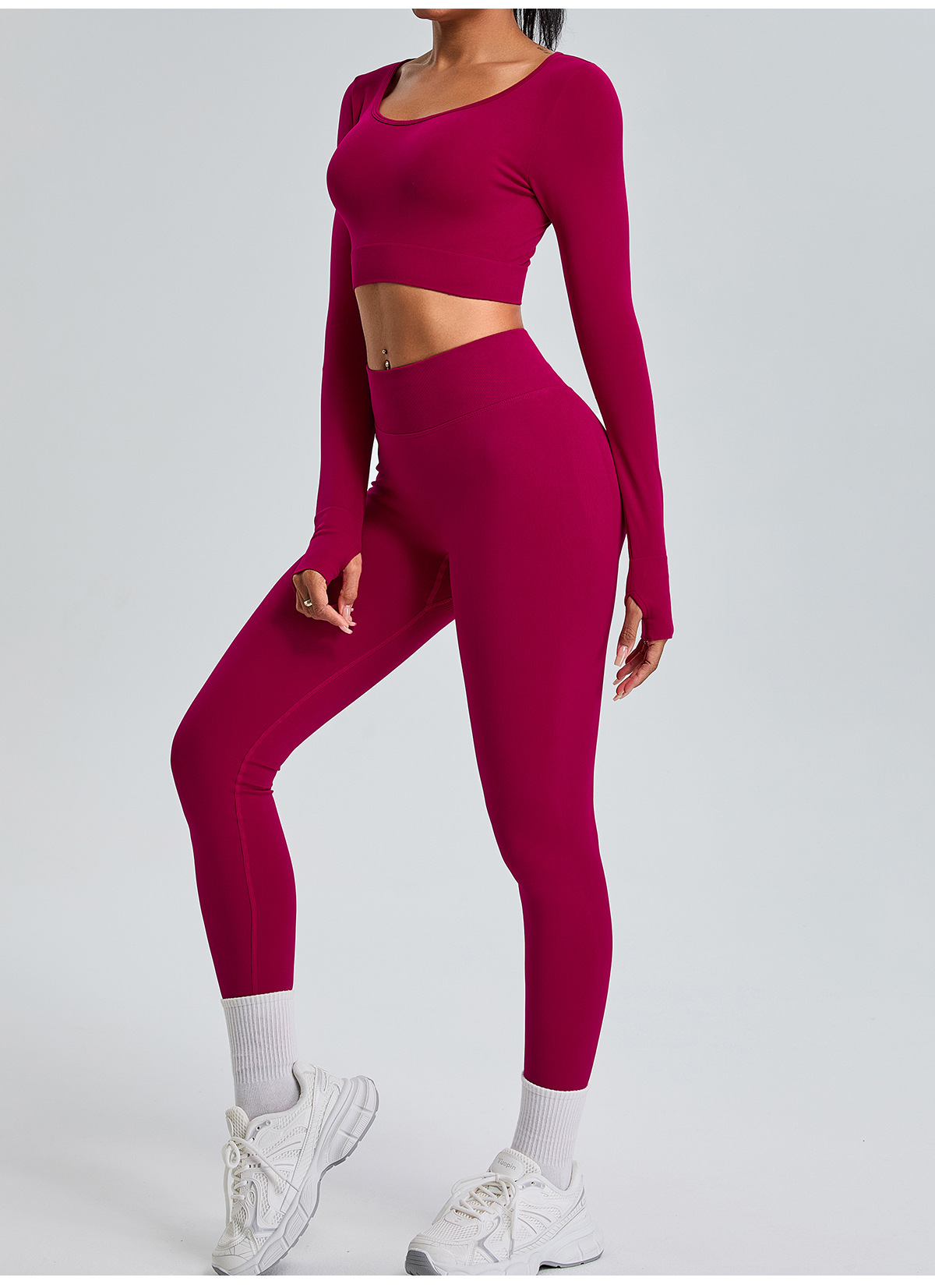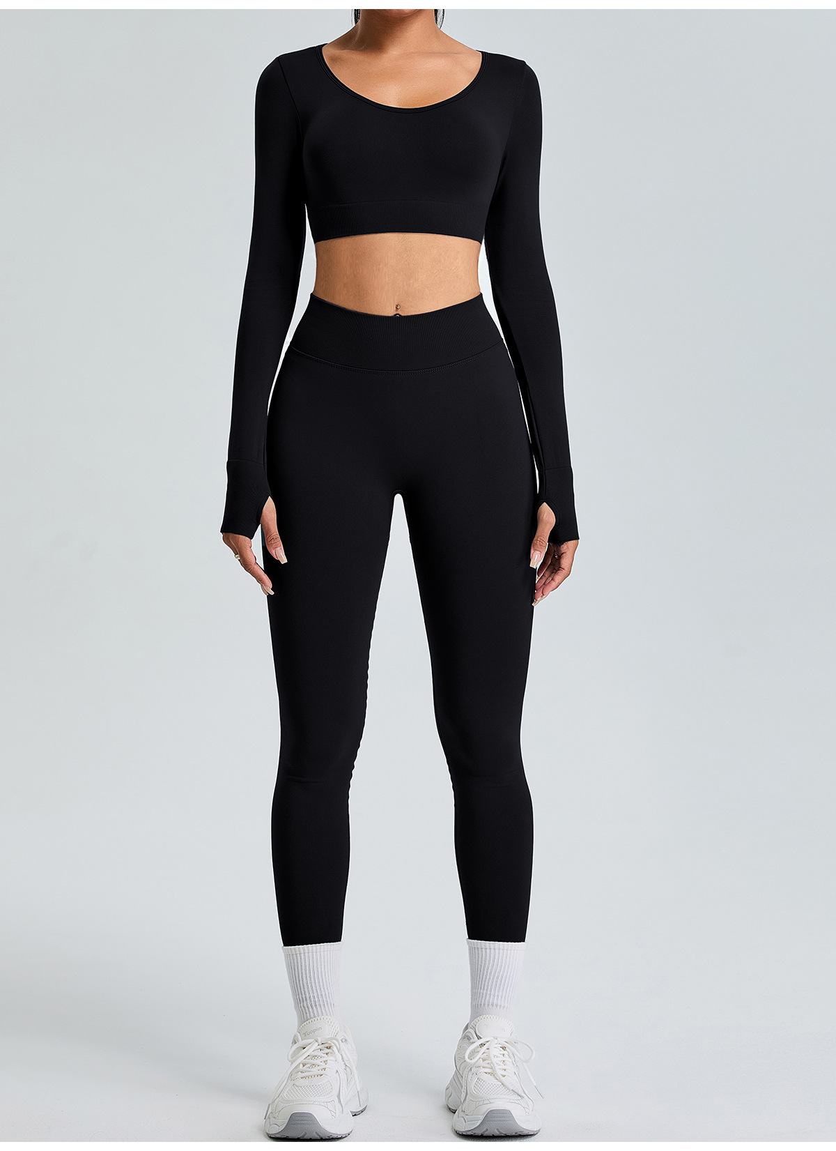 유럽과 미국의 새로운 스타일의 심리스 라운드넥 타이트핏 긴팔 요가탑 여성용 숏탑 허리 노출 속건 스포츠 피트니스웨어