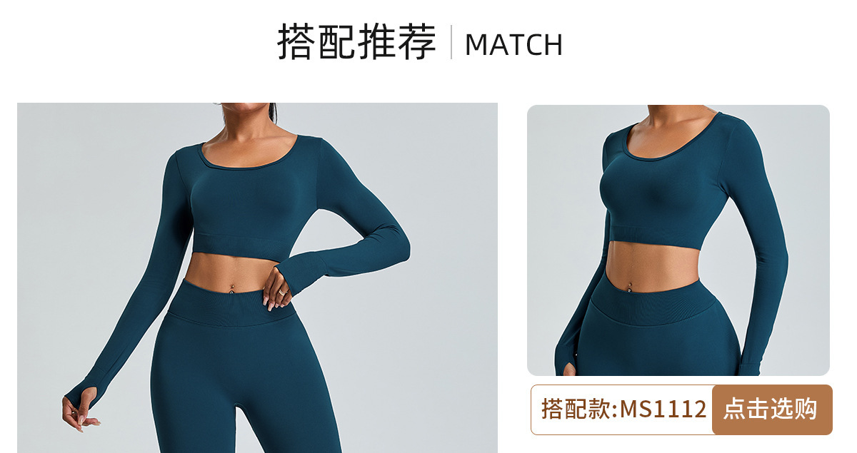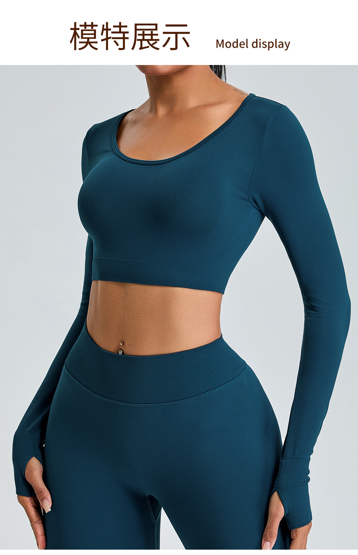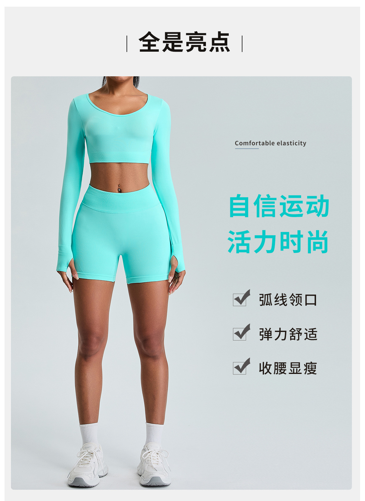 유럽과 미국의 새로운 스타일의 심리스 라운드넥 타이트핏 긴팔 요가탑 여성용 숏탑 허리 노출 속건 스포츠 피트니스웨어스토어 가기