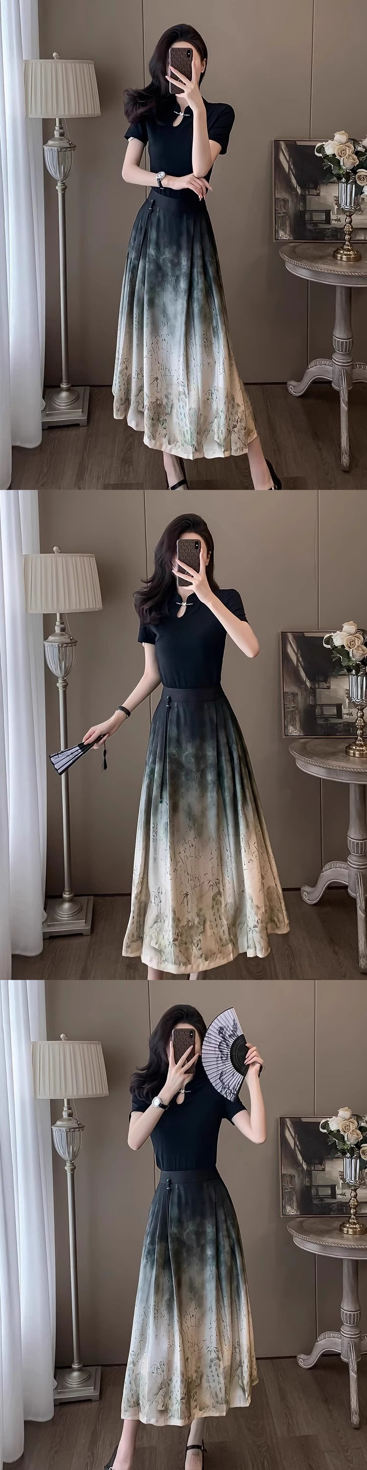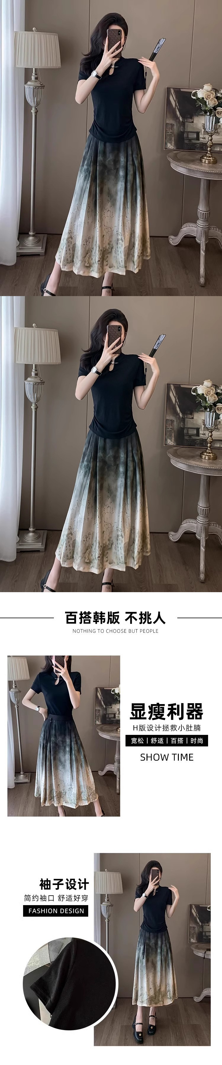 2024년 여름 신작 티셔츠 캐주얼 신상 중국 잉크 말 얼굴 정장 스커트 여성 스커트 패션 투피스 세트스토어 가기