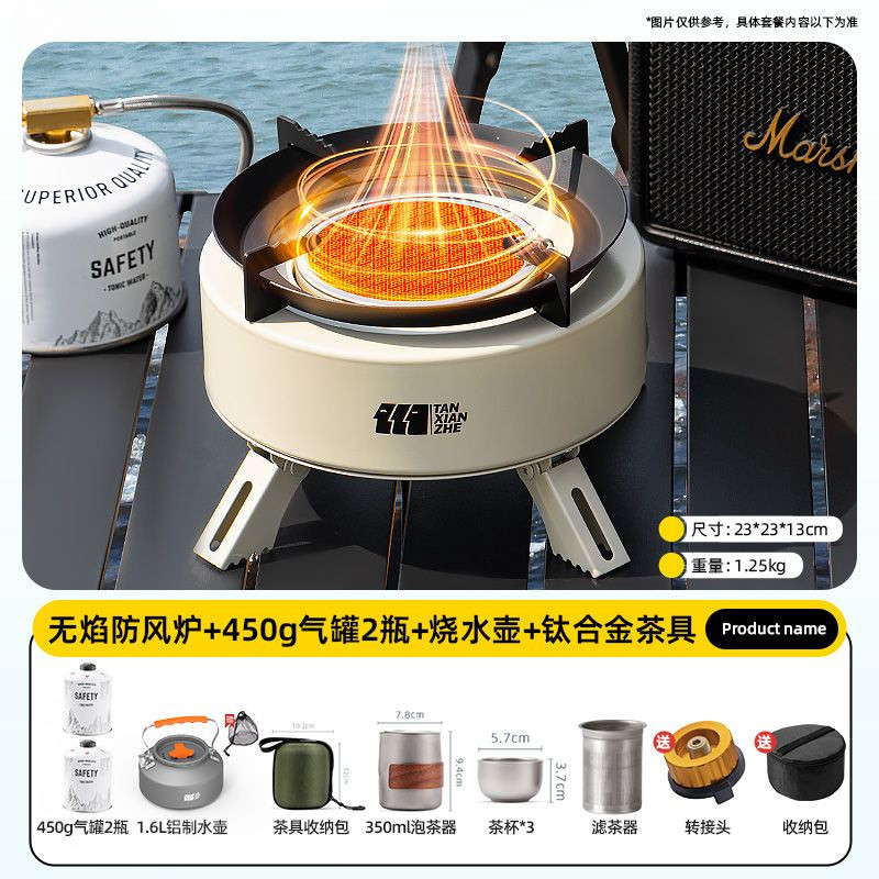 • 무염 방풍 스토브 + 450g 가스 탱크 2병 + 주전자 + 티타늄 차 세트 - 새로 업그레이드된 무염 차 스토브, 모든 시리즈에는 어댑터 및 보관 가방이 함께 제공됩니다.