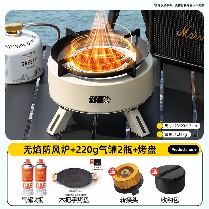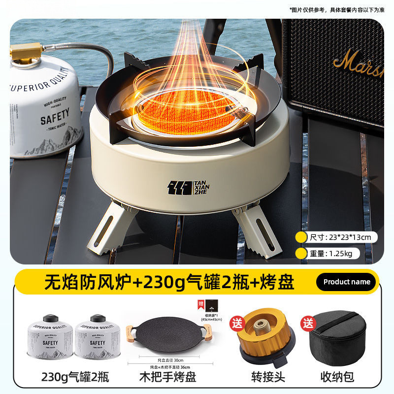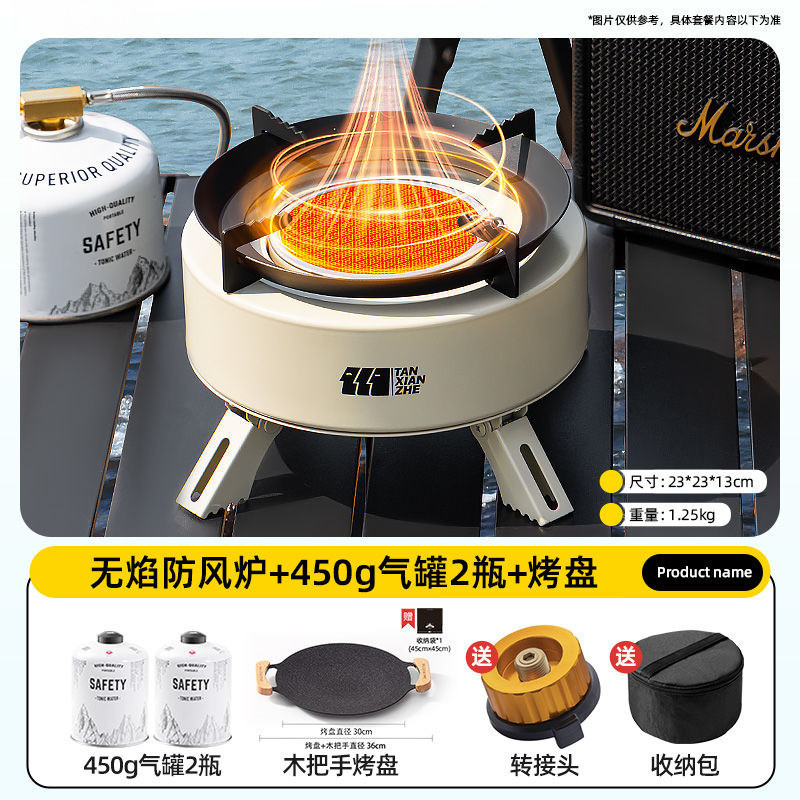 • 무염 방풍 스토브 + 450g 가스 탱크 2병 + 베이킹 팬 - 새로 업그레이드된 무염 차 스토브, 모든 시리즈에는 어댑터 및 보관 가방이 함께 제공됩니다.