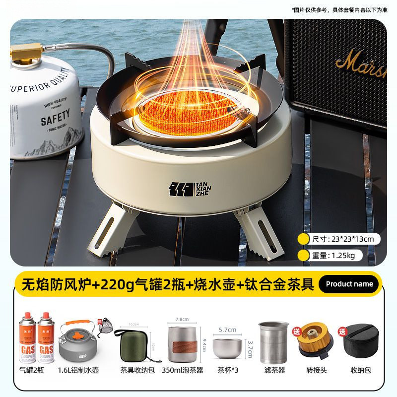 • 무염 방풍 스토브 + 220g 가스 탱크 2병 + 주전자 + 티타늄 차 세트 - 새로 업그레이드된 무염 차 스토브, 모든 시리즈에는 어댑터 및 보관 가방이 함께 제공됩니다.