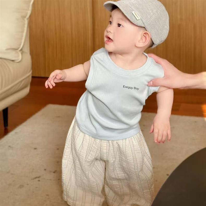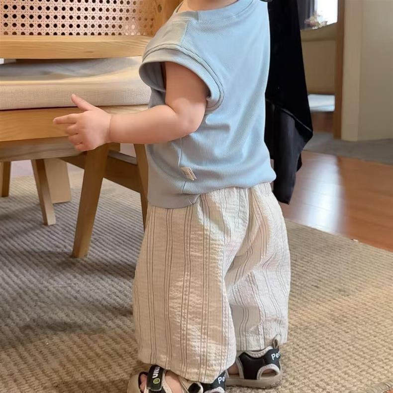 소년과 소녀 여름 얇은 양복 아기 민소매 티셔츠 모기 방지 바지 정장 25 새로운 어린이 조끼 캐주얼 바지