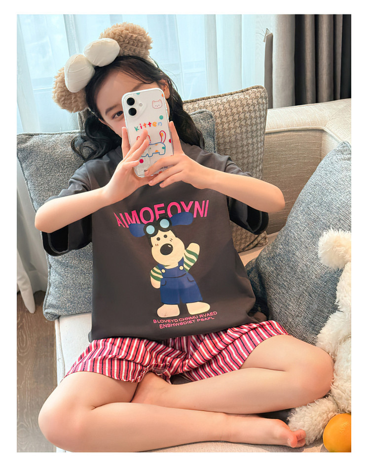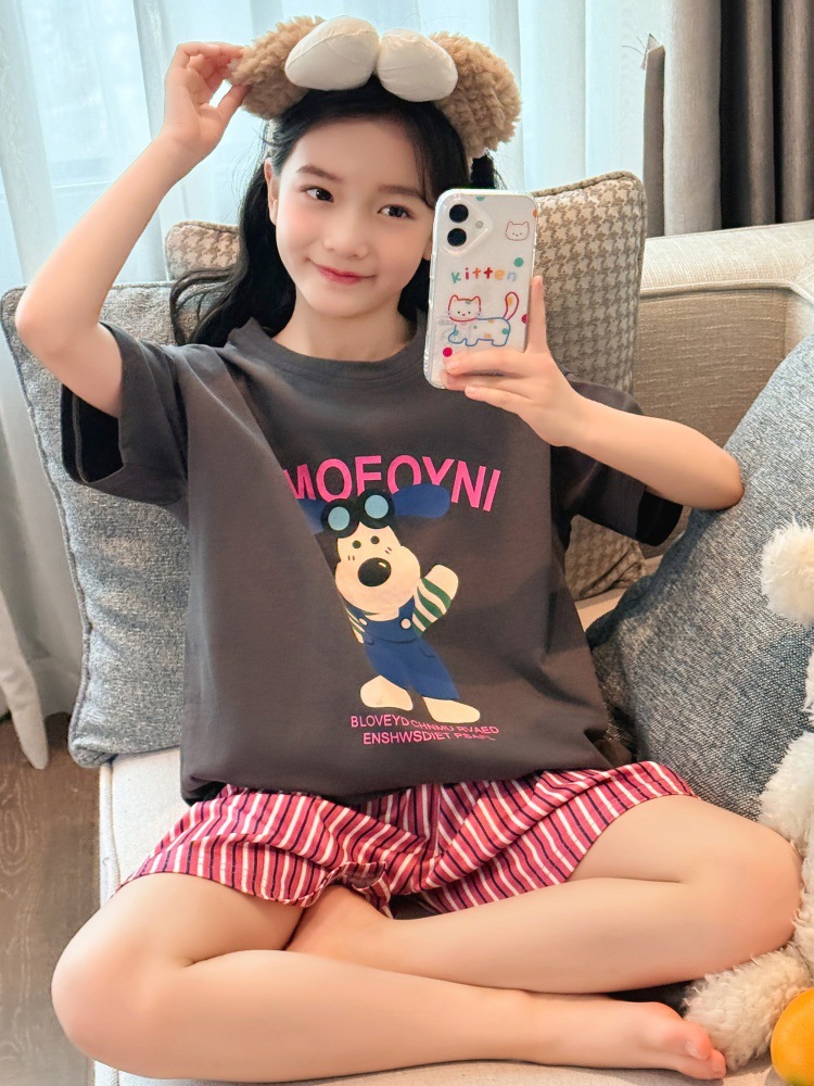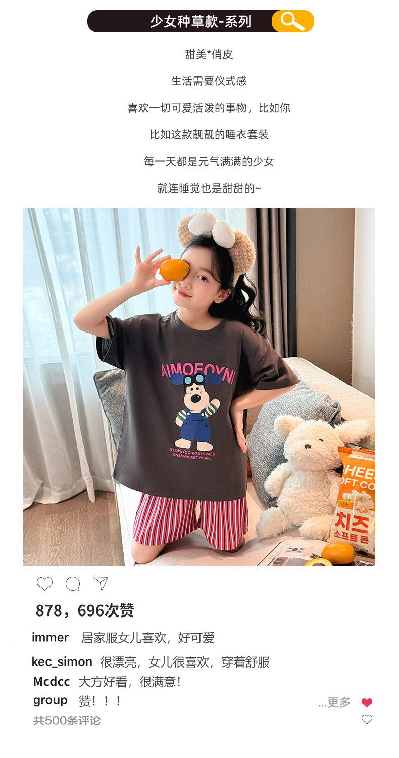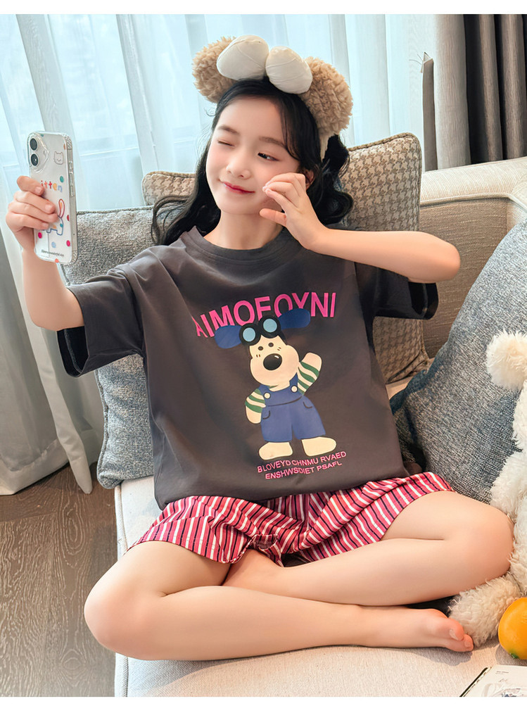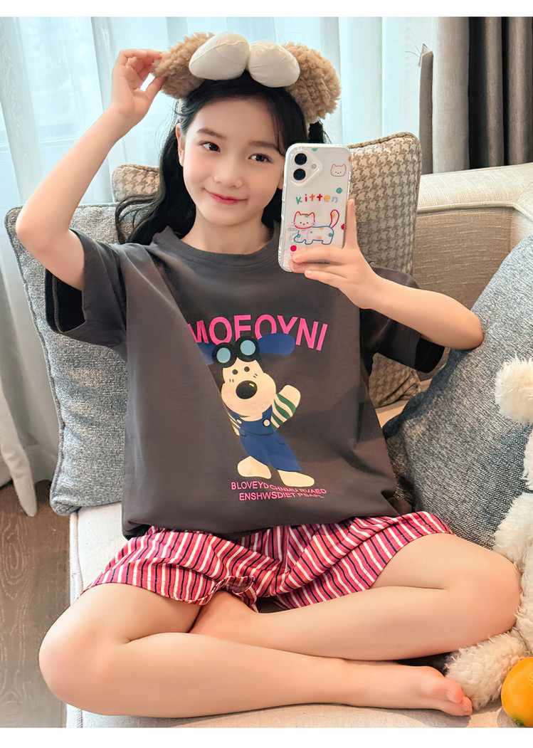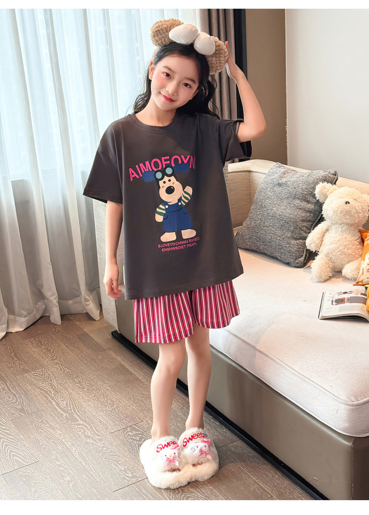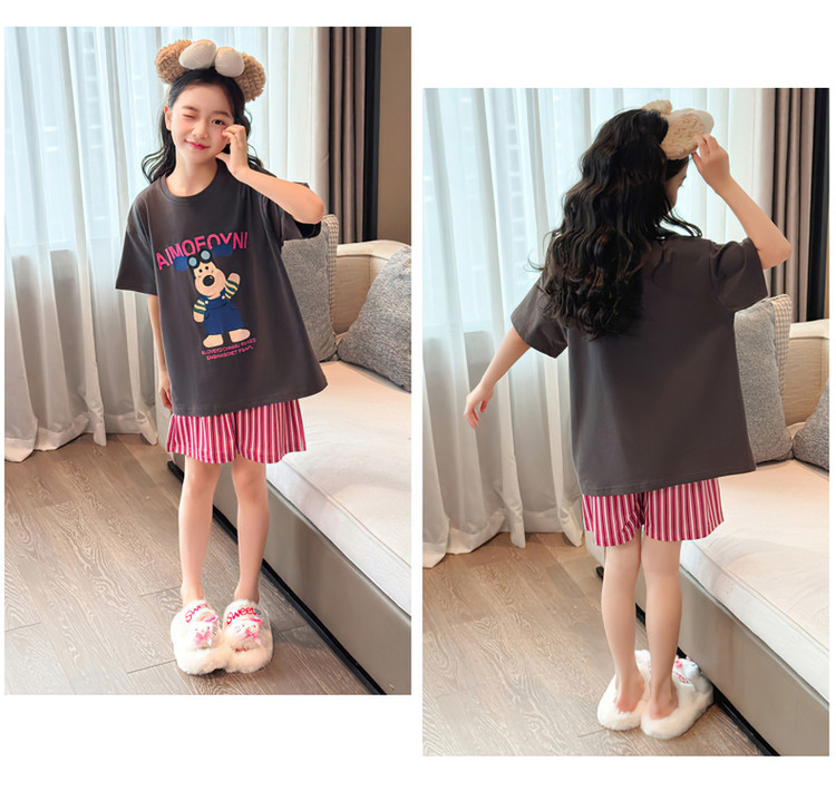 도매 어린이 가정 의류 여름 소녀 반팔 만화 잠옷 잠옷 캐주얼 느슨한 소녀 겉옷 투피스 세트스토어 가기