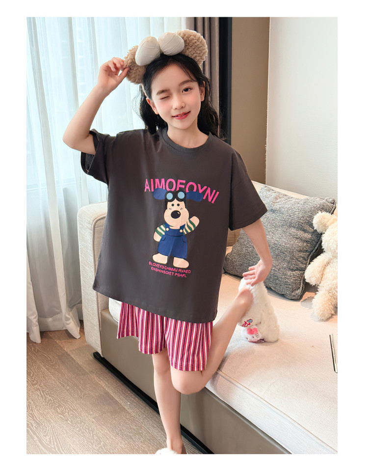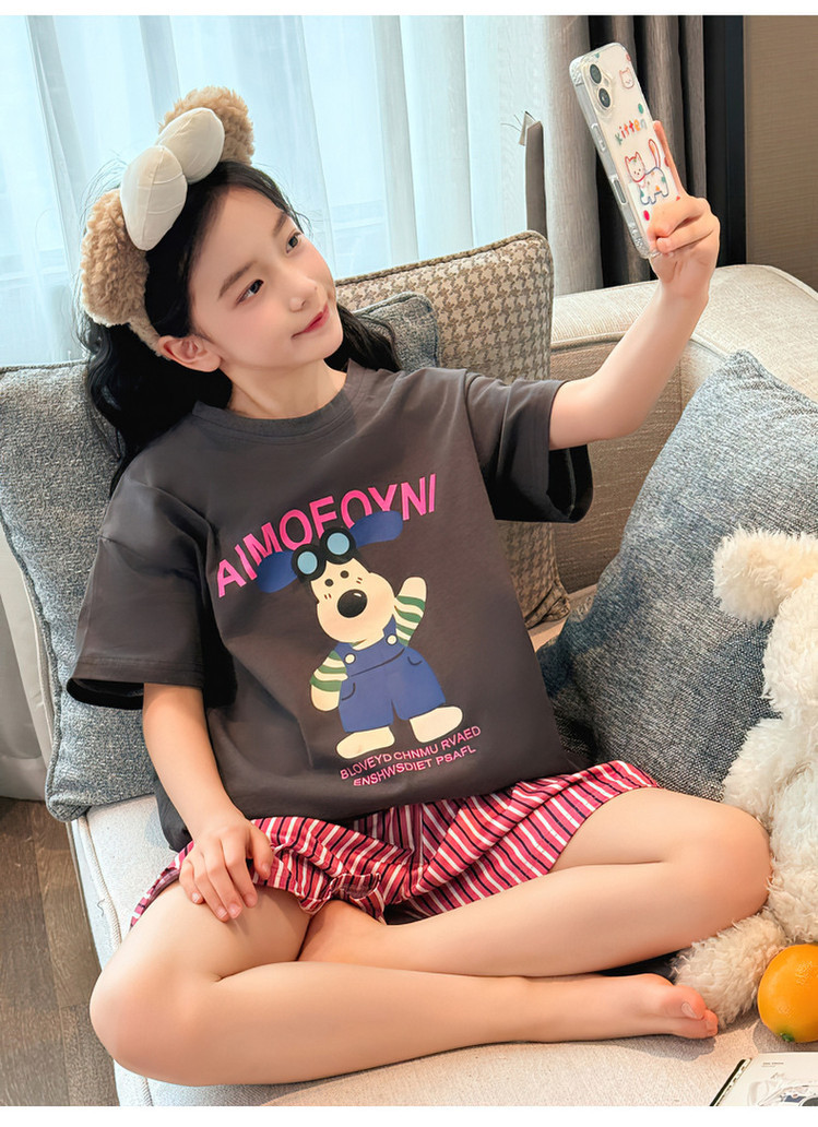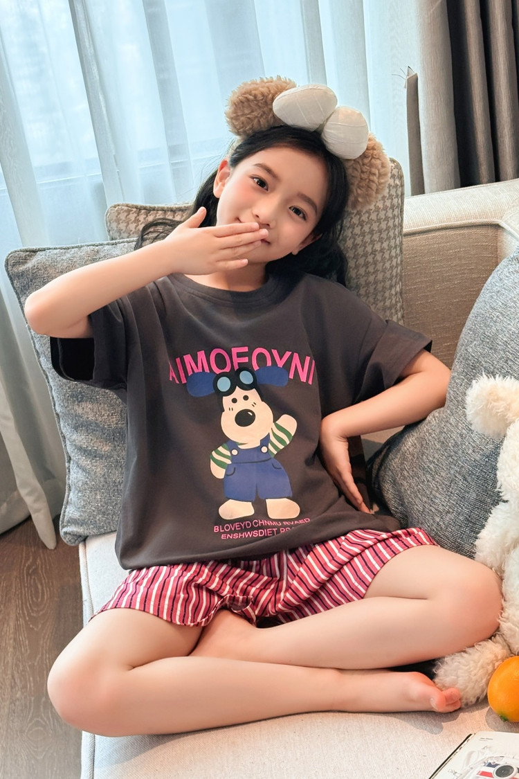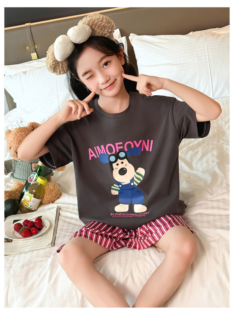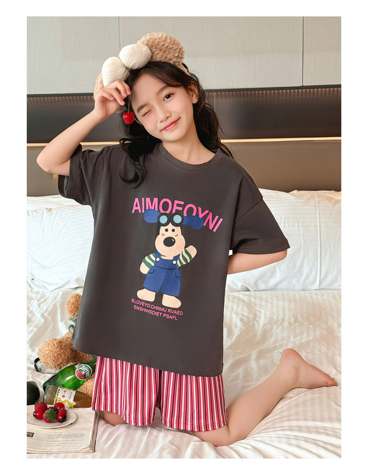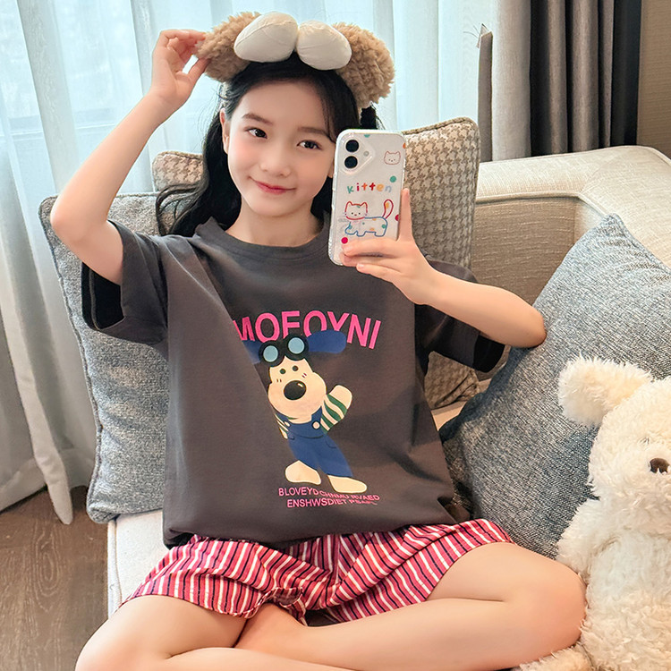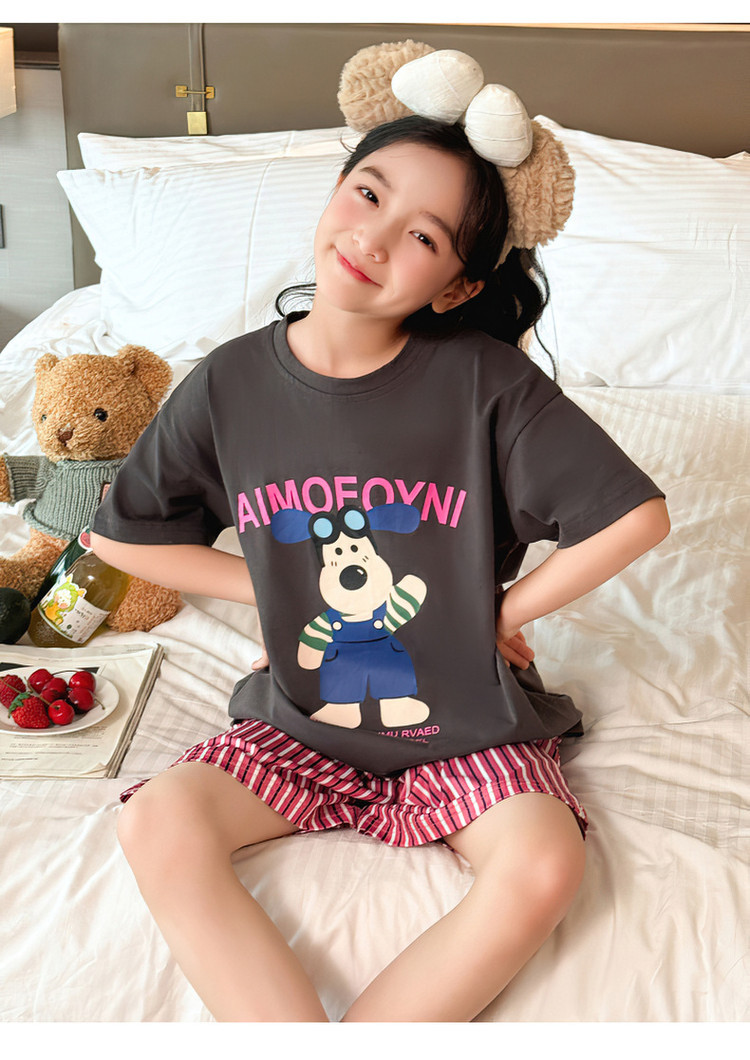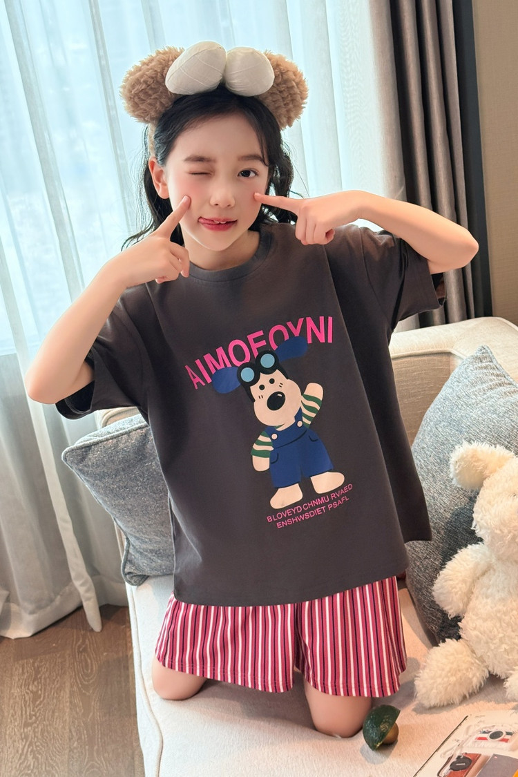 도매 어린이 가정 의류 여름 소녀 반팔 만화 잠옷 잠옷 캐주얼 느슨한 소녀 겉옷 투피스 세트스토어 가기
