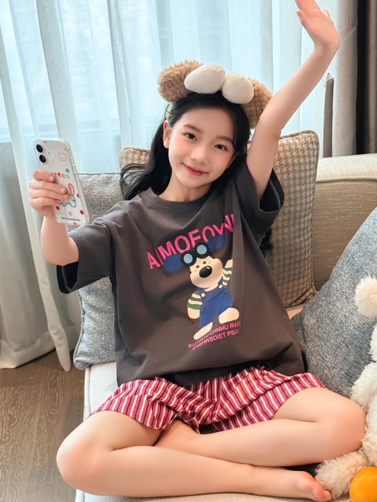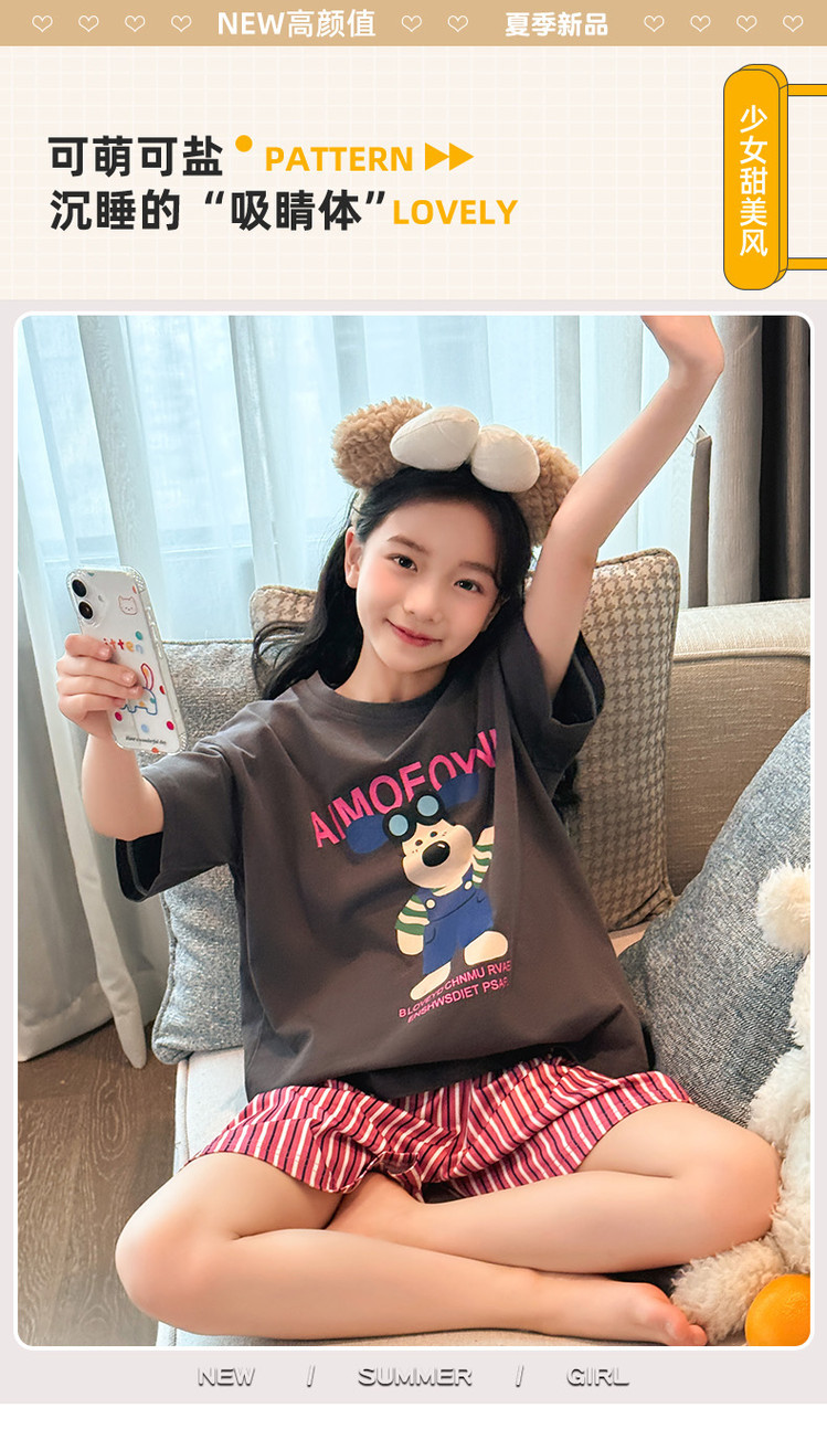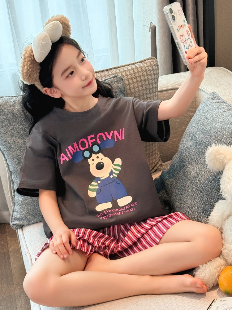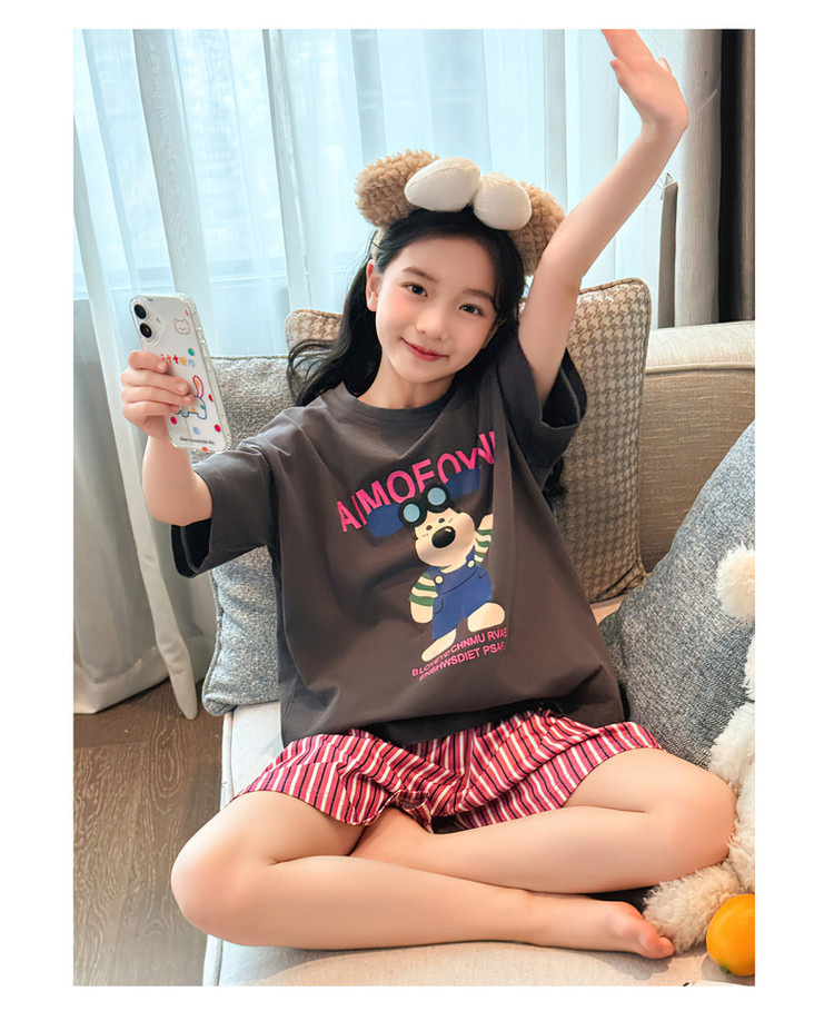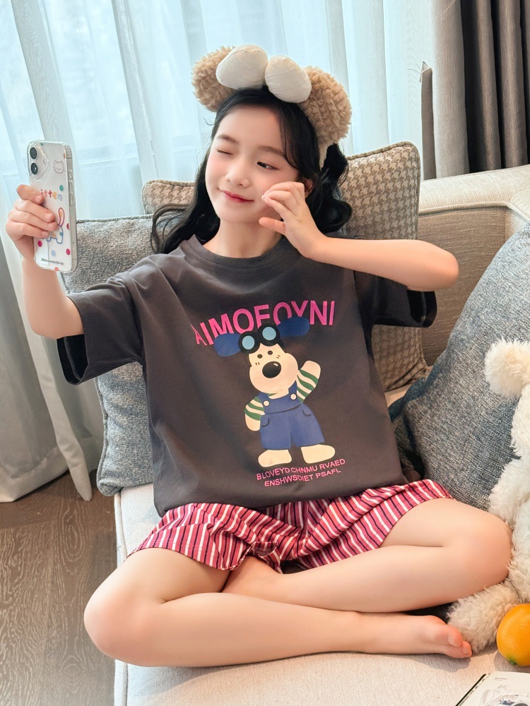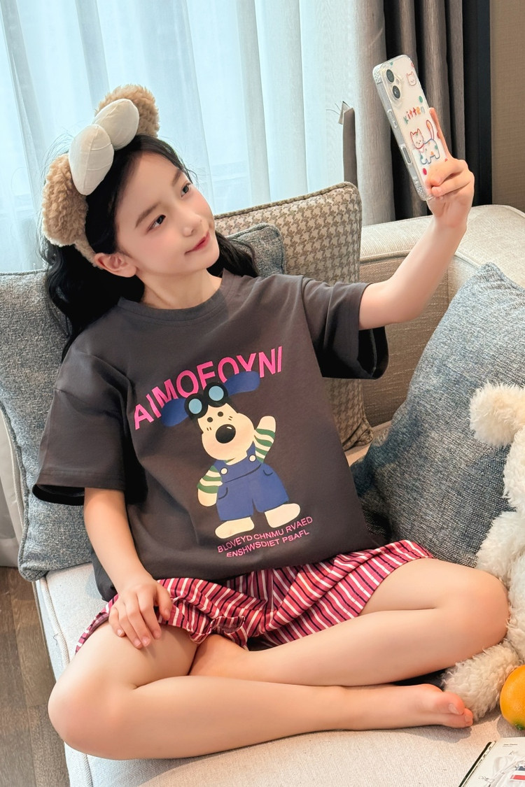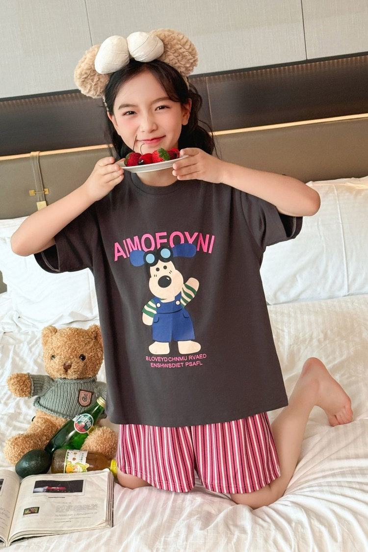 도매 어린이 가정 의류 여름 소녀 반팔 만화 잠옷 잠옷 캐주얼 느슨한 소녀 겉옷 투피스 세트스토어 가기