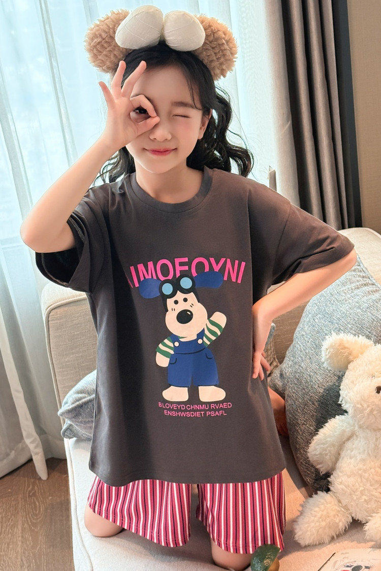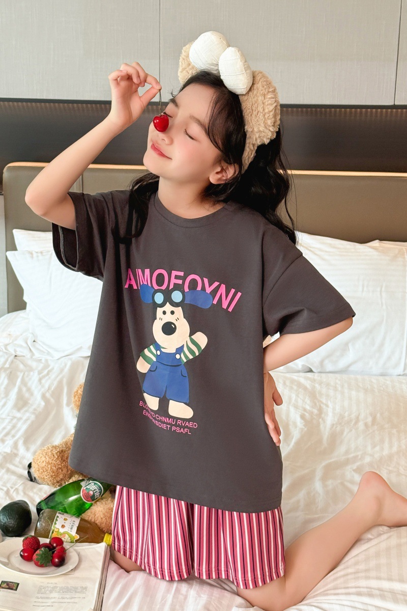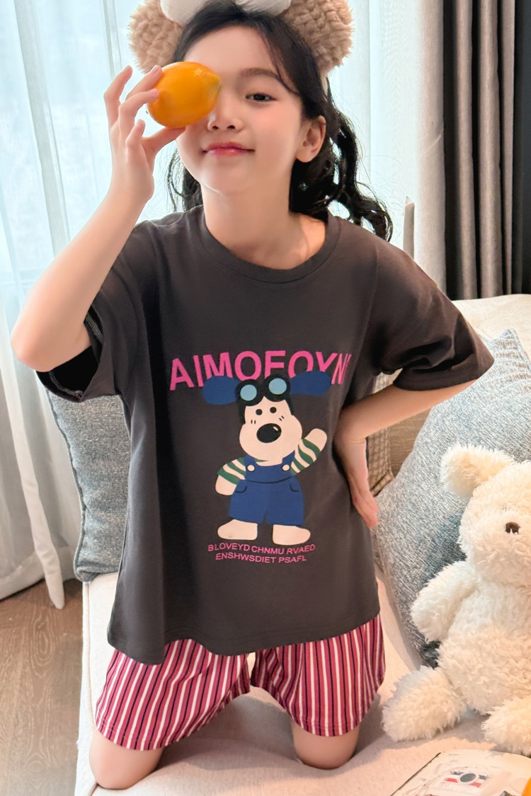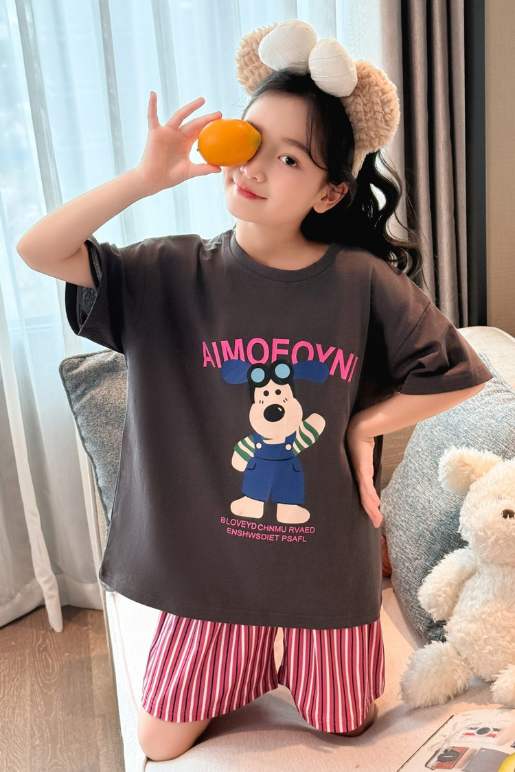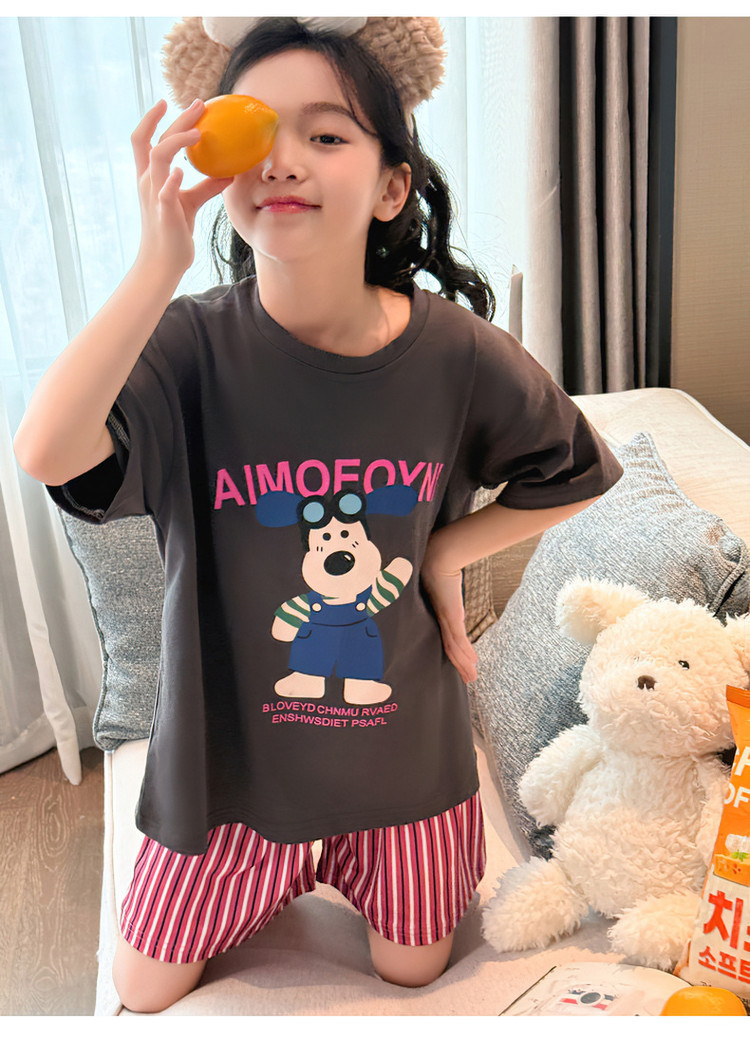도매 어린이 가정 의류 여름 소녀 반팔 만화 잠옷 잠옷 캐주얼 느슨한 소녀 겉옷 투피스 세트